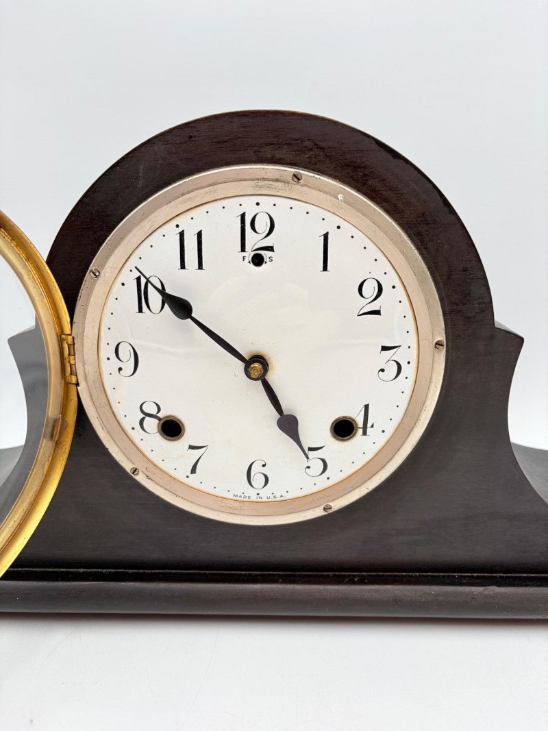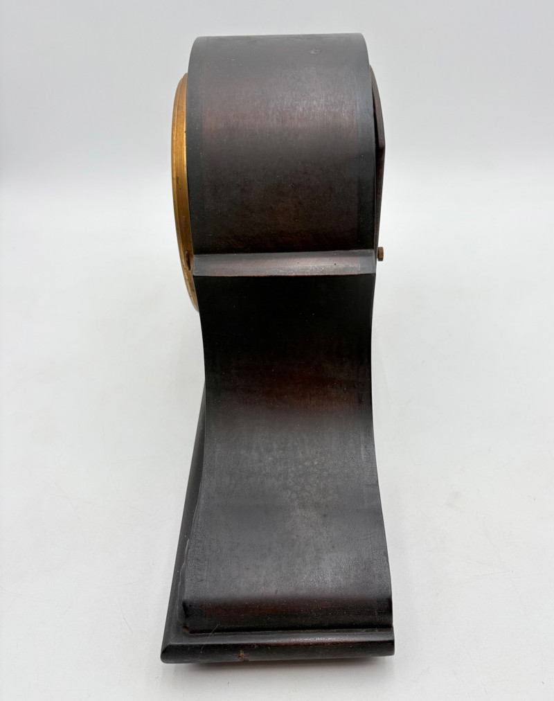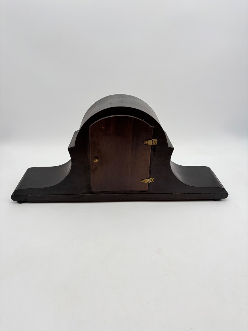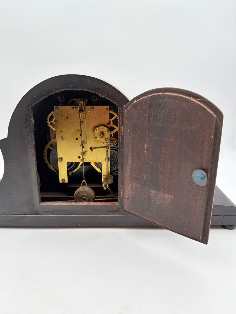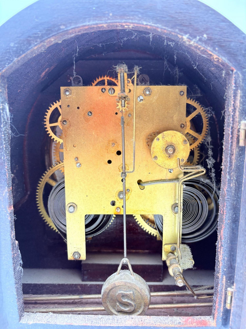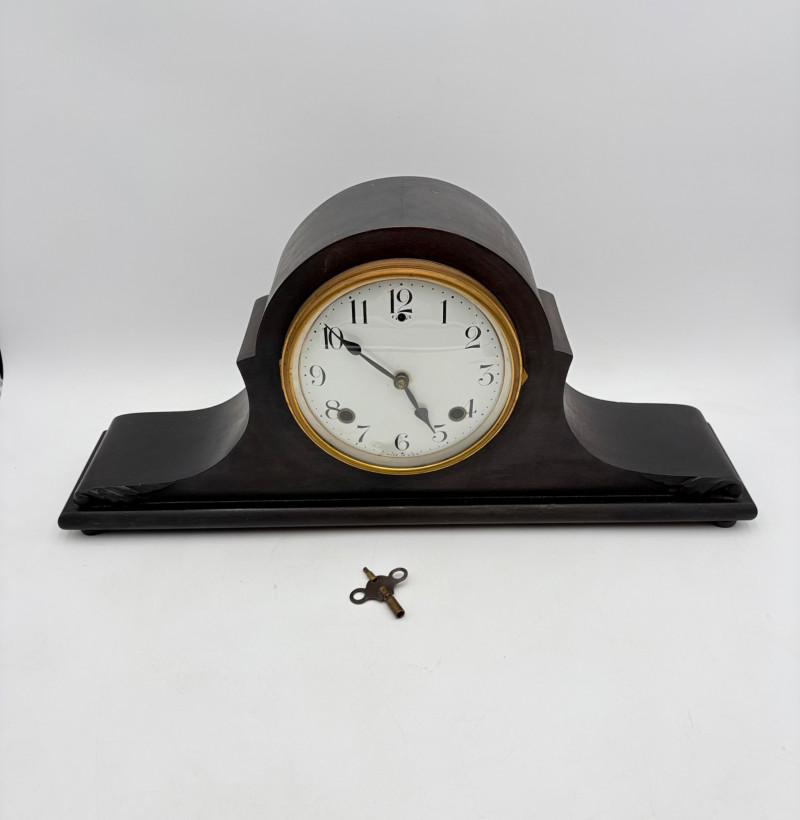 Lovely antique mantel clock in beautiful dark wood finish. Napoleon hat design is sleek with just a small bit of detail carving at the outside of the base (see last detail photo). Original key is included. Made in the USA, but no maker mark except for an "S" on the internal pendulum which leads us to believe this is a Sessions clock - the company that took over EN Welch early in the last century. We are guessing this clock is from the early to mid 1900s. Currently not working - needs a tune-up/dust removed.