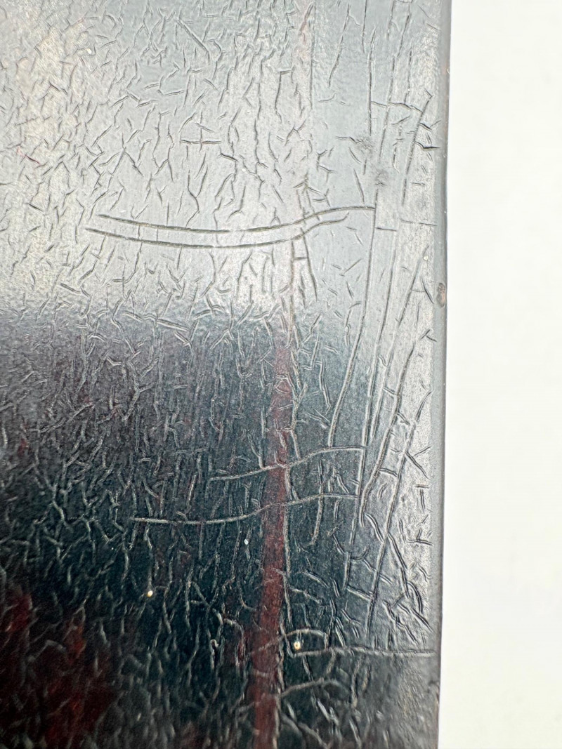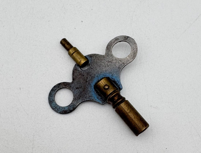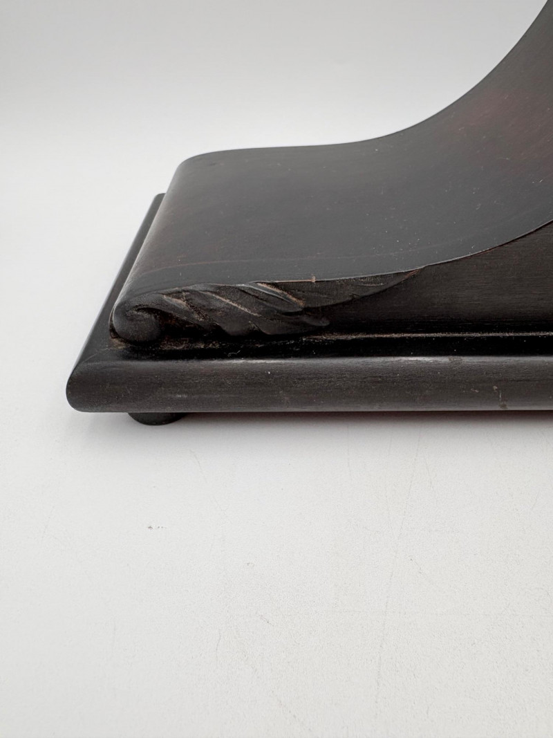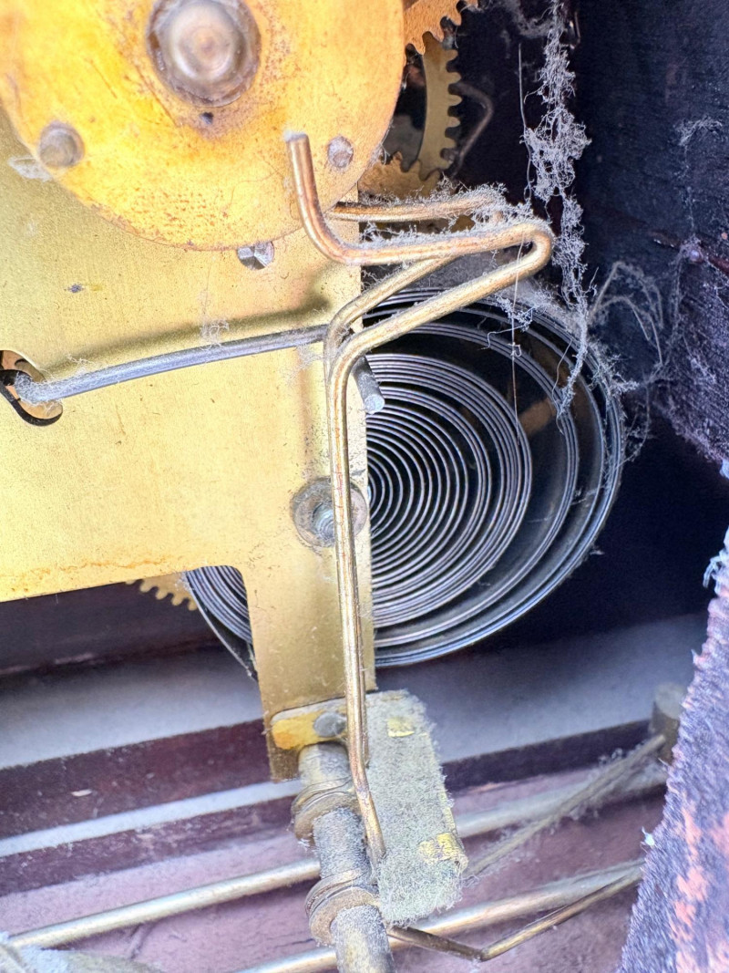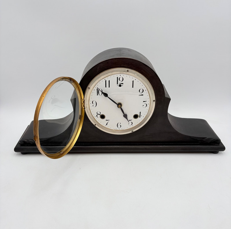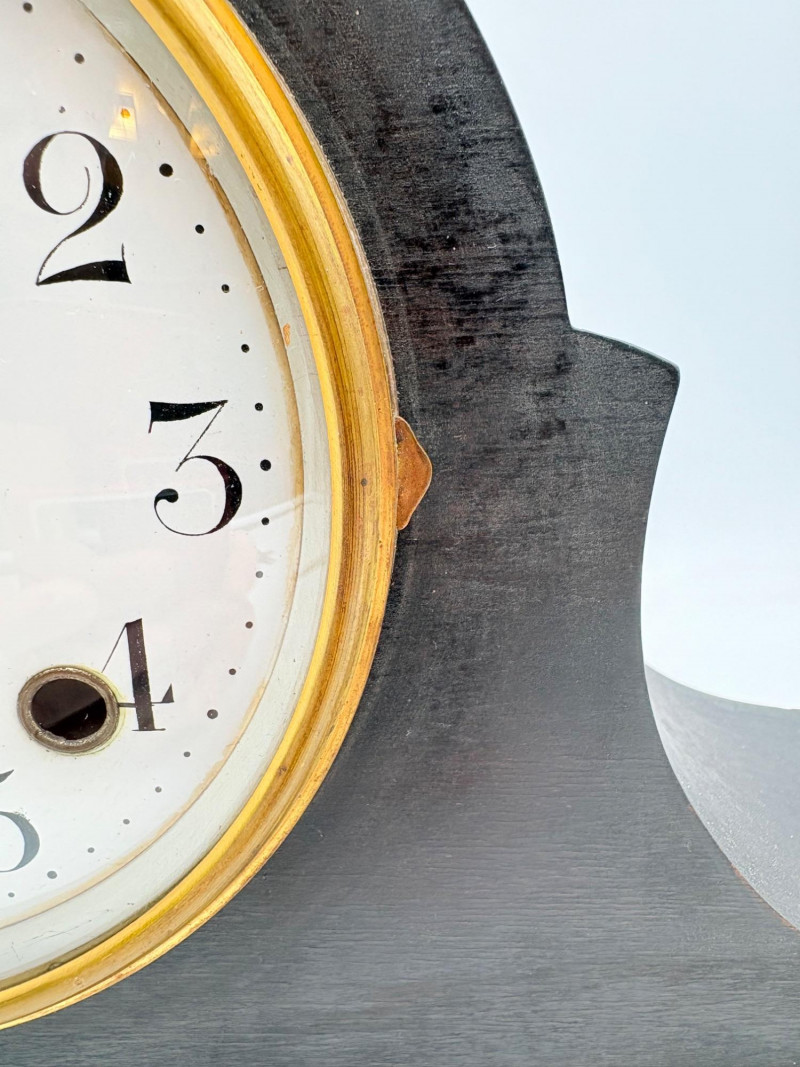 Lovely antique mantel clock in beautiful dark wood finish. Napoleon hat design is sleek with just a small bit of detail carving at the outside of the base (see last detail photo). Original key is included. Made in the USA, but no maker mark except for an "S" on the internal pendulum which leads us to believe this is a Sessions clock - the company that took over EN Welch early in the last century. We are guessing this clock is from the early to mid 1900s. Currently not working - needs a tune-up/dust removed.