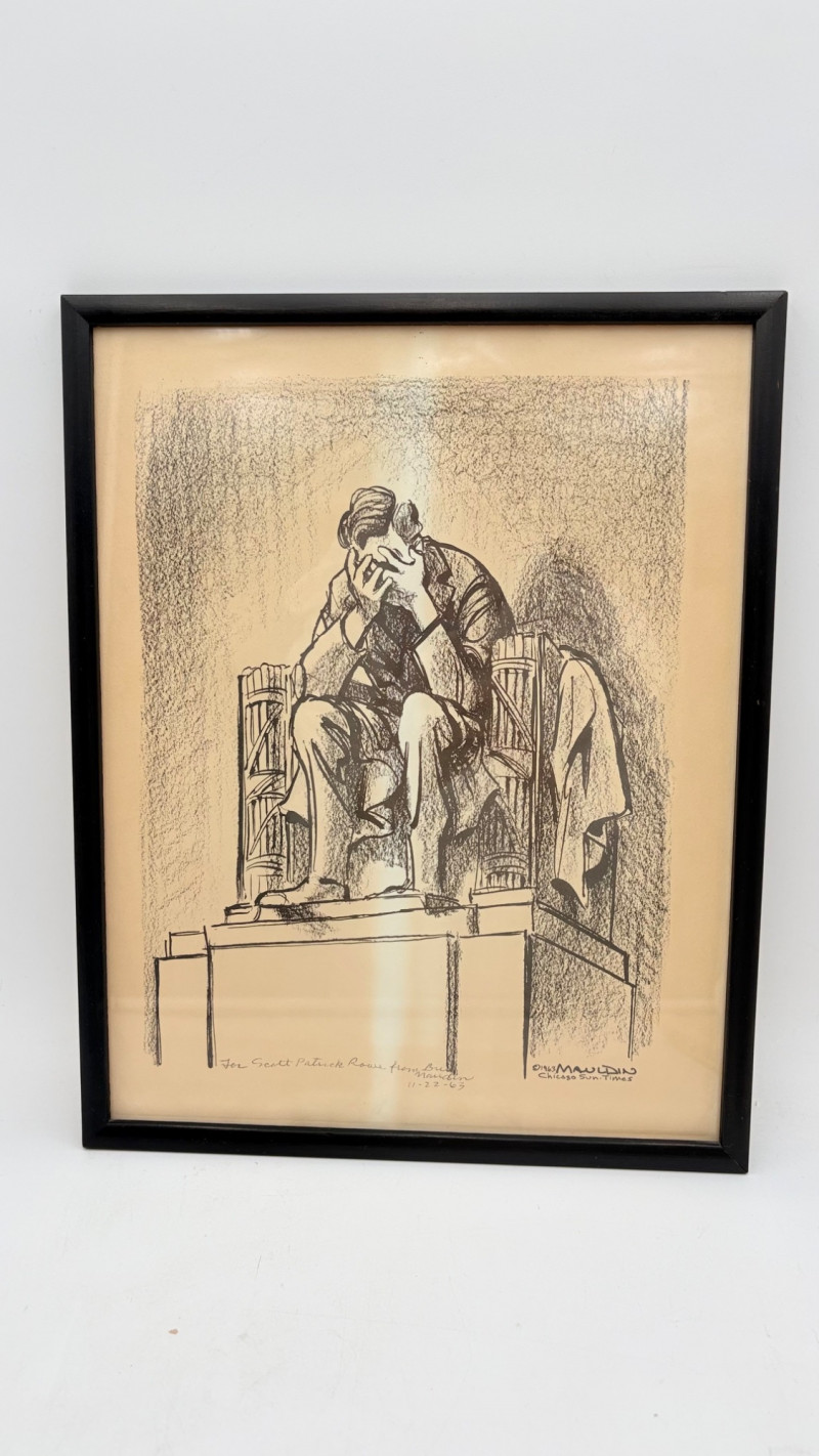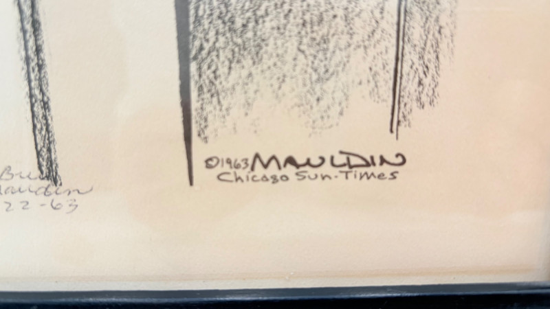 Best known as the author of the WWII cartoon books "Up Front", Bill Mauldin won 2 Pulitzer Prizes for his work - work for which General Patton threatened to throw him in jail... The first Pulitzer was for Mauldin's depiction of life as a solder during the war in 1945. He won his second Pulitzer in 1963 for the image in this lot which was drawn after the assassination of President Kennedy (it strangely feels relevant today for other reasons). This copy of the cartoon was given to our client's family member by Mauldin as noted in the inscription; our client used to write for the Chicago Sun-Times so we are sure he and Mauldin were friendly. We believe someone in the client's family - not Mauldin - noted who the gift was to/from as Mauldin's name is misspelled in the inscription. The cartoon measures 14.5" H x 11.5" W. There is a pale white streak down the middle of the cartoon from sun exposure over the years of display. On the off-chance you are unfamiliar with Mauldin, we are including a copy of his "Up Front" cartoon book to complete this lot. Up Front (Bill Mauldin) 1945. Henry Holt & Company, New York. 228 p. Kennedy