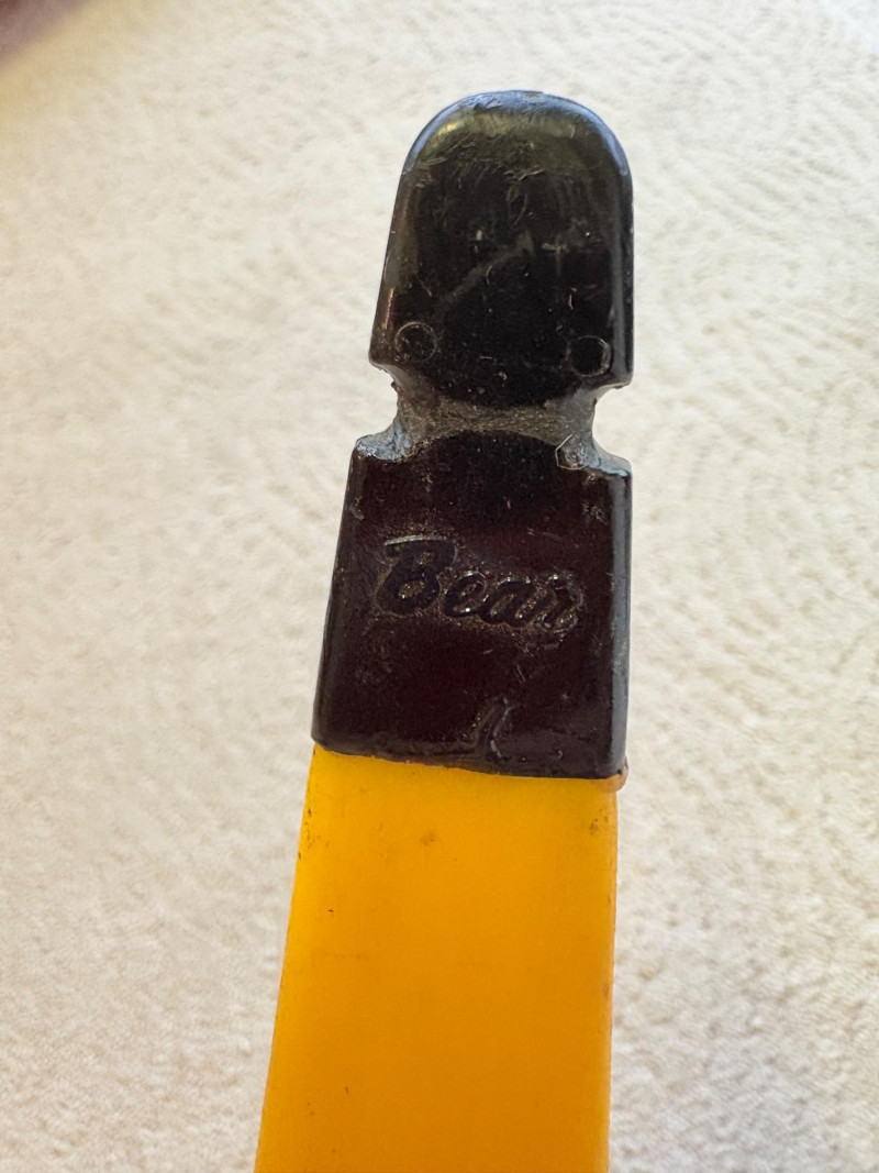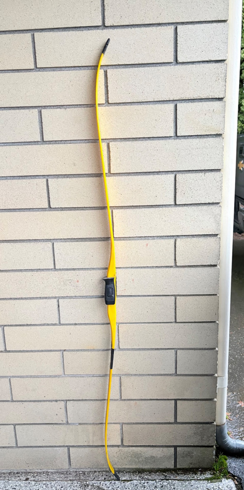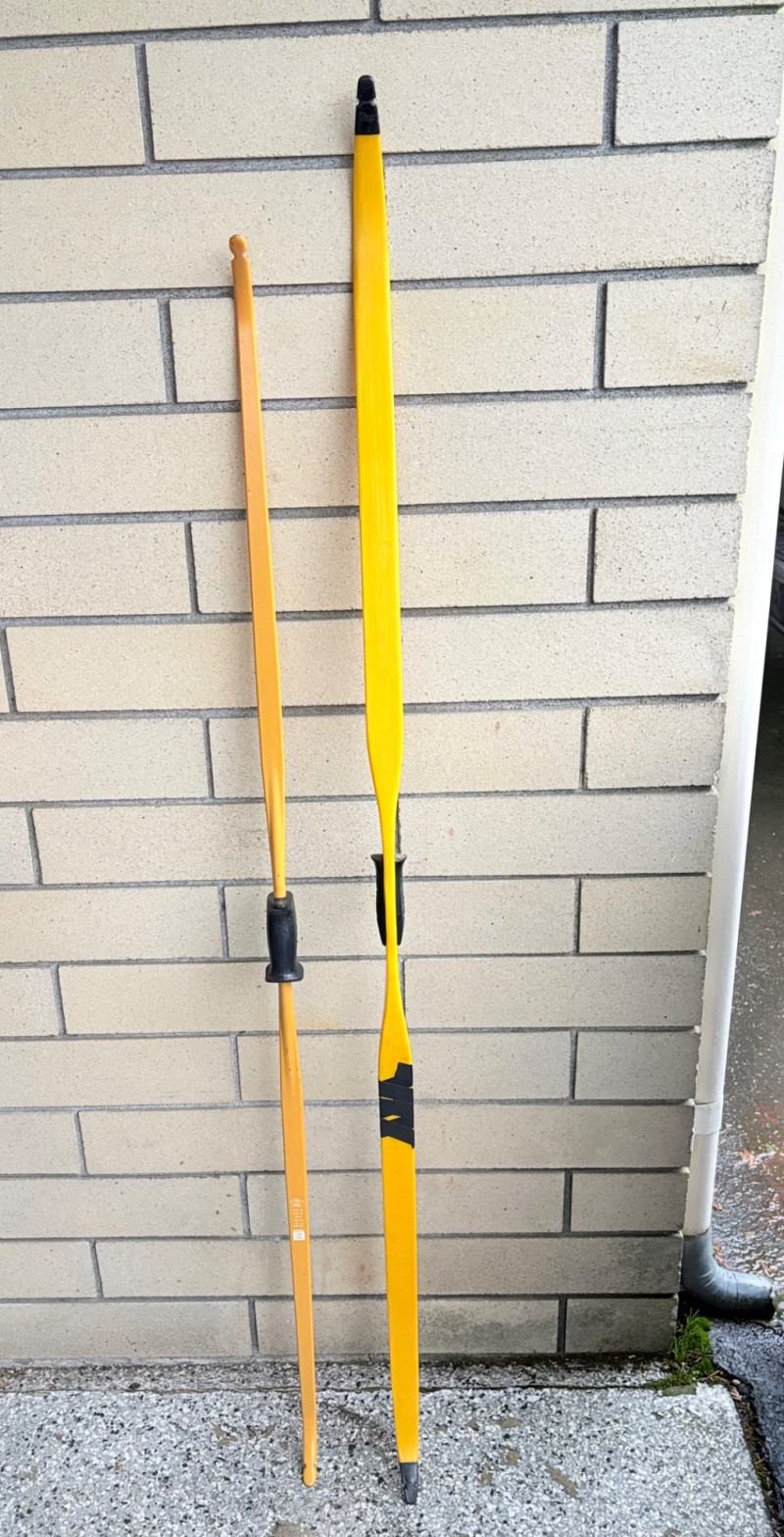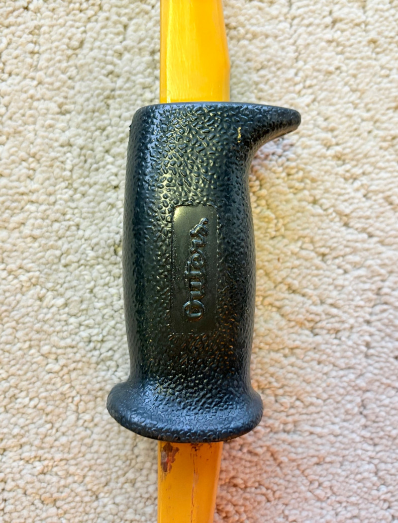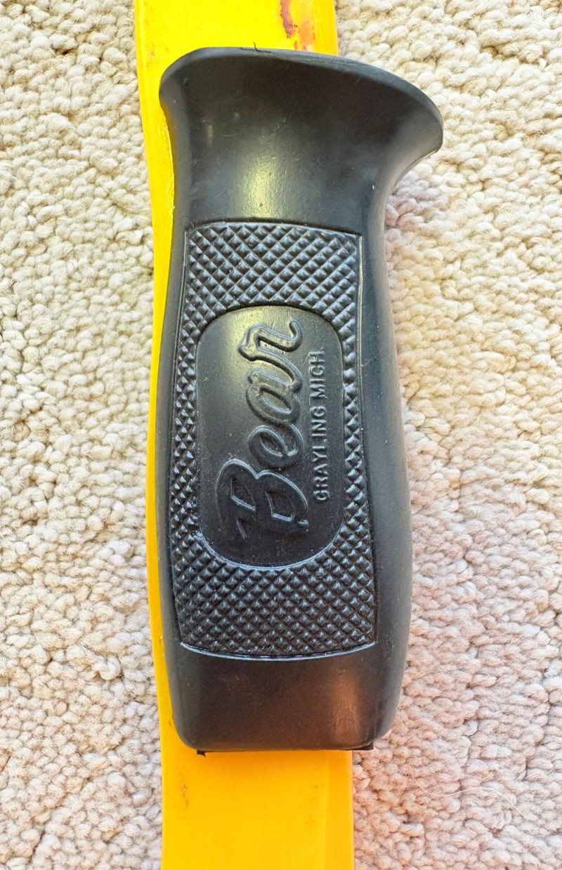Pair of vintage recurve bows just waiting to be strung and used by an avid sportsman who appreciates old-school equipment, or to be hung as decor items in your cabin/den. Bear Archer Golden Bear traditional recurve bow "AMO 60" 30#" with black rubber grip. Could use a good scrub but appears to be in very good condition with no flaws noticed except a couple of rub marks. Outer Fleetwood Fibre Glas recurve bow is more slender than the Bear model above and slightly smaller. Model is "no. 2004. 20 25#" and appears to be in very good condition with no flaw noticed except a couple of rub marks. Golden Bear By Bear Archery- Recurve Longbow Antique Bow Amo 60" 30# | eBay for sale elsewhere