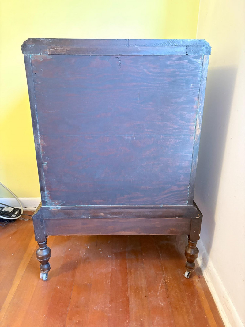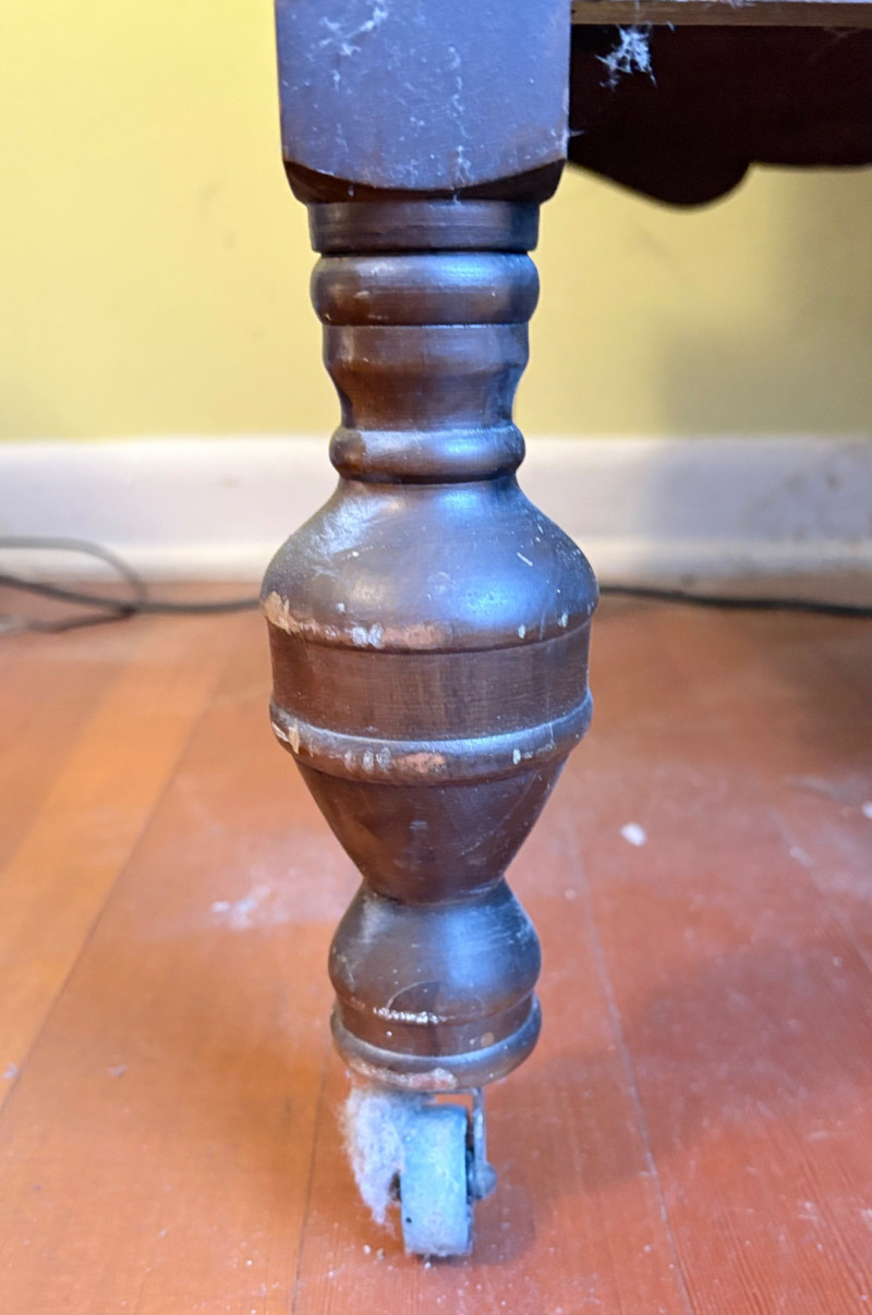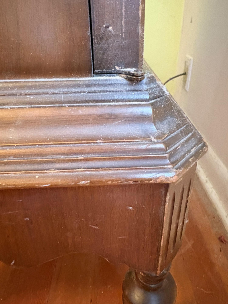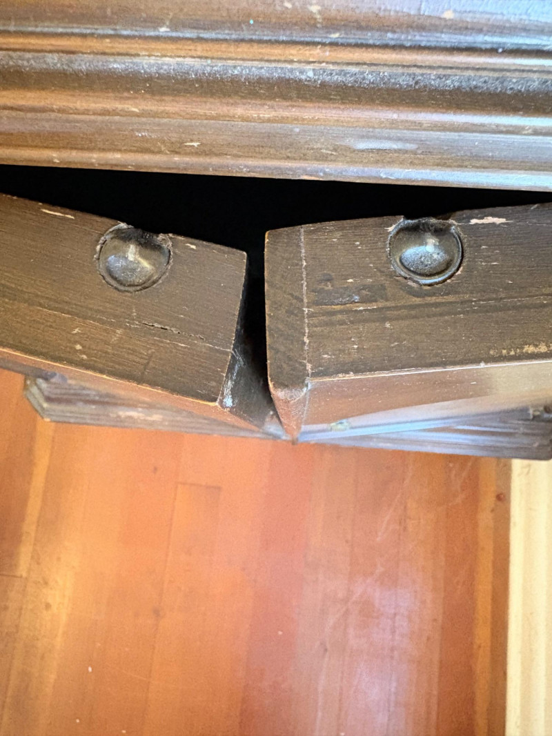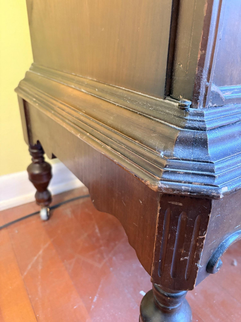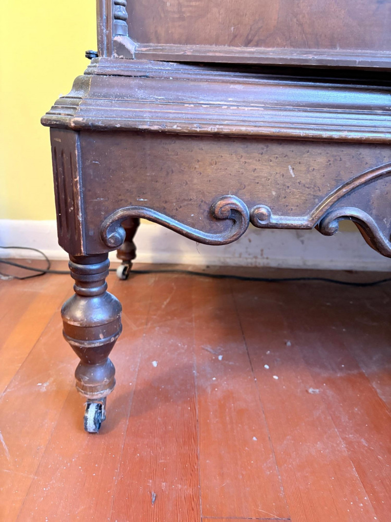 Lovely antique arched cabinet. Appears to be made of solid wood with beautiful detailing such as scalloped apron, turned legs with wheels, and gothic arches on the two front swing-out doors. Brass hardware (hinges, pulls, and wheels). Interior has two shelves that are fixed. Stepped molding along top surface edge and bottom support area. No maker mark (it might be a Majestic), but we found it solidly built and definitely vintage. Measures 40" H x 29" W x 20" D. This is a truly lovely piece that just needs a little TLC& refinishing to be a superb piece. NOTE: This piece is upstairs - you will have to navigate a set of stairs to the main floor and then it will be flat to the driveway. Please bring 2 able-bodied people with you to move this; it isn't especially heavy, but it will be awkward going down the stairs.
