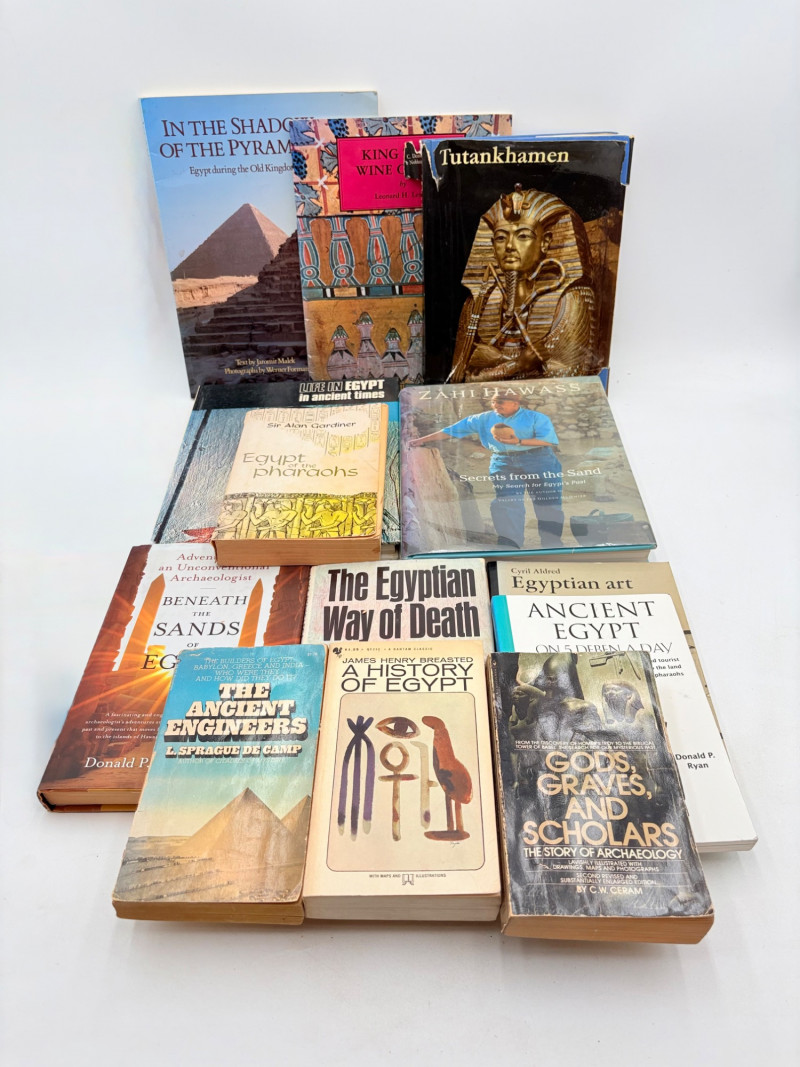 Large variety of books (paperbacks, too) on Egypt and the Pharaohs - great reading for the ancient history fanatic. Please see photos for titles. Bonus - while the above books are all pretty much non-fiction, we couldn't resist throwing in Margaret George's novel reimagining of Cleopatra's life The Memoirs of Cleopatra as a bonus - fun book!