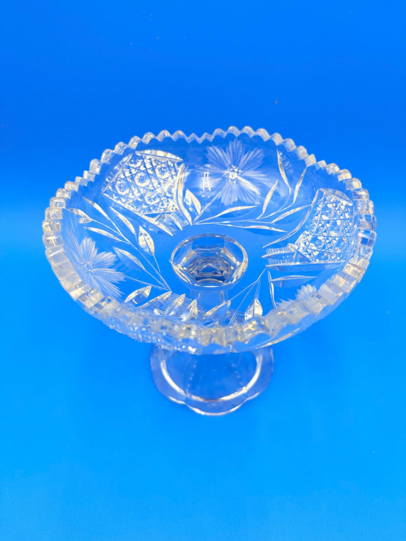 These pieces are all vintage, but they are a mixed group of lead crystal and cut glass. The 4 items in the back (compote, 2 wine glasses, & bowl) are lead crystal. The items in the front appear to be vintage cut glass rather than crystal as they don't have that "ting" sound when struck. Tallest (wine glasses) measure 6.25" H.