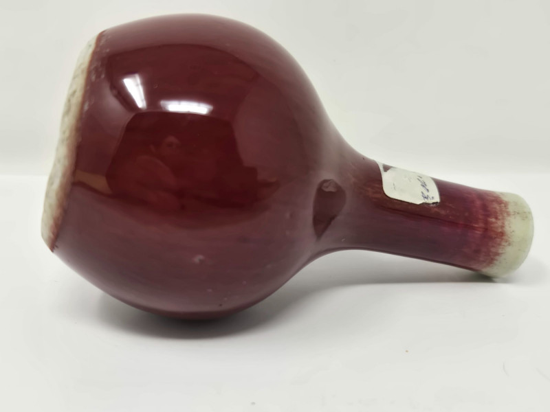 Bulbous base with narrow neck, featuring classic oxblood glaze and crackled rim detail Description
