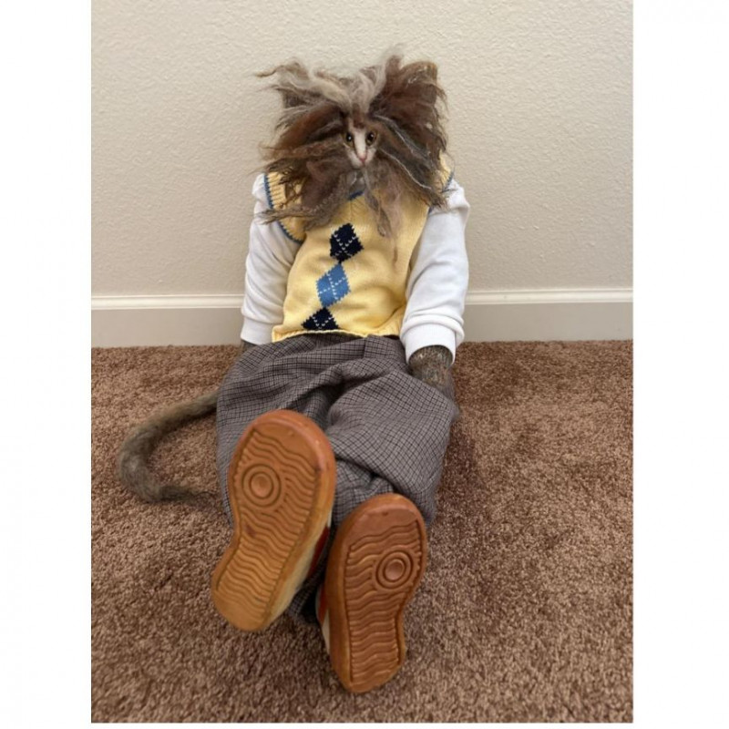 Stuffed mohair knitting art cat by Judith Loeber, crafted in her signature anthropomorphic style. The figure features a wildly textured mohair head and mane, paired with a fully dressed soft‑sculpture body wearing a yellow argyle sweater vest, white shirt, checked trousers, and sneakers. The piece blends textile artistry with whimsical character design, showcasing Loeber’s distinctive approach to hand‑knit mohair figures.
