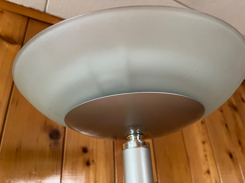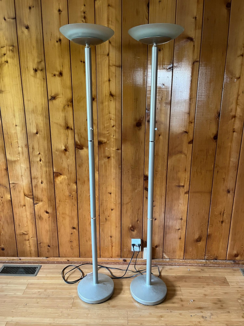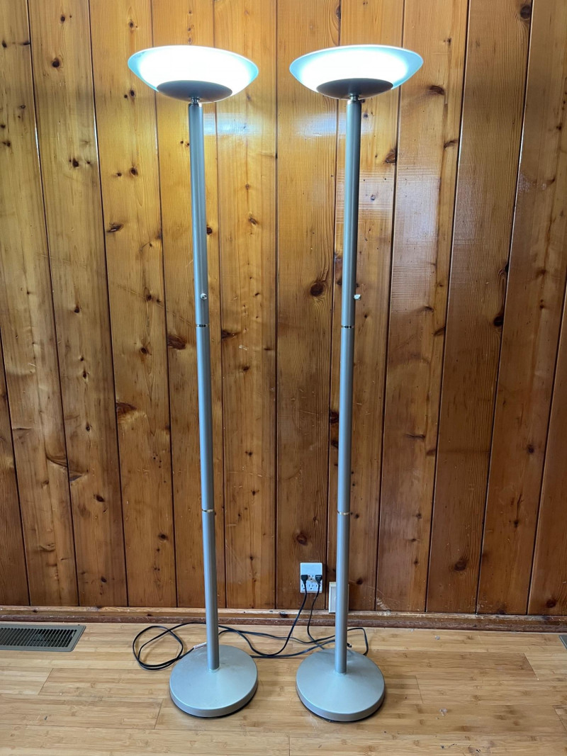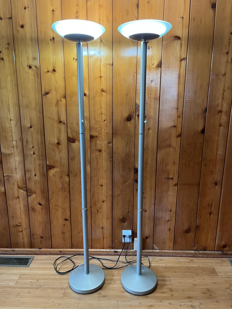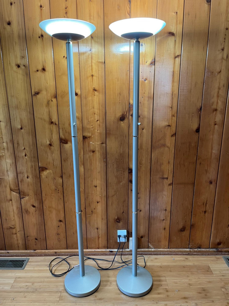 Pair of post‑modern floor lamps featuring a clean, minimalist silhouette with upward‑facing bowl shades and slim column bases. Both lamps are dimmable, offering adjustable ambient lighting suitable for living rooms, offices, or contemporary interiors. Features: Post‑modern design with upward‑facing bowl shades Slim metal columns with round bases Dimmable light control Matching pair Condition: