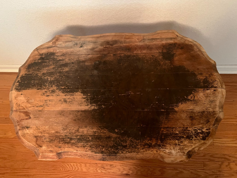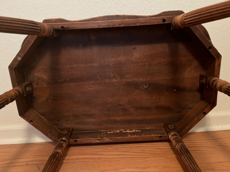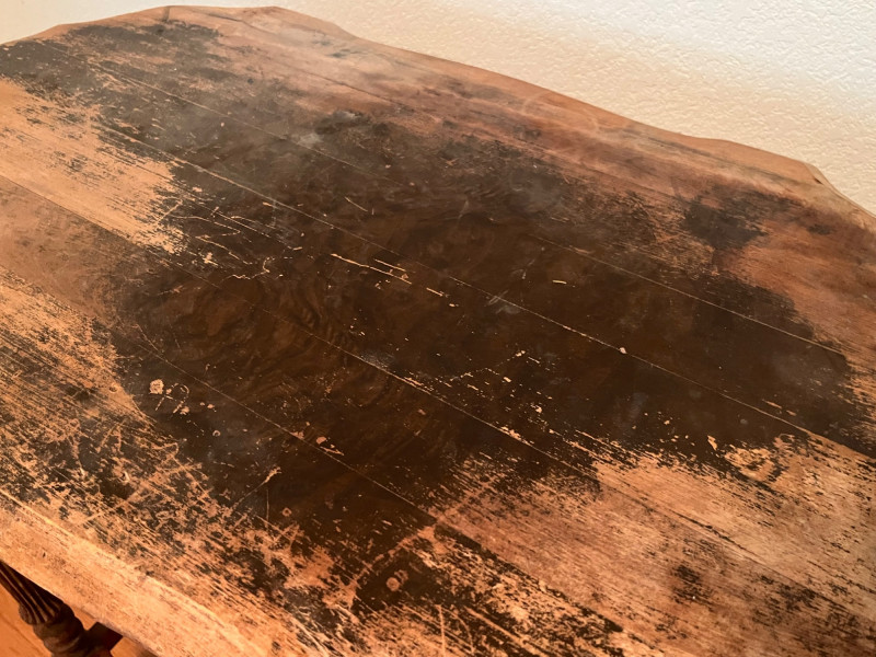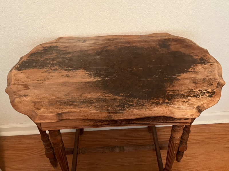 Wear consistent with age and use, including scratches, finish wear, and surface marks. Table remains sturdy. Please review all photos for details.