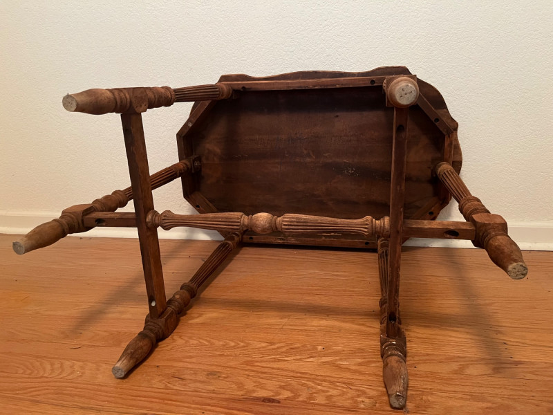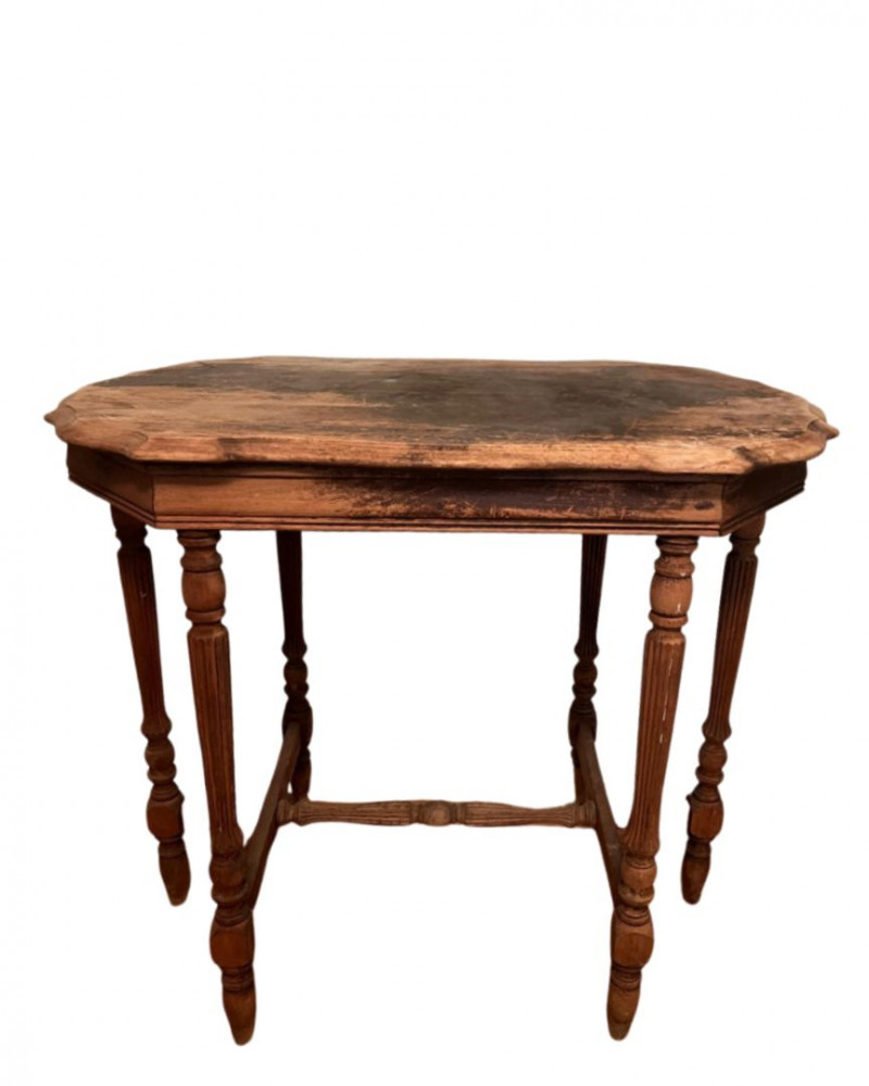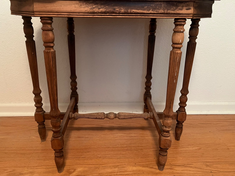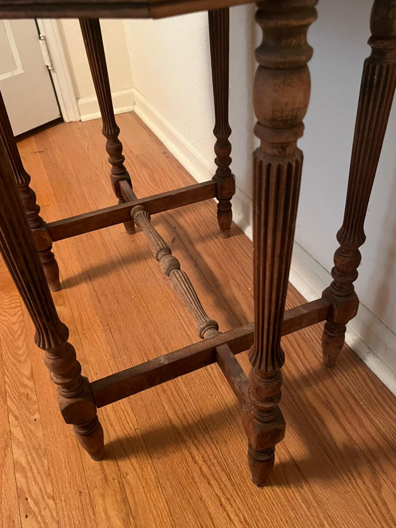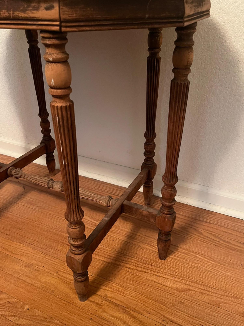 Small accent tables of this style were widely used from the late 1800s through the 1930s, often crafted in regional workshops rather than large factories. Turned legs with ringed or fluted details were a hallmark of the era, offering decorative appeal while remaining structurally strong. Stretcher bases—like the one seen here—were introduced both for stability and as a stylistic element during this period. Surviving examples with original joinery and finish wear, such as this one, are valued for their authenticity and warm, lived‑in character. Features: Solid wood construction Turned legs with carved accents Lower stretcher bars for stability Naturally aged finish with visible patina Compact footprint suitable for entryways, reading corners, or display Condition: