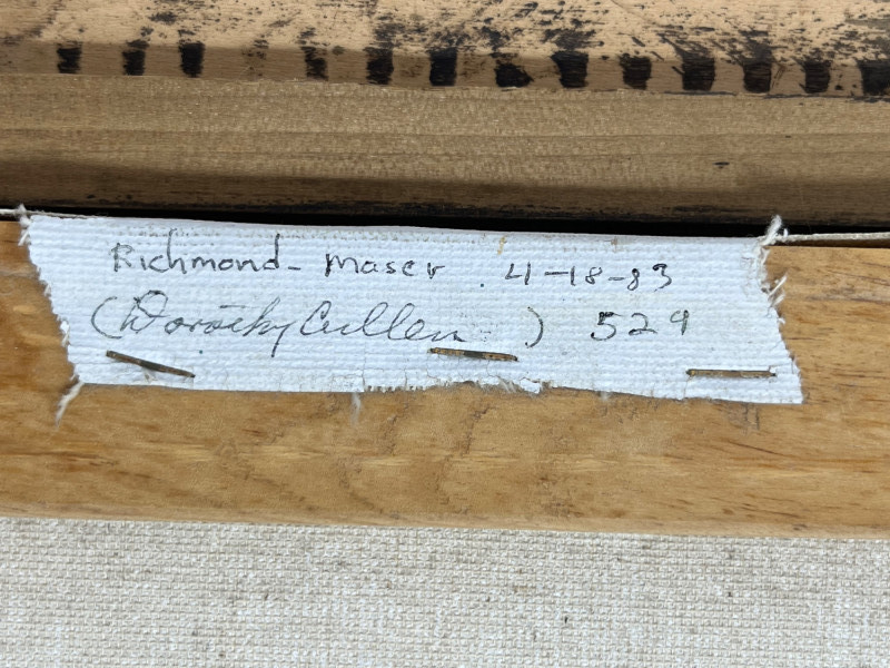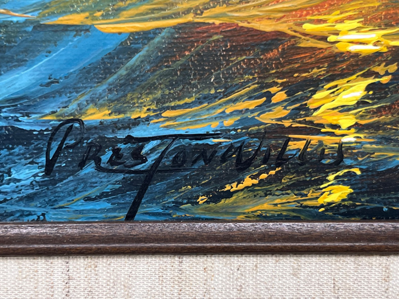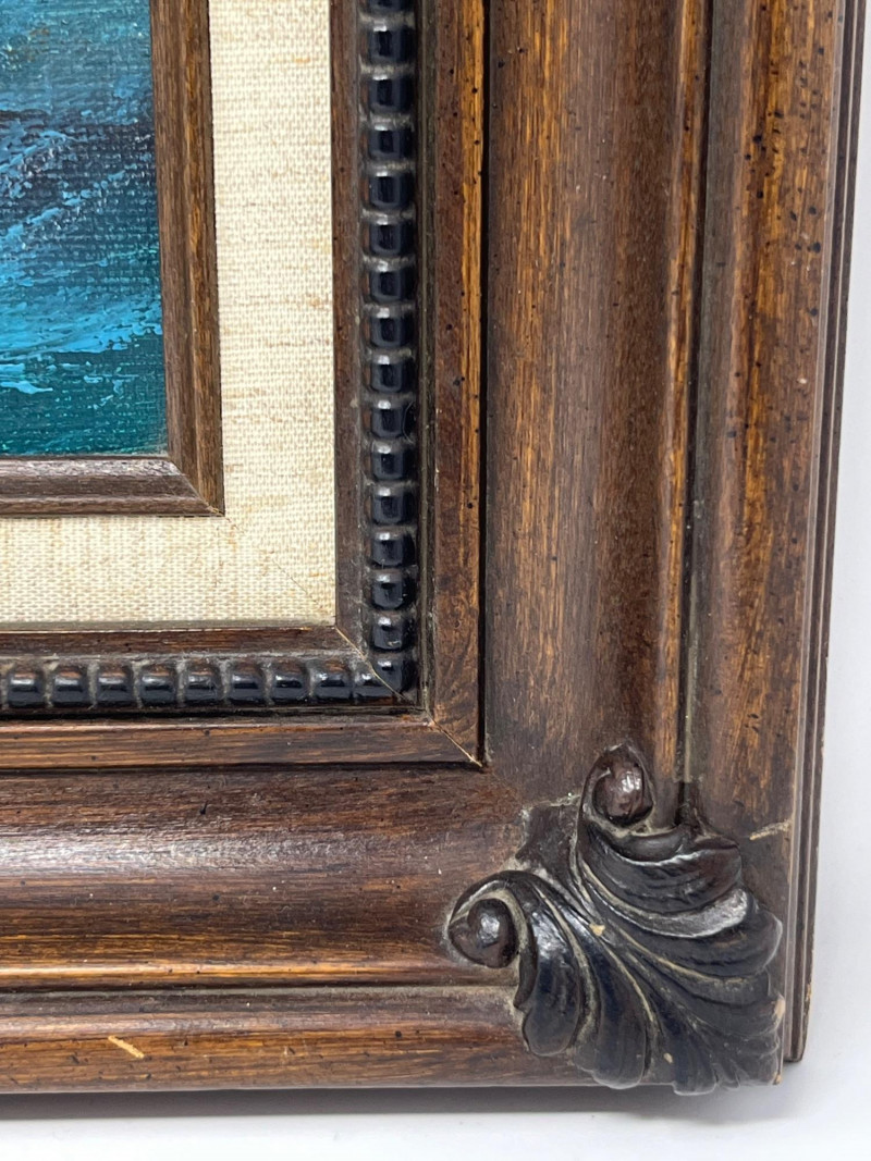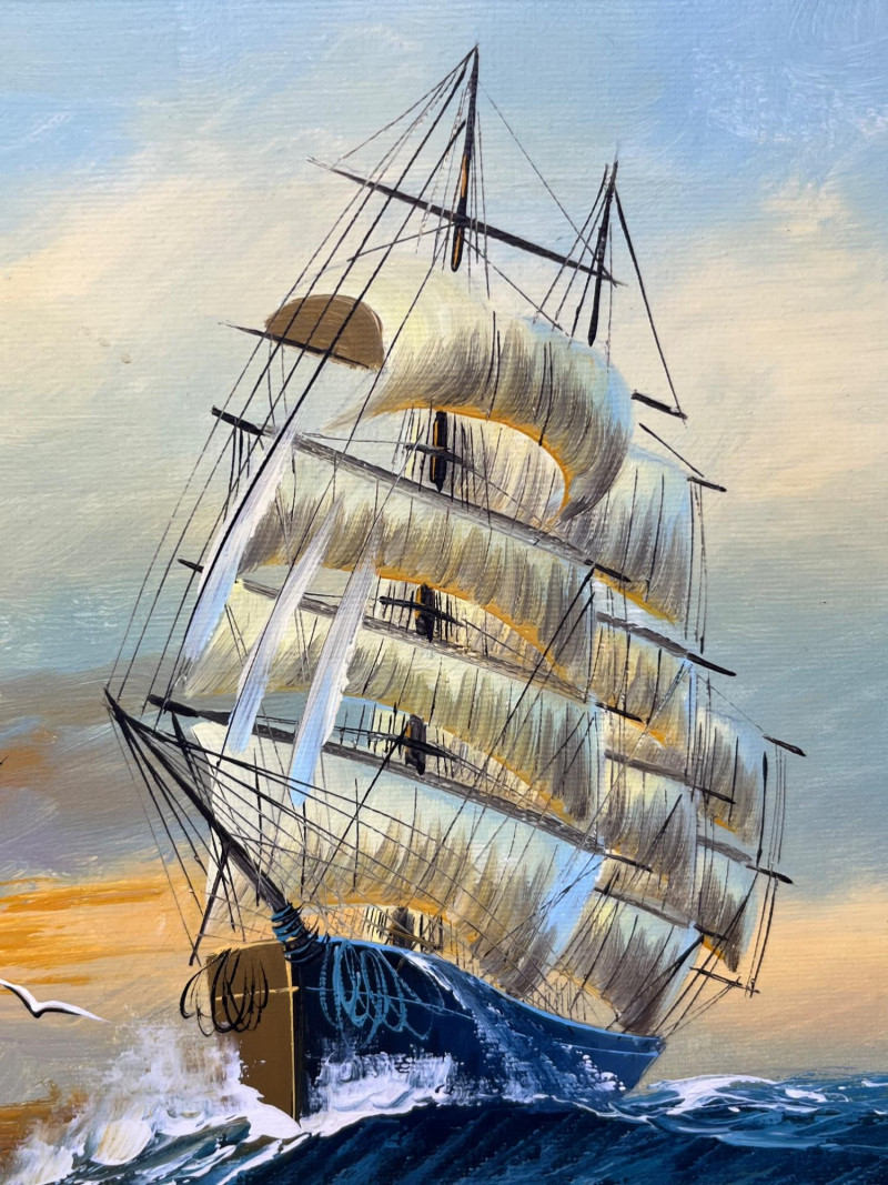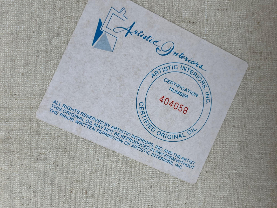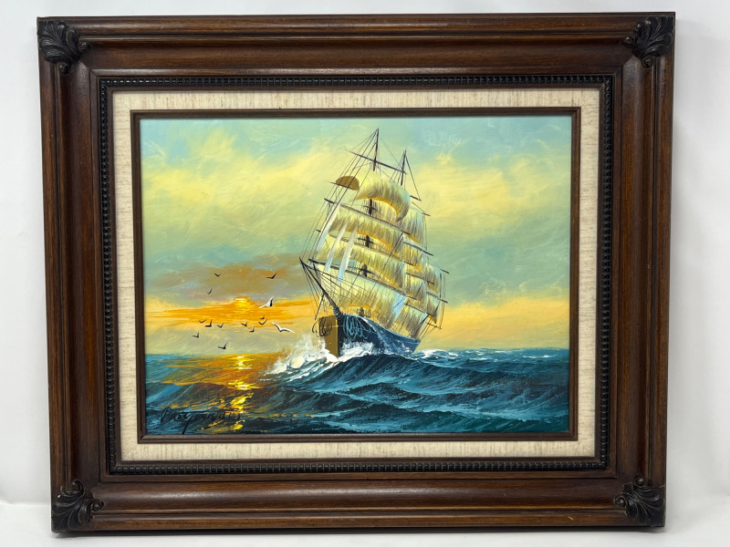 Atmospheric maritime oil painting depicting a tall ship in full sail navigating ocean waves beneath a vivid sky. Rich sunset tones and expressive brushwork capture motion and mood. Signed “Preston Willis” lower right. Presented in a carved, gold-toned wooden frame with ornate corner detailing. Canvas bears “Academy Canvas” stamp; verso includes handwritten provenance: “Richmond. Proce: 4-14-95 Emily Collins - 52.00” “Richmond Moser 4-12-93 (Dorothy Cullen) 529” Affixed certificate from “Art in General” confirms originality with stamped number “840058.” Condition: