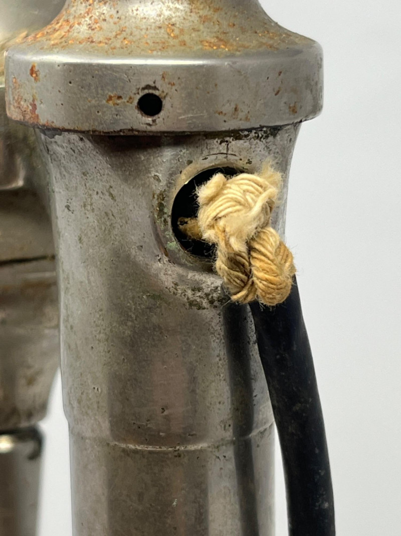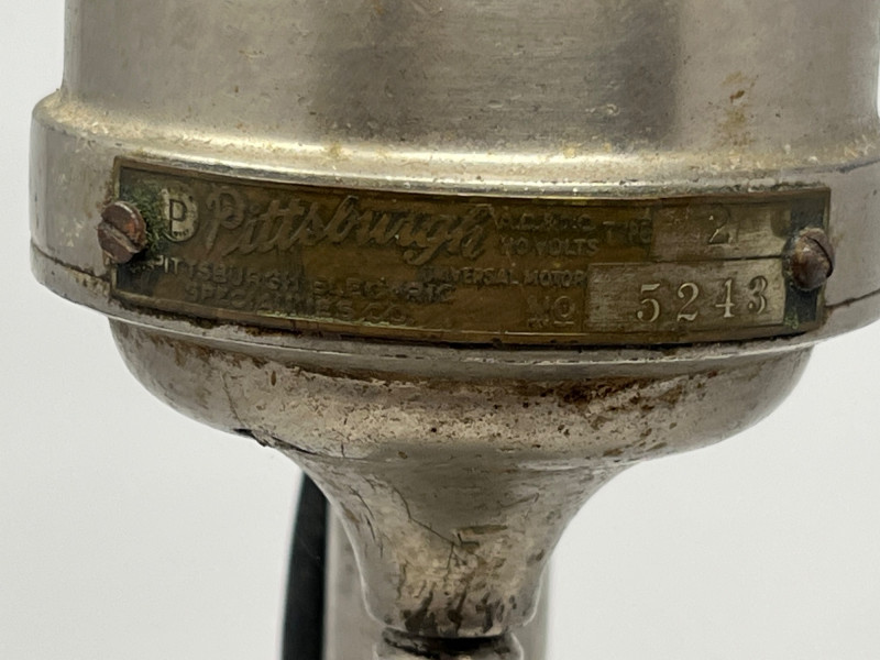 Classic mid-century countertop drink mixer by Pittsburgh Electrical Specialties Co., model 5215. Features a sturdy cast-metal body with original chrome finish, cylindrical base, and motor housing with integrated mixing spindle. Includes original metal mixing cup. Power cord shows age-related wear and has been reinforced with rope-style wrap; untested and offered as-is for display or restoration. Also includes a vintage spring-loaded ice cream scoop marked “Made in USA.” Both pieces exhibit authentic patina and wear consistent with age and use. Ideal for collectors of vintage kitchen appliances, soda fountain memorabilia, or industrial design. Mixer measures approx. 14" tall; scoop approx. 8" long. Condition: Untested. Surface wear, oxidation, and cord fray present. Sold as-is.