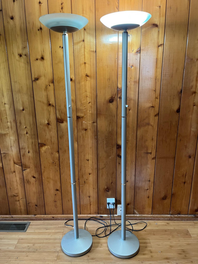 Pair of post‑modern floor lamps featuring a clean, minimalist silhouette with upward‑facing bowl shades and slim column bases. Both lamps are dimmable, offering adjustable ambient lighting suitable for living rooms, offices, or contemporary interiors. Features: Post‑modern design with upward‑facing bowl shades Slim metal columns with round bases Dimmable light control Matching pair Condition: General wear consistent with use. Surfaces show minor marks and scuffs. Lamps have been tested and are in working condition; however, one bulb has burned out. Notes: