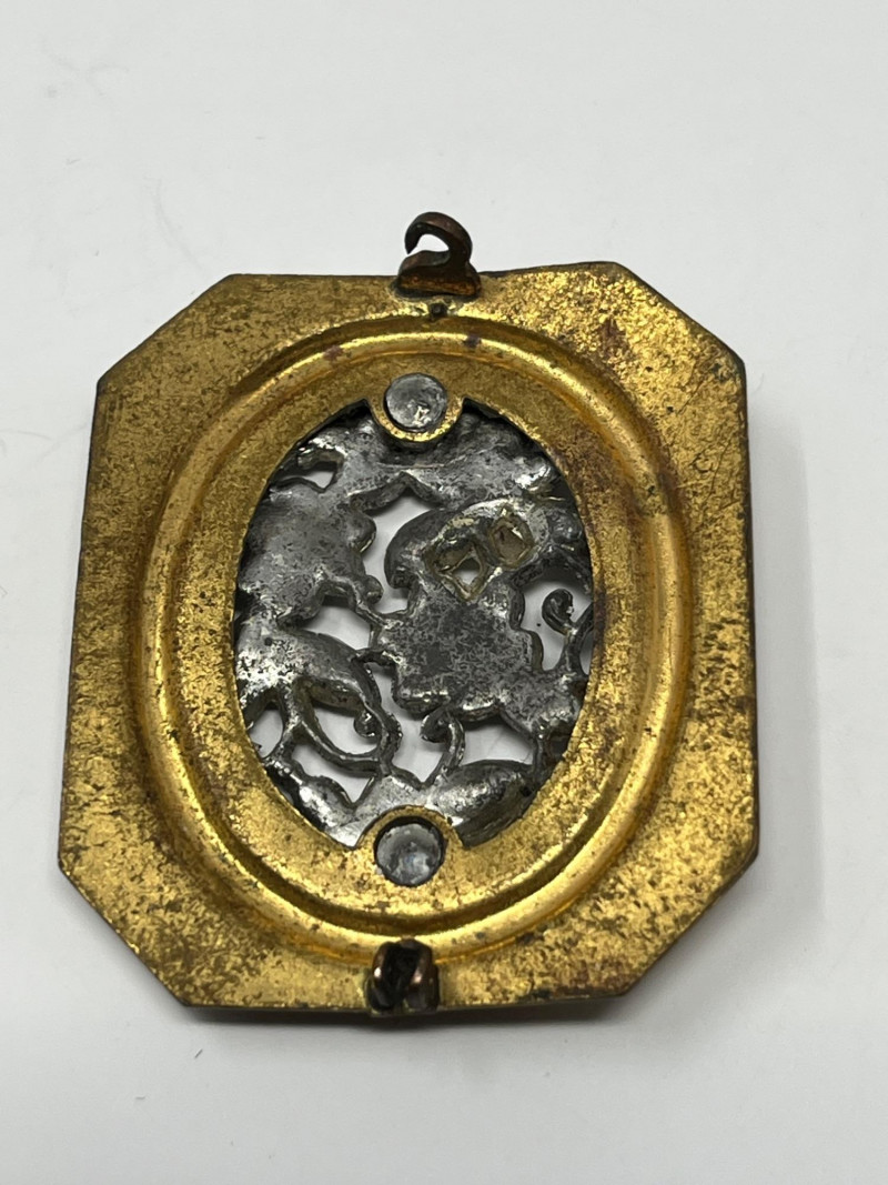 Marked STERLING. Features a black stone centerpiece. Light wear consistent with age. 3. Antique Two‑Tone Brooch (Pin Missing)
