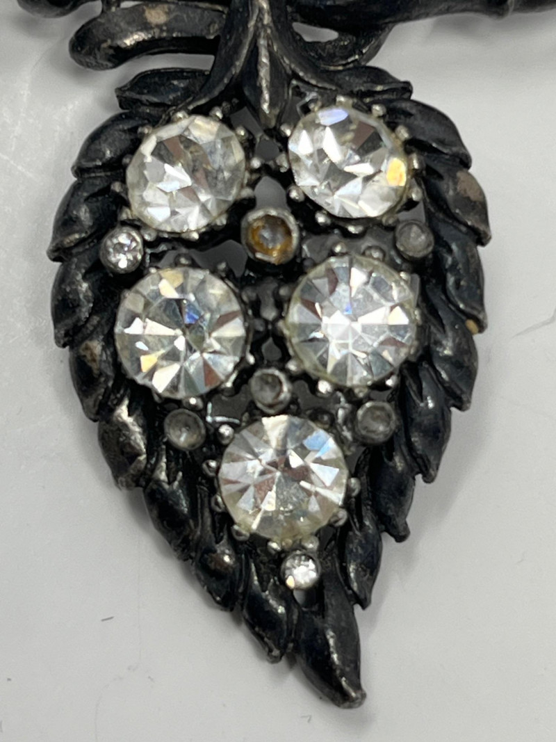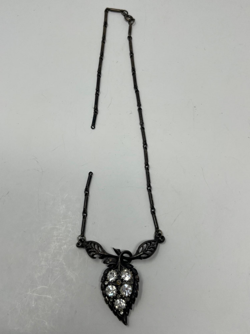 Parrot pendant on chain. Pewter tone with light wear. 6. Leaf & Rhinestone Necklace