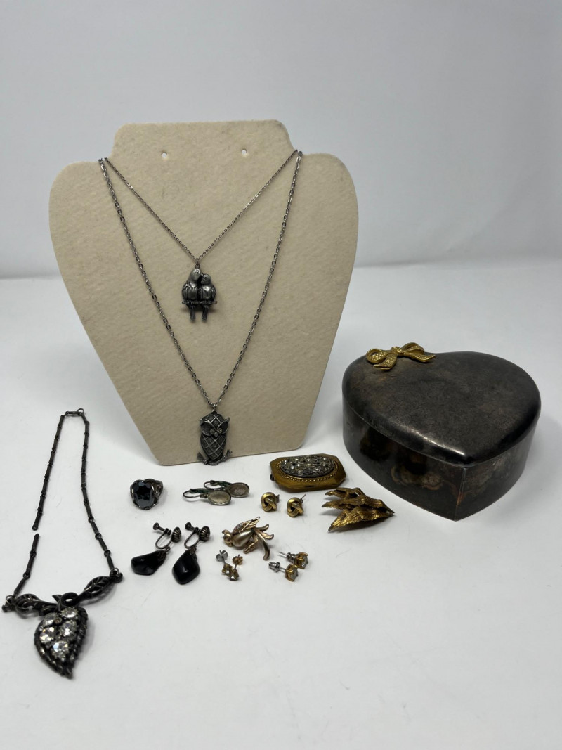 Lot # 22 - Vintage Metal Jewelry Lot w/ Sterling Ring, Brooches, Necklaces & Box