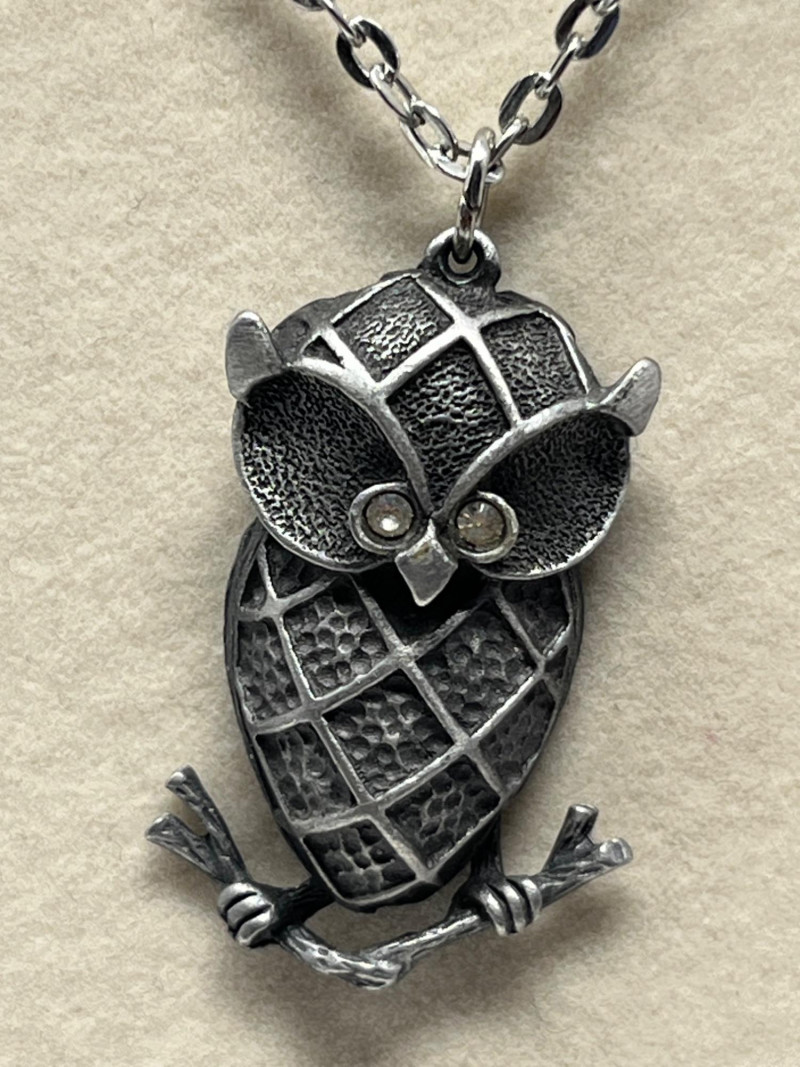 Vintage two‑tone metal brooch with classic styling. Pin mechanism is missing. 4. Pewter Owl Necklace