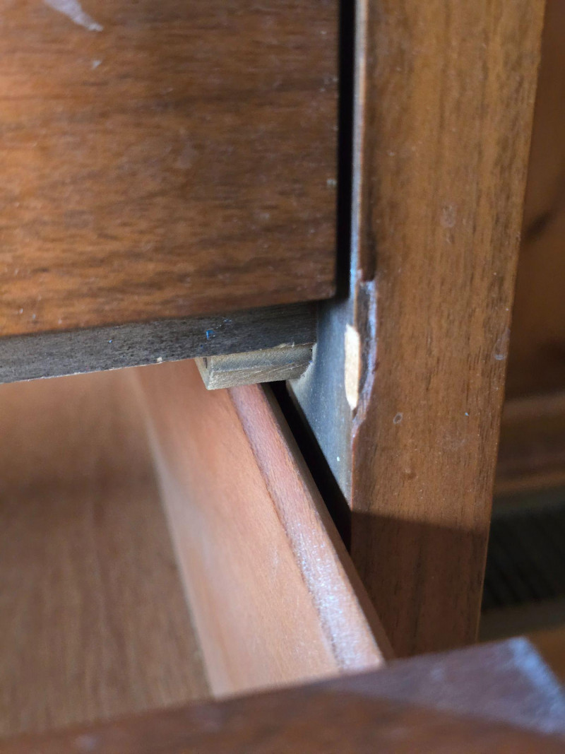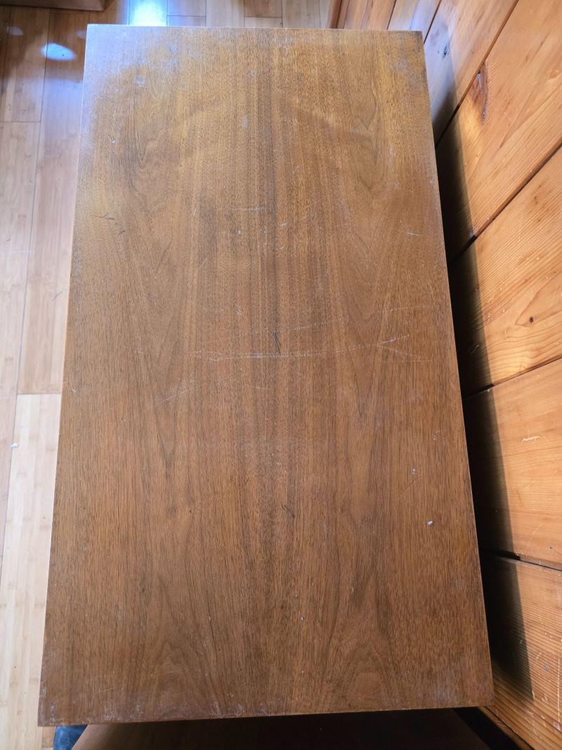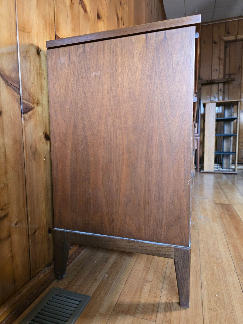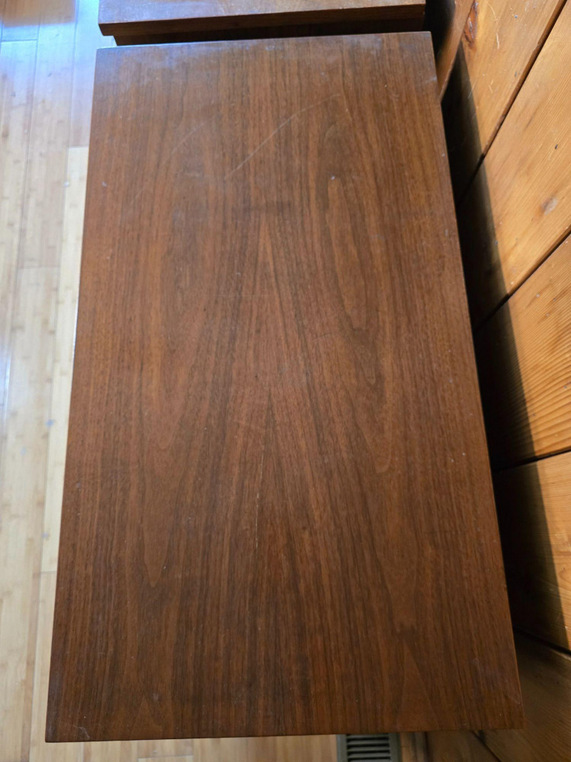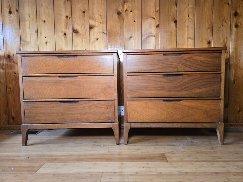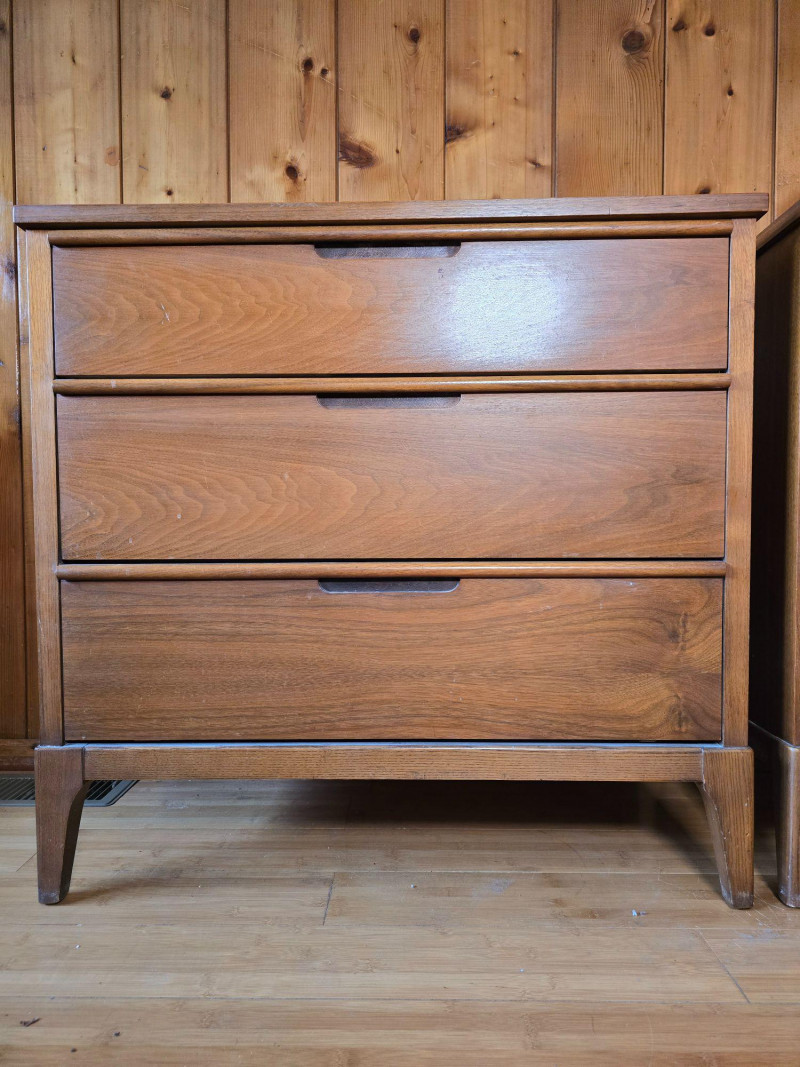 Pair of matching mid‑century modern wooden dressers by Haddon Hall. Each features three full‑width drawers with integrated horizontal pulls, clean lines, and tapered legs. Warm wood tone with visible grain. Haddon Hall stamp present inside drawer. Surface wear consistent with age and use, including scratches, scuffs, and finish wear on tops and edges. Structurally solid. Drawers operate smoothly. See photos for condition. Length: 32 in