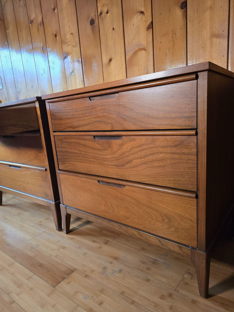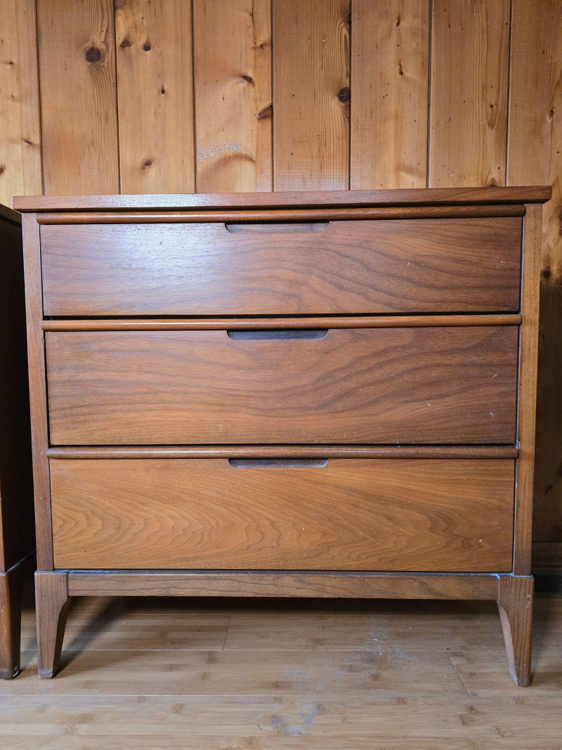 Height: 31 in Matching mid‑century pair Three‑drawer configuration Tapered legs Haddon Hall maker’s mark Clean, classic MCM profile Suitable for MCM collectors, bedroom sets, studio staging, or restoration.Condition