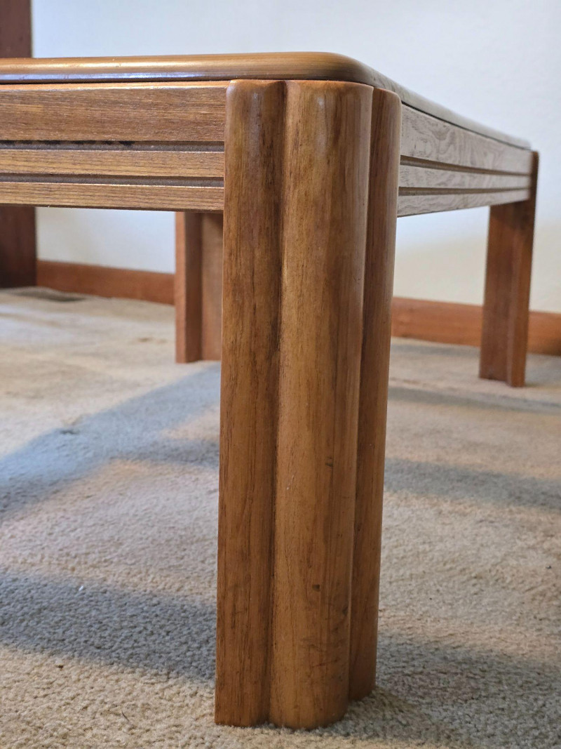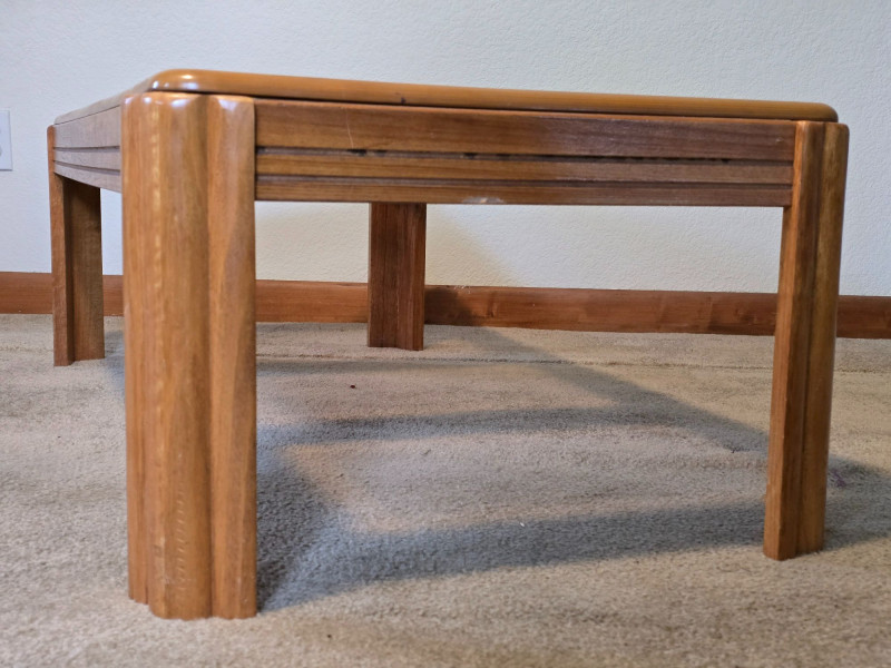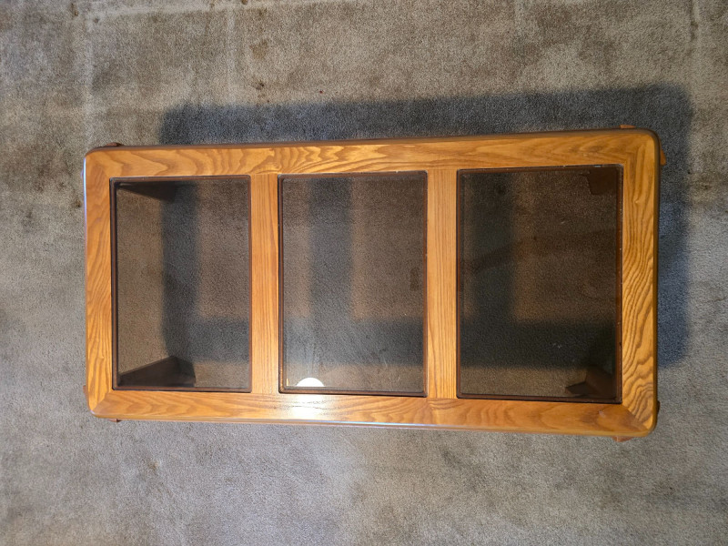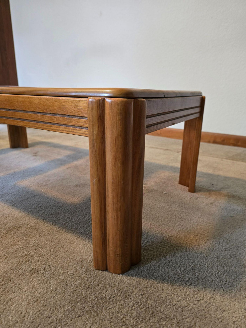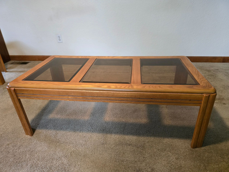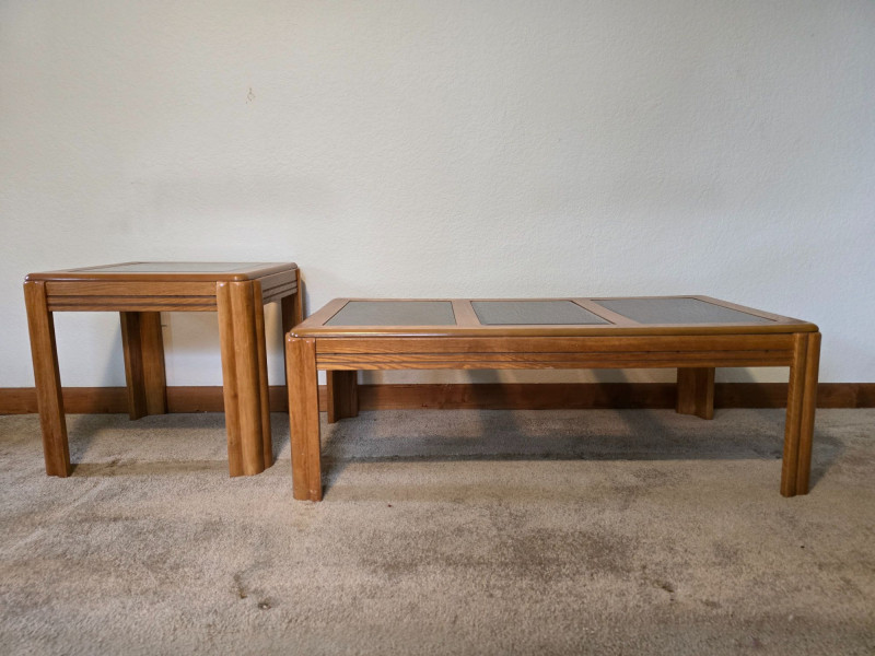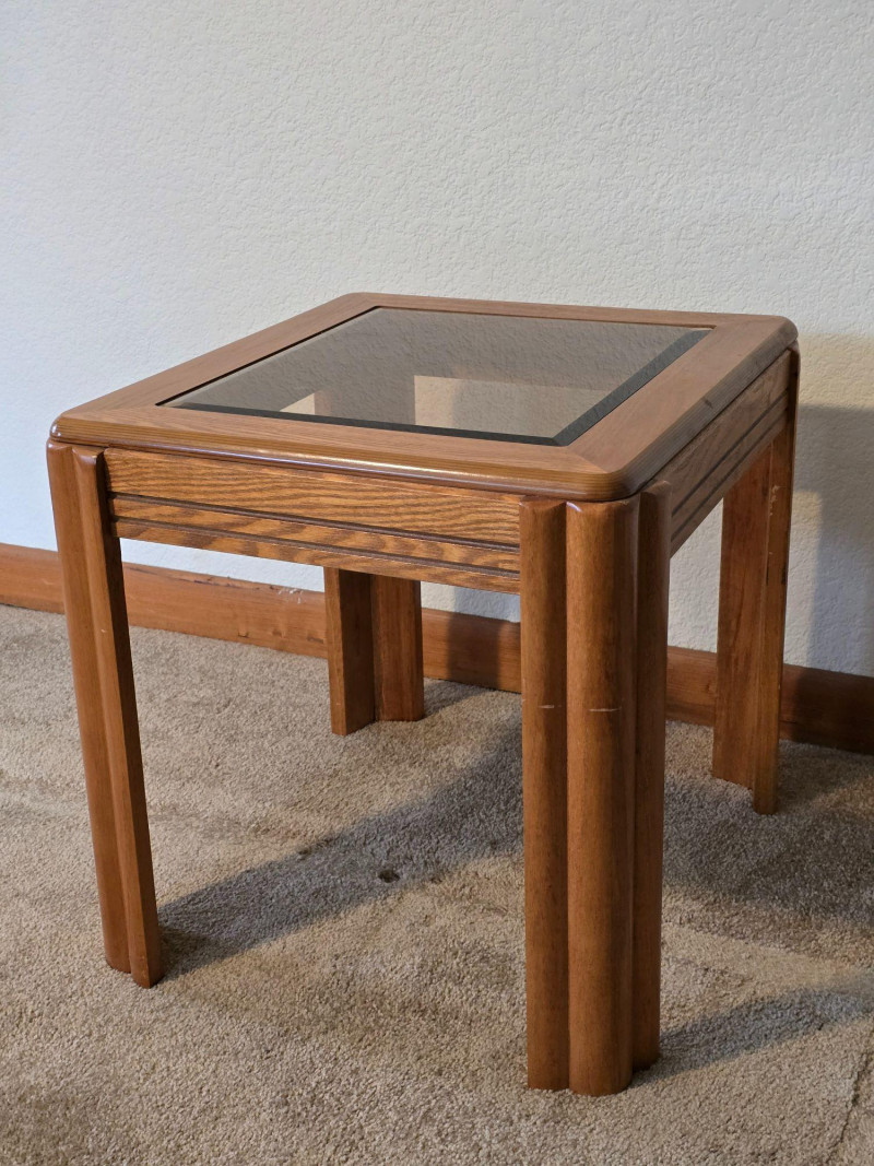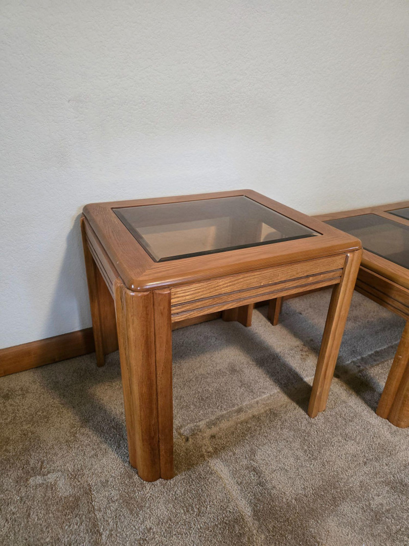 A matching mid‑century modern glass‑top coffee table and side table set featuring clean lines, minimalist form, and the classic sculptural presence associated with MCM design. Both pieces offer a light, airy profile that works well in contemporary, vintage, or mixed‑style interiors. Matching MCM glass‑top table pair Clear glass surfaces with beveled edges Sleek, geometric base design Ideal for living rooms, offices, or display spaces Coffee Table 45" L 23" W 16" H Side Table 21" L 18" W 19" H Light wear consistent with age and use. Glass surfaces show typical handling marks but no major damage noted. Bases are sturdy and present well. Please review photos for full condition details. A stylish, functional MCM set that brings authentic mid‑century character to any space.Features