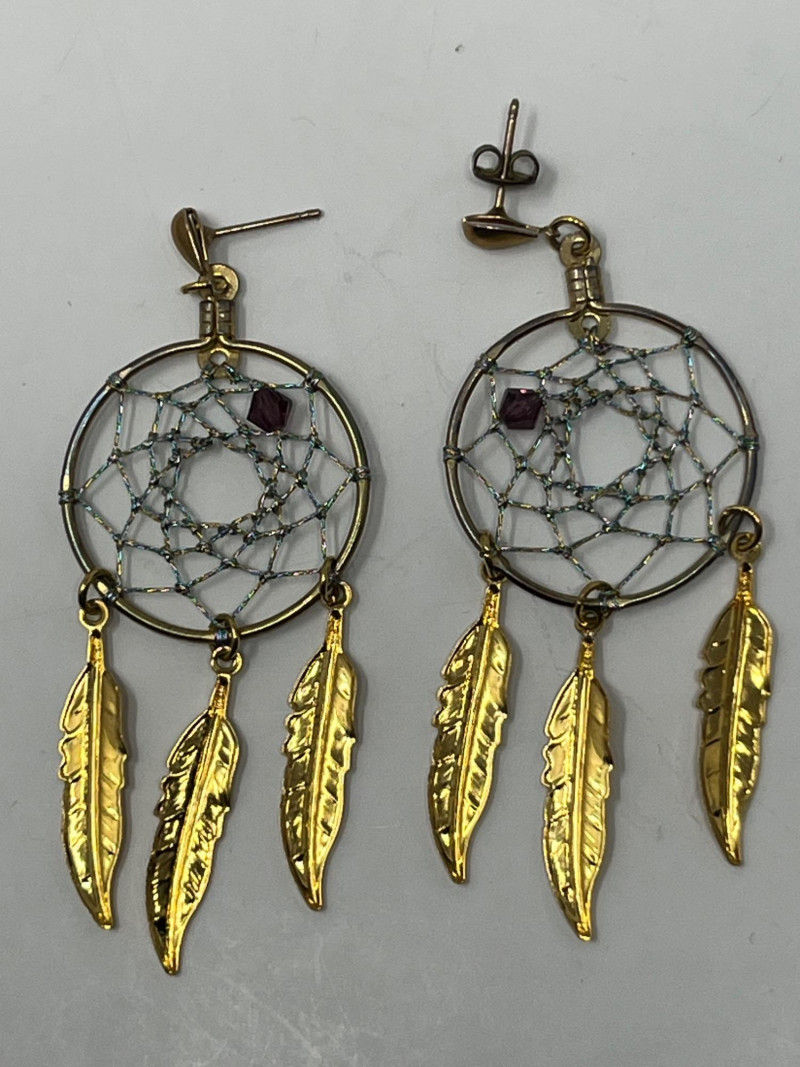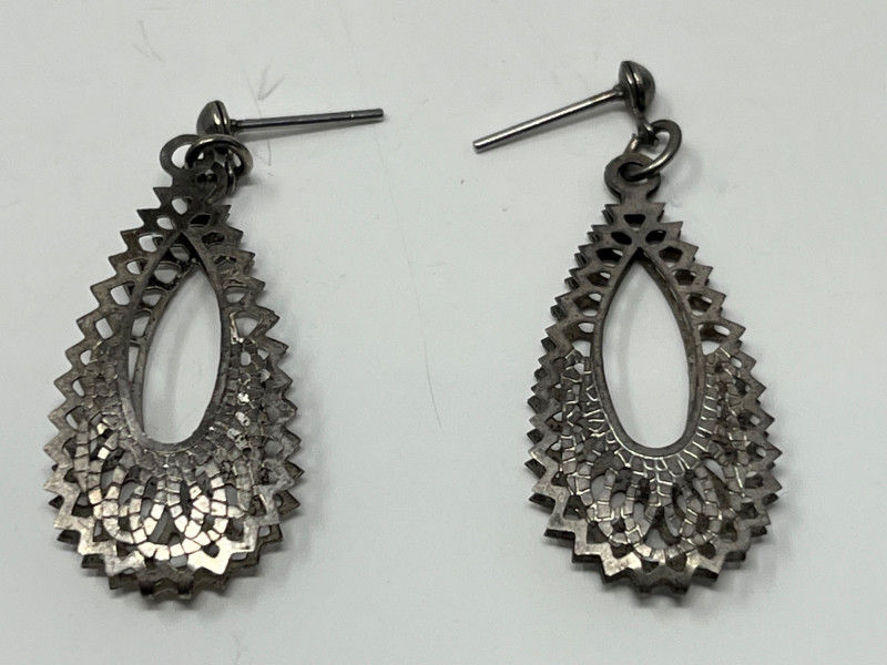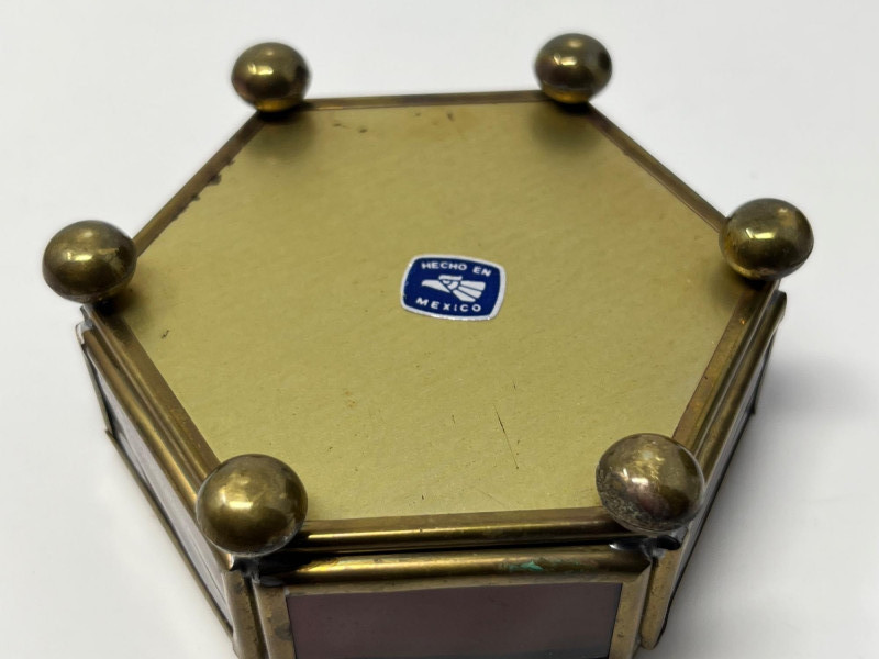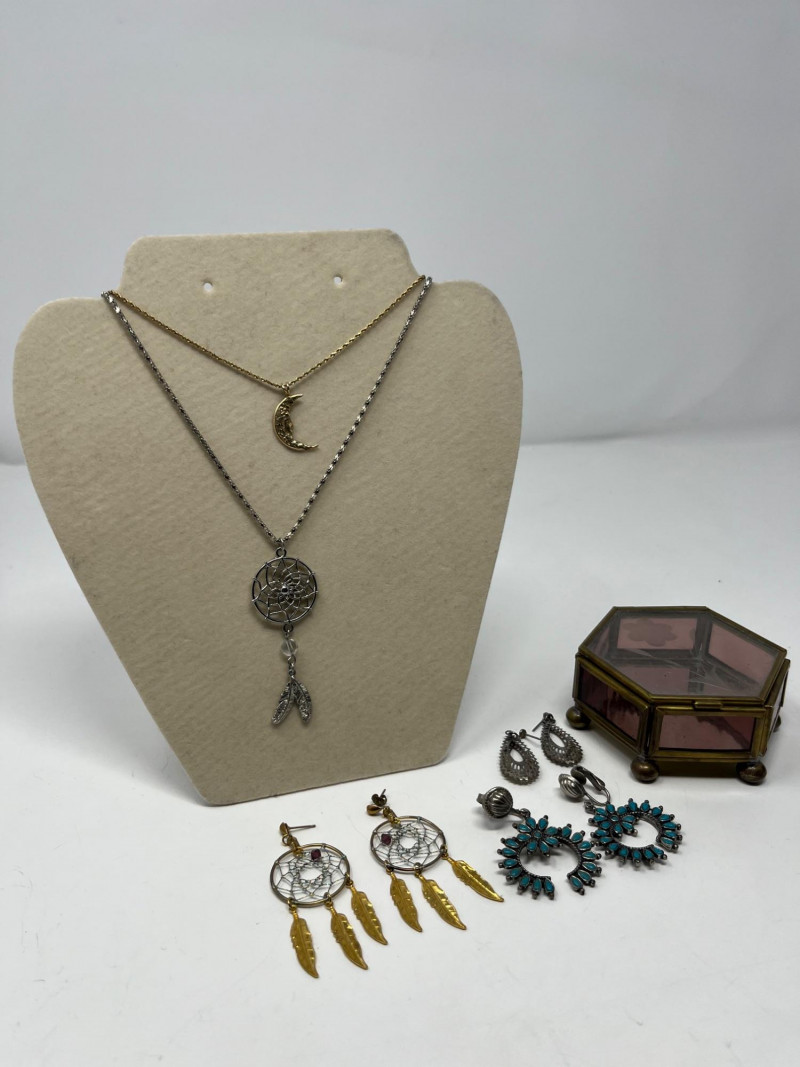 Grouping includes a small decorative trinket box marked Made in Mexico on the underside, along with five pieces of jewelry. Jewelry consists of three pairs of dangling earrings and two necklaces, all reflecting Mexican and Native American–inspired motifs including stamped metalwork, bead accents, and traditional symbolic forms. One pair of earrings is a vintage screw‑back style designed for non‑pierced ears. The remaining earrings are missing their backings. Materials are untested and makers are unknown. The trinket box shows light surface wear consistent with age. A cohesive lot for collectors of cultural and handcrafted jewelry.