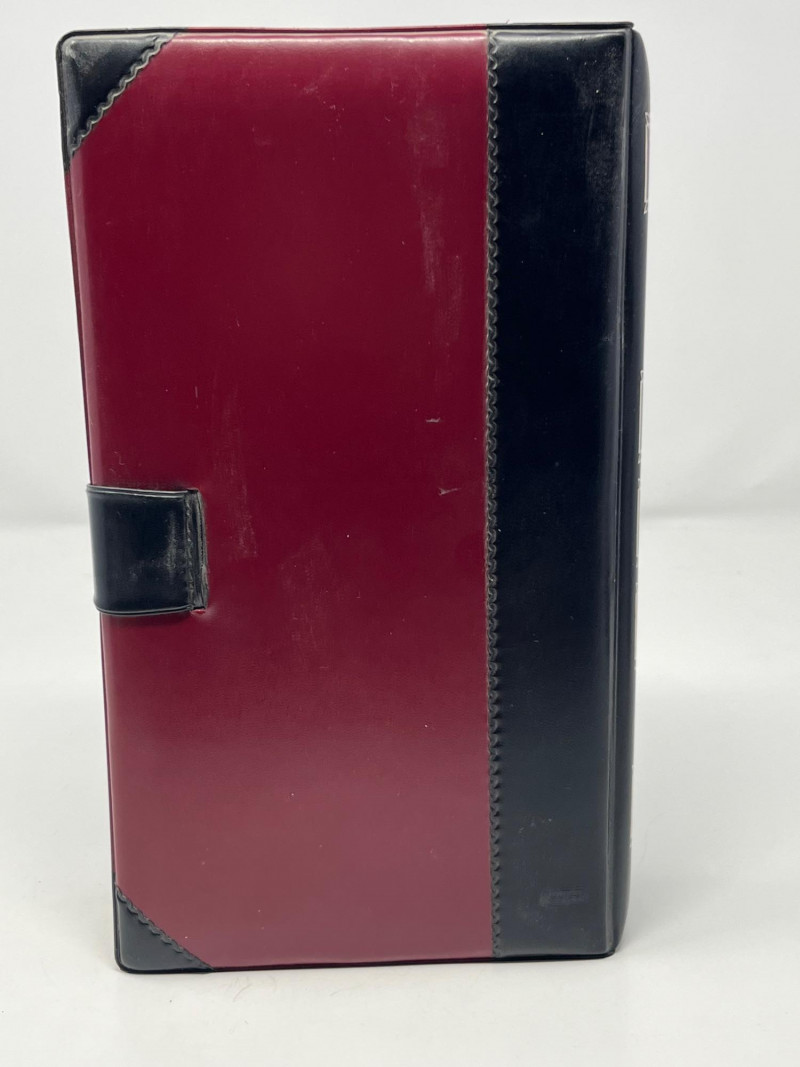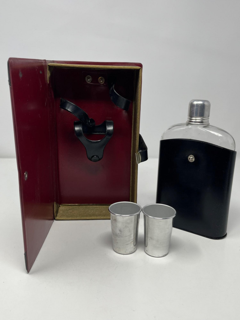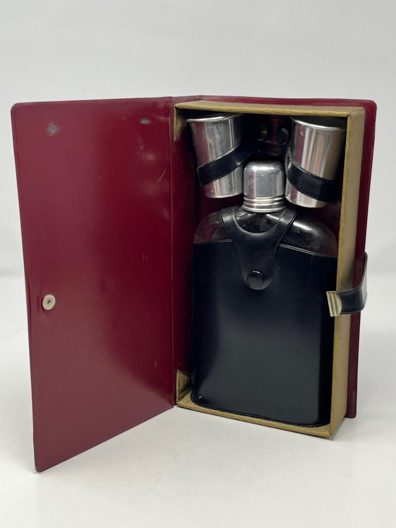 A vintage novelty concealment set featuring a hollow book case marked Made in Japan, complete with a metal flask and two matching metal shot glasses. The exterior is styled to resemble an aged hardcover volume, allowing the set to blend naturally onto a bookshelf while discreetly storing its contents. Metal flask Two metal shot glasses Hollow book case, marked Made in Japan Faux‑book exterior with aged patina Interior compartment fitted for flask and shot glasses Hinged opening for easy access Compact, bookshelf‑ready design Good overall vintage condition with expected wear consistent with age. Hinges function properly. Interior compartment clean. All included pieces fit securely inside the case.Includes