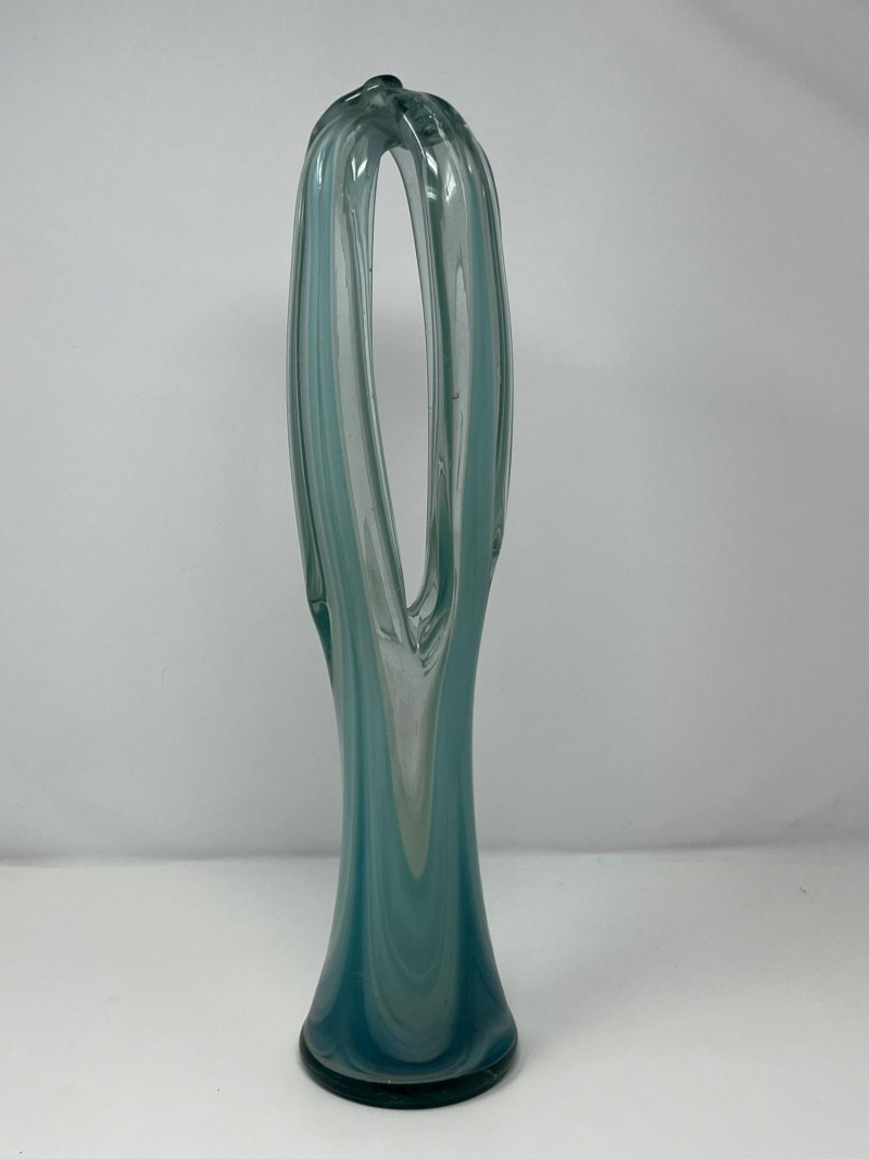 Striking vintage blown glass vase crafted in Mexico, showcasing exceptional artistry and fluid design. This tall, sculptural piece features a smooth elongated body with a wide, stable base and a dramatic twisted loop at the top. The glass displays a mesmerizing gradient of blue-green hues with swirled internal patterns, offering rich visual depth and movement. Hand-blown with organic asymmetry and subtle surface variation, this vase exemplifies the craftsmanship and expressive style of Mexican glasswork. Ideal as a standalone art object or centerpiece, it brings elegance and character to any space. Condition: Excellent vintage condition with no chips or cracks. Minor surface wear consistent with age.