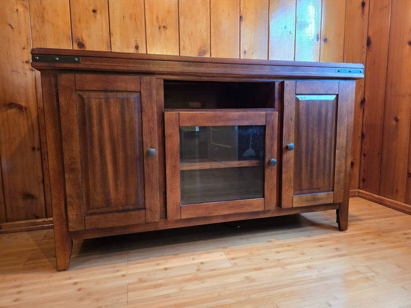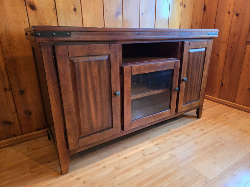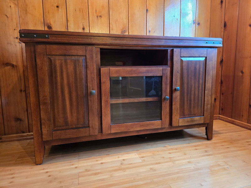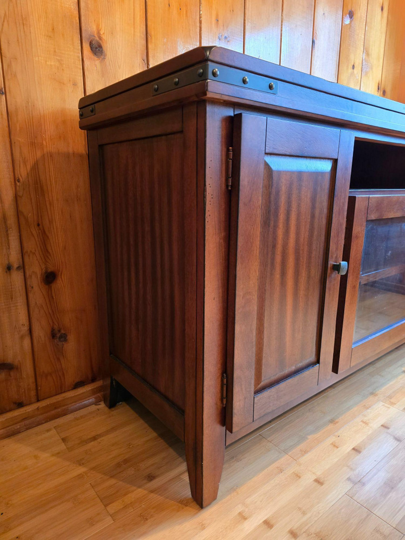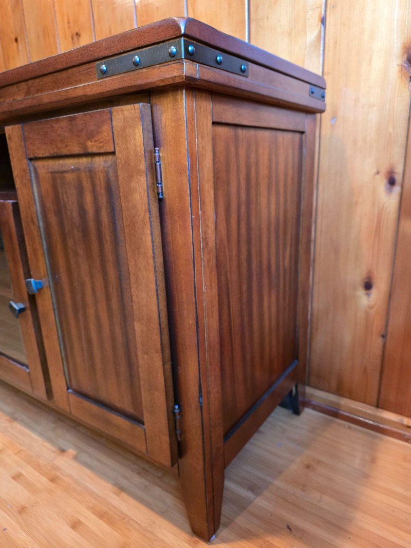 A farmhouse‑modern storage cabinet blending clean contemporary lines with the warm, grounded character associated with modern rustic interiors. The medium‑dark wood finish offers a natural, inviting presence, while the simple rectangular form keeps the piece streamlined and versatile. Its understated profile allows it to complement both modern and traditional spaces, making it suitable for living rooms, dining areas, entryways, or home offices. The three‑door layout provides practical enclosed storage with interior shelving, maintaining a tidy exterior while offering ample organization. The finish has a smooth, lightly rustic quality that pairs well with neutral palettes, natural textures, and modern farmhouse décor. Features Farmhouse‑modern style with clean lines and warm wood tones Smooth medium‑dark finish with subtle rustic character Three hinged doors with interior shelving Sturdy construction with a simple, adaptable silhouette Maker label present Condition