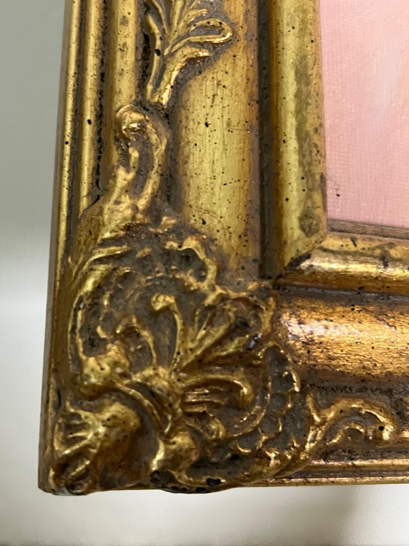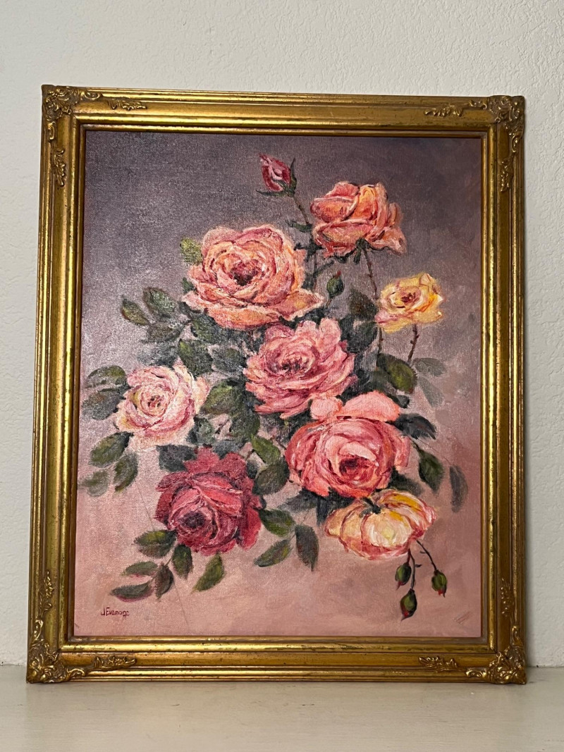 Elegant original floral painting by Ulyana Andreyevna Evanoff (b. 1947, Ukraine), renowned for her impressionistic realism. This vibrant composition features a lush bouquet of roses in pink, red, and yellow tones, set against a soft gradient background of lavender and rose hues. Executed in rich, textured brushwork, the piece showcases Evanoff’s mastery of color and composition. Signed “J Evanoff” in red paint at lower right. Presented in an ornate gold frame with detailed corner flourishes. Canvas reverse labeled “Artist’s Canvas” with barcode and product info. Includes printed artist biography detailing Evanoff’s formal training in Kiev and UCLA, her teaching career in Southern California, and her exhibitions across the U.S. and Europe. This painting is part of Evanoff’s celebrated floral series, held in numerous private and public collections. A striking and collectible work from a respected artist.