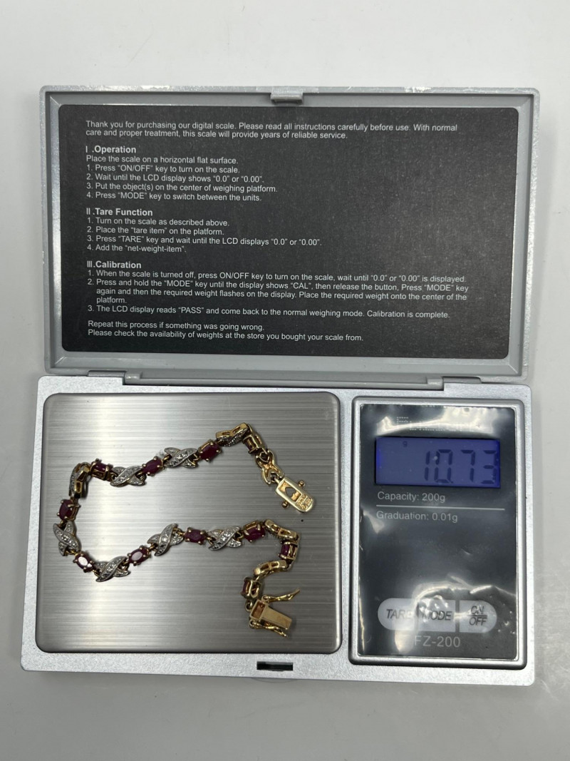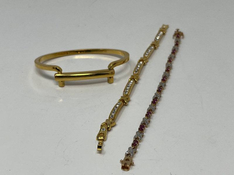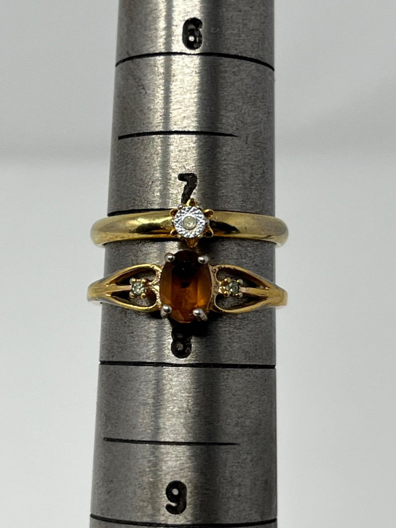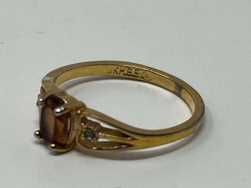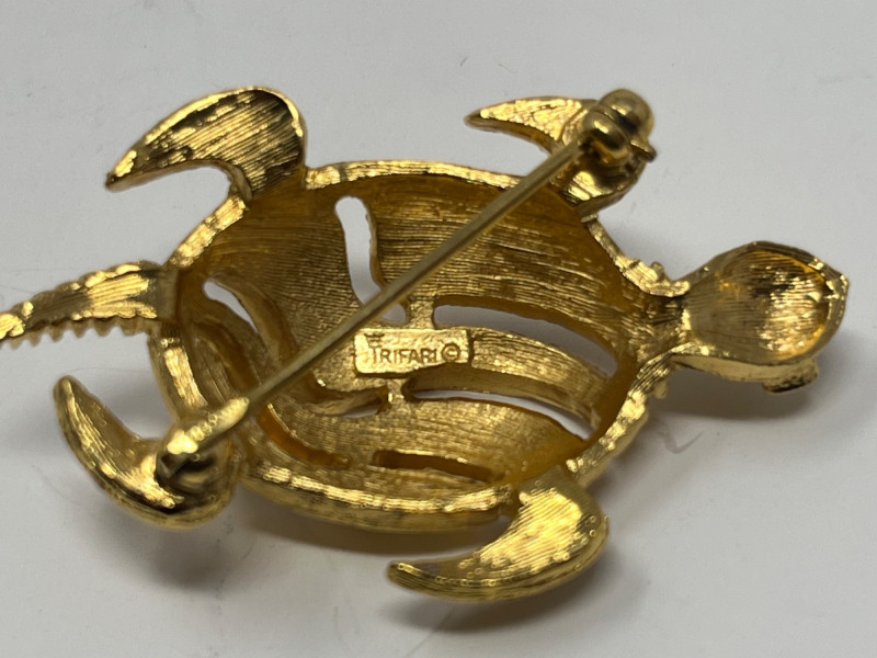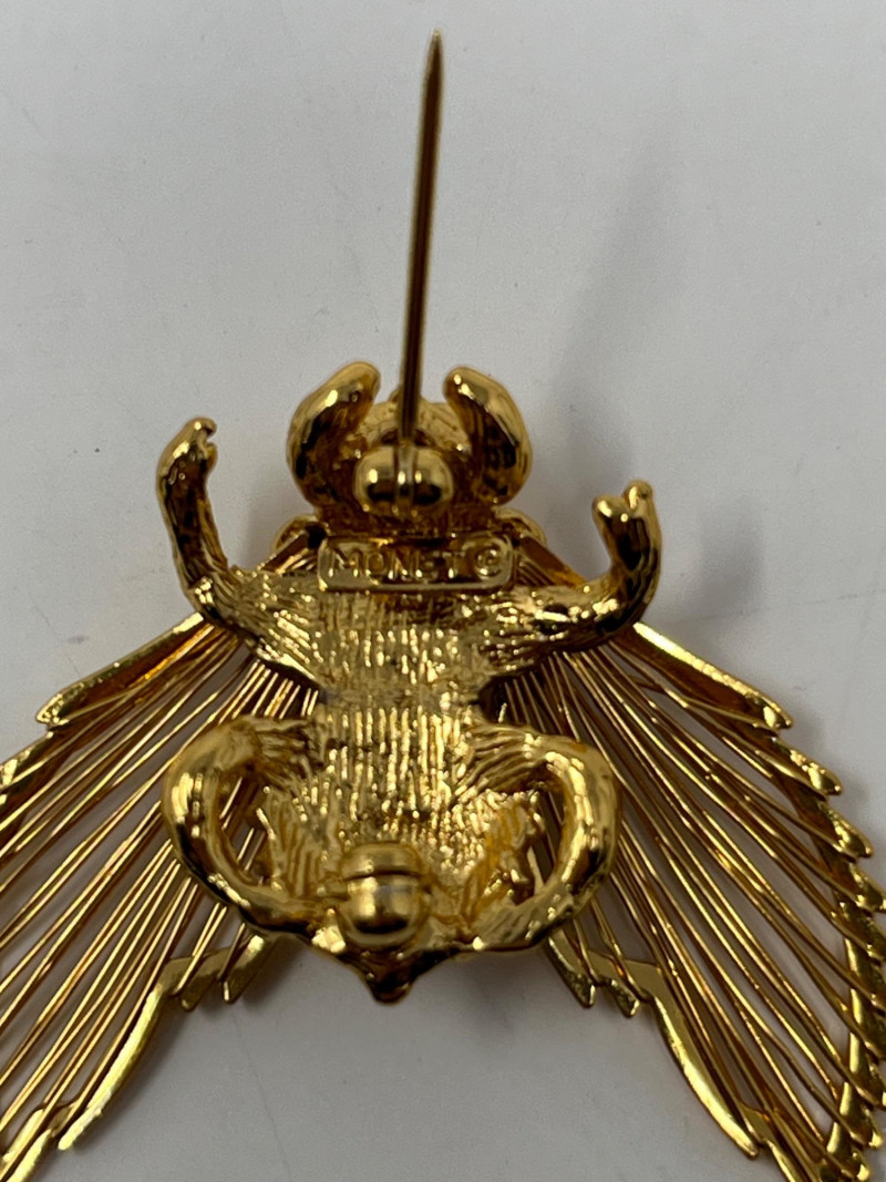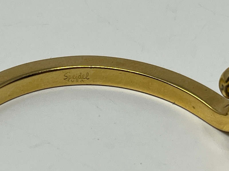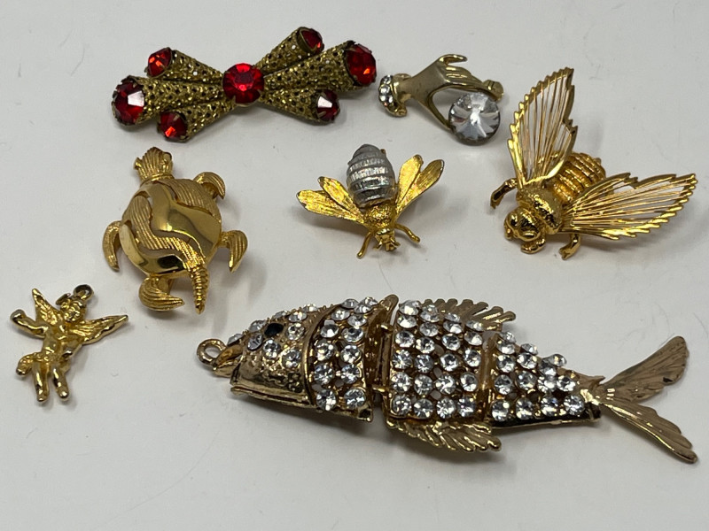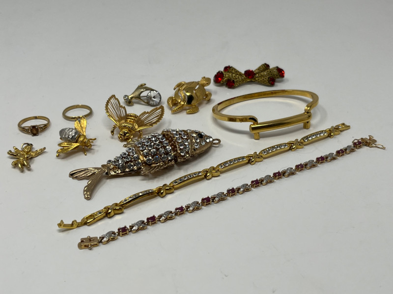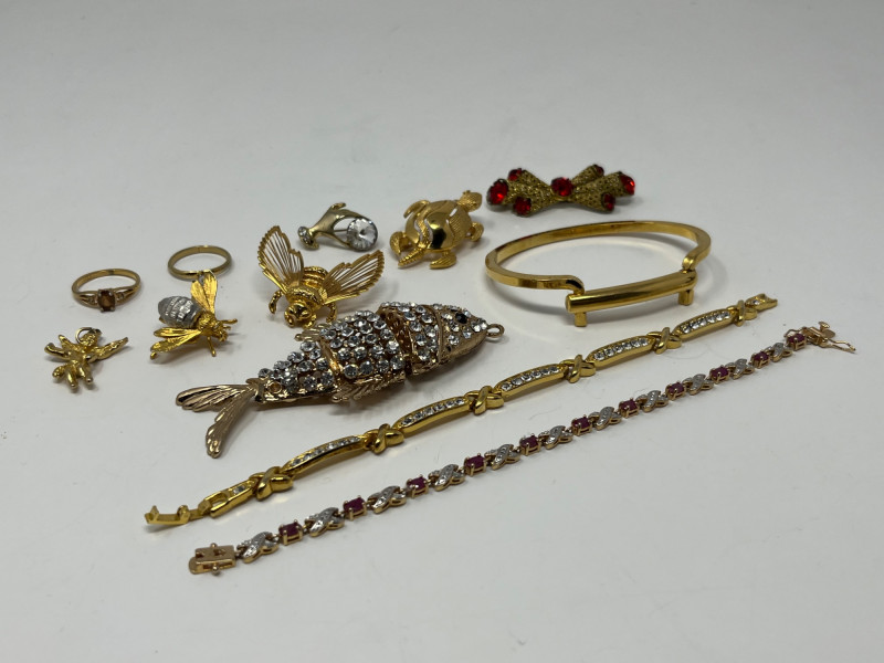 Assorted lot of gold-toned jewelry including bracelets, rings, brooches, and a pendant. Bracelets (3 total): Gold-tone bangle marked Speidel USA Red stone bracelet marked 925 Sterling on clasp Unmarked hinged bracelet with textured finish Rings (2 total): Size 7.5 ring with orange stone, partially worn HGE mark Size 7 gold-tone band with textured center Pendant (1 total): Cupid motif in gold-tone finish Brooches (6 total): Turtle brooch marked Trifari Larger bee brooch marked Monet Hand holding large rhinestone brooch Bow-shaped brooch with textured gold-tone finish marked 251 Fish brooch with embedded rhinestones Insect-themed pin Light wear consistent with age and use. Marks noted where present; other pieces unmarked. Sold as a single lot.