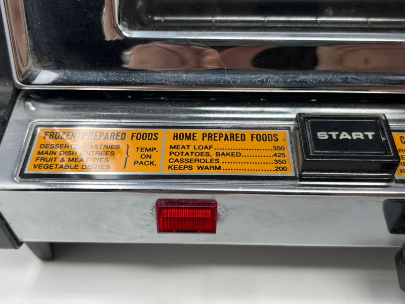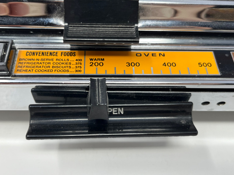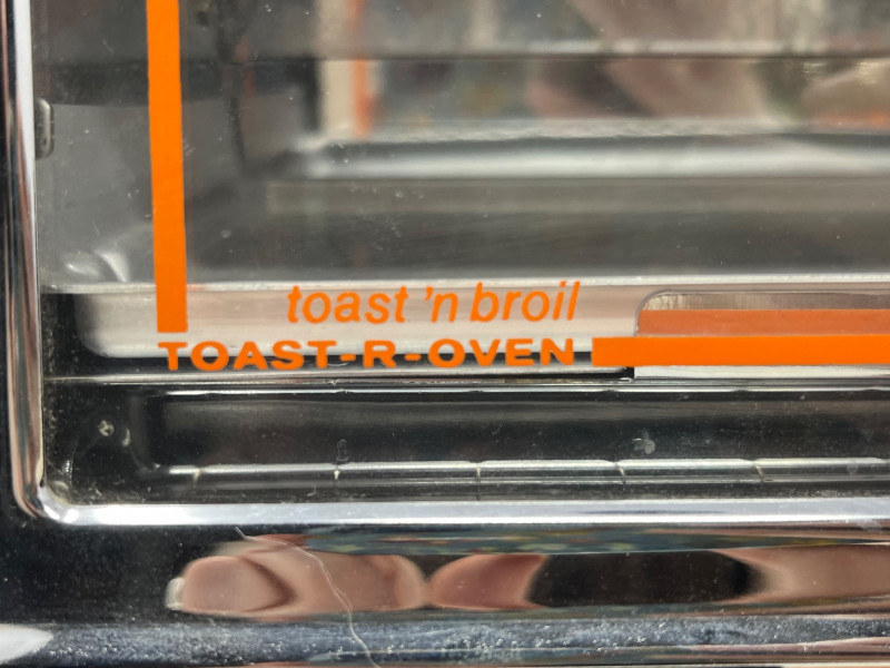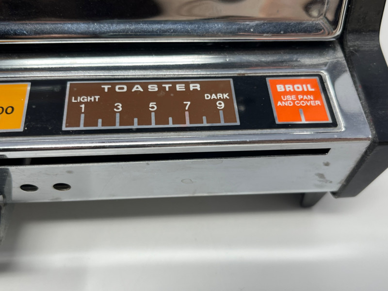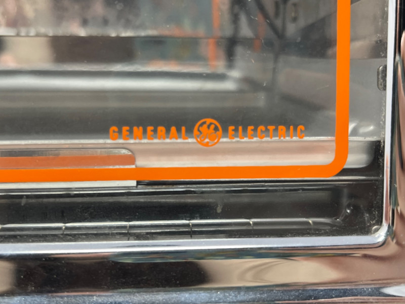 New old stock General Electric “Toast N Broil” countertop toaster oven, never used and preserved in original condition. Classic mid-century design with chrome accents and bold GE branding. Features include: Temperature dial from 200°F to 500°F with dedicated TOASTER setting Functions: BAKE, TOAST, BROIL Front panel marked “OVEN BAKE TEMPERATURE” and “TOAST N BROIL” Safety warnings printed directly on unit: “DO NOT IMMERSE IN WATER,” “USE HANDLES OR KNOBS,” etc. Interior and exterior show typical age-related discoloration from long-term storage; no signs of active use Ideal for collectors of vintage kitchen appliances or GE memorabilia. Untested but appears complete. Sold as-is.