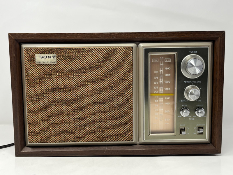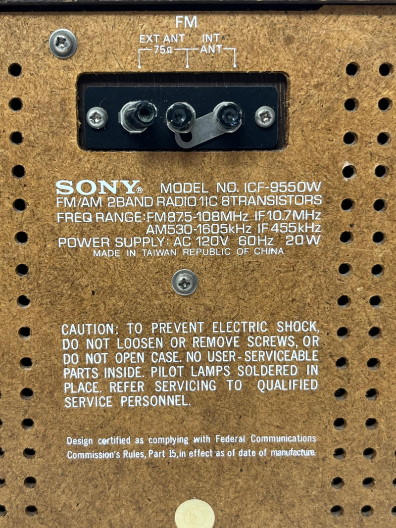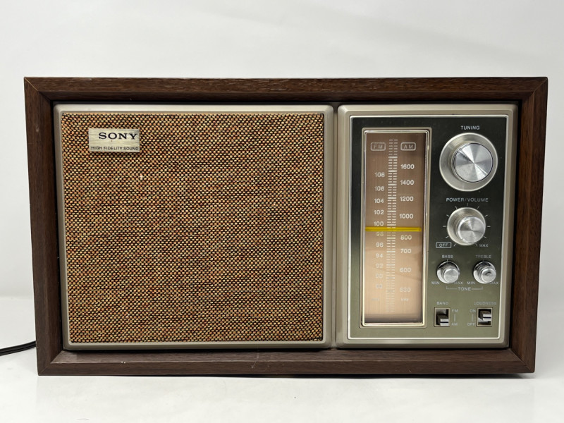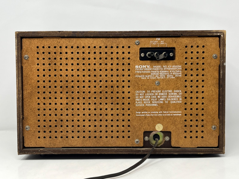 Classic Sony FM/AM tabletop radio receiver, model ICF-9550W, featuring a warm wood cabinet, woven speaker grille, and analog tuning dial. The front panel is marked “SONY HIGH FIDELITY SOUND,” with tactile tuning and volume knobs and a clear frequency display. Rear panel includes FM EXT ANT and INT ANT ports, caution label, and full band specs. Frequency Range: FM 87.5–108MHz / AM 530–1710kHz Power Supply: AC 120V 60Hz 20W Made in Japan – FCC certified design Tested and fully functional. Light cosmetic wear consistent with age. A handsome mid-century piece for collectors, audiophiles, or vintage décor.
