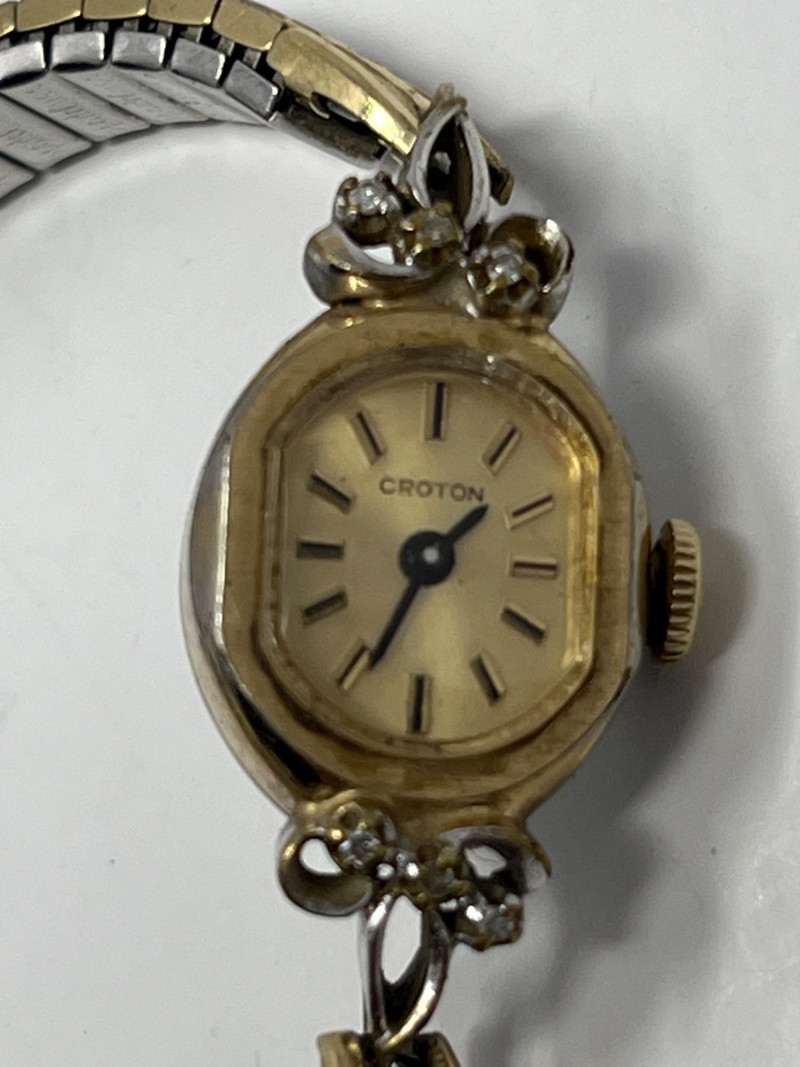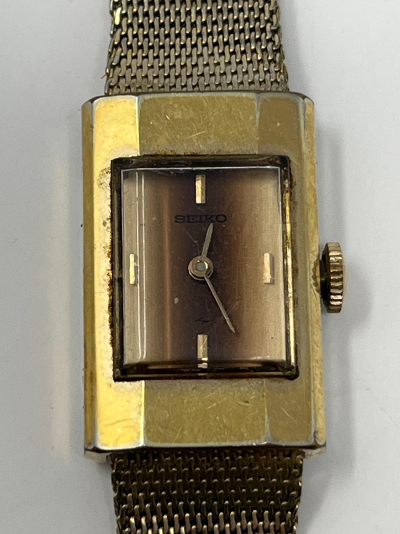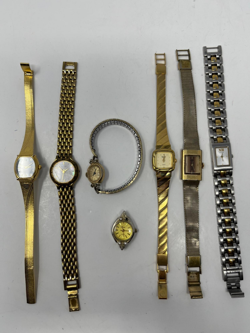 Estate lot of seven women’s wristwatches in mixed styles and finishes. Brands include Pulsar (2), Gruen, Croton, Seiko, and additional unbranded pieces. Most watches are gold‑tone, with one Pulsar in silver‑tone. One watch is missing its strap. All are untested and should be assumed to require batteries and/or servicing. Details: Total of 7 women’s wristwatches Brands present: Pulsar (2), Gruen, Croton, Seiko, etc Gold‑tone finish on all watches except one silver‑tone Pulsar Mixed case shapes and dial styles One watch missing its strap Estate‑found condition with wear consistent with age and use Untested; assume all require batteries and/or service Offered as found for collectors, resellers, or parts/repair