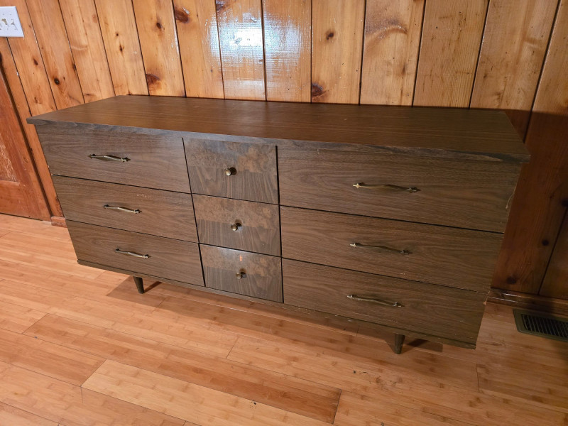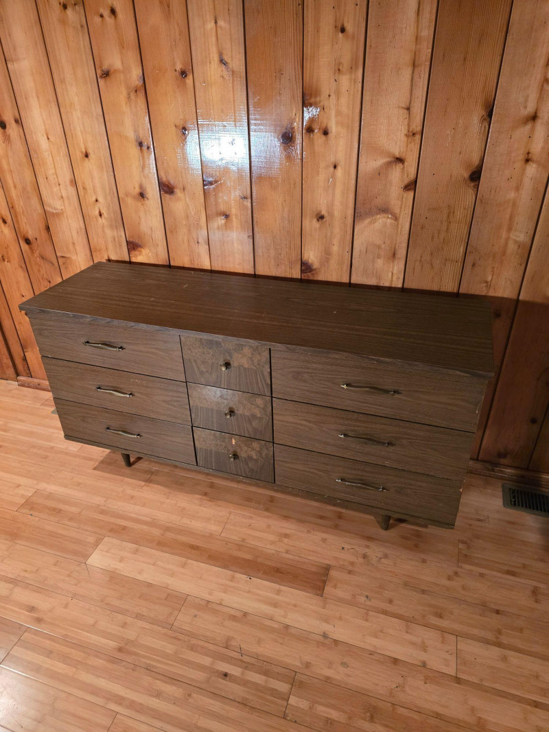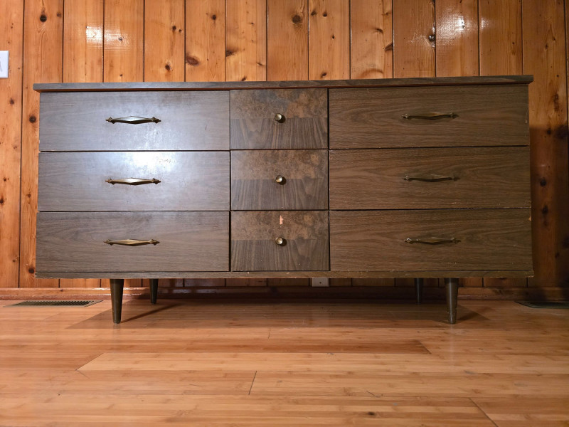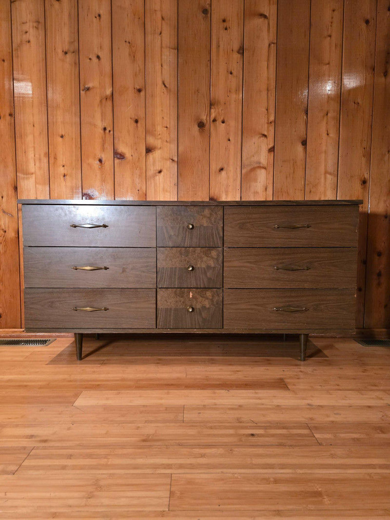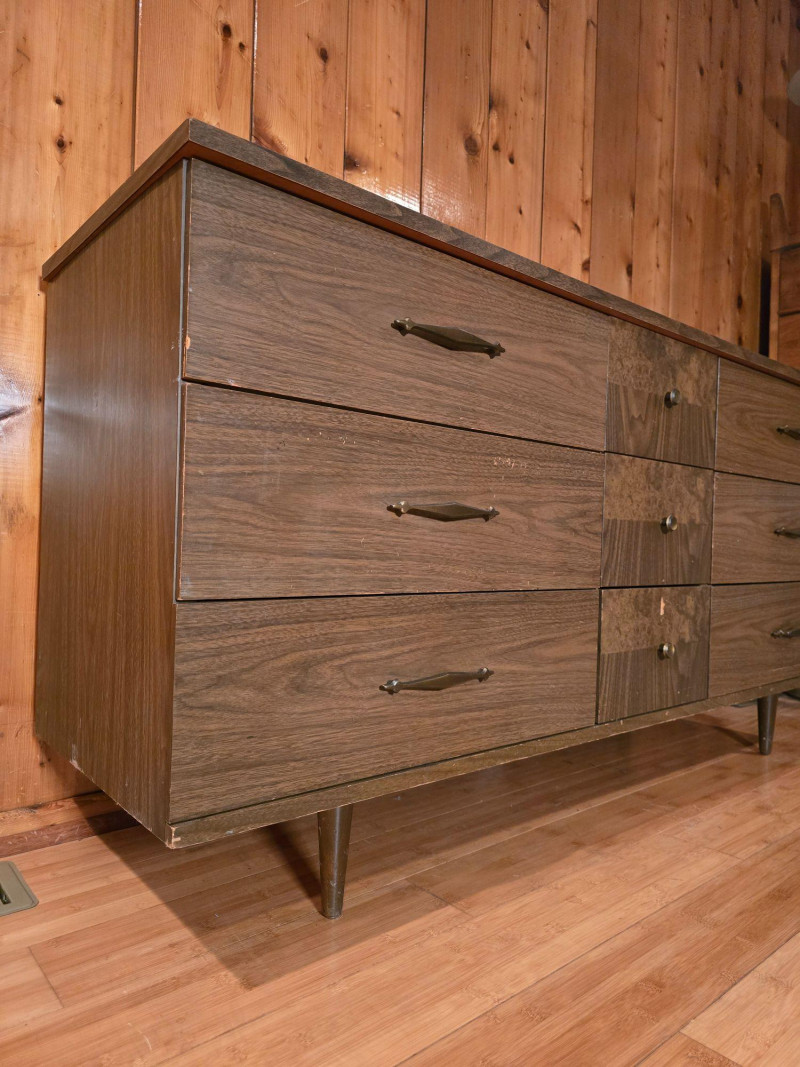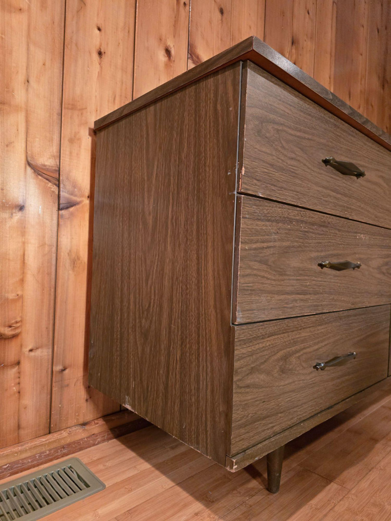 Authentic Mid‑Century Modern dresser with the clean planar surfaces and understated hardware typical of late‑1950s to early‑1960s casework. The piece features a compact, functional footprint with three full‑depth drawers, each built with the straightforward joinery and material choices common to mid‑century production. The warm wood finish retains its original character, making it a strong candidate for collectors seeking period‑correct pieces or restorers looking for a structurally sound foundation. The exterior shows small chips and wear consistent with age; all photographed for accuracy. Drawer operation is smooth, and the case remains sturdy, offering an excellent balance of original patina and restoration potential for MCM enthusiasts.
