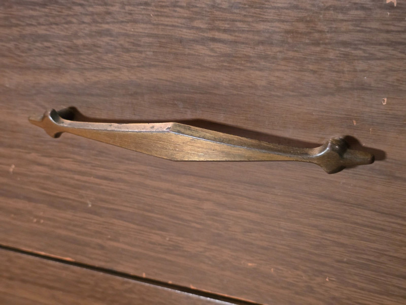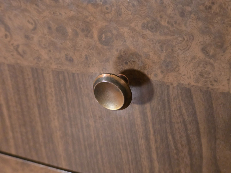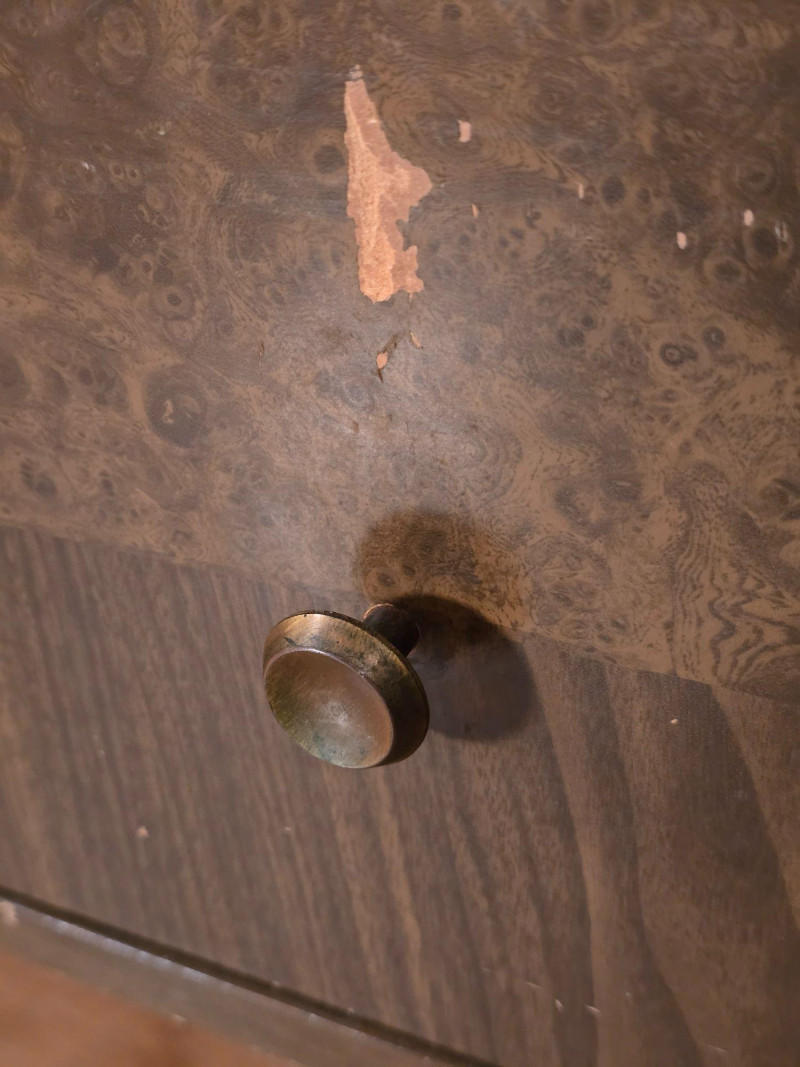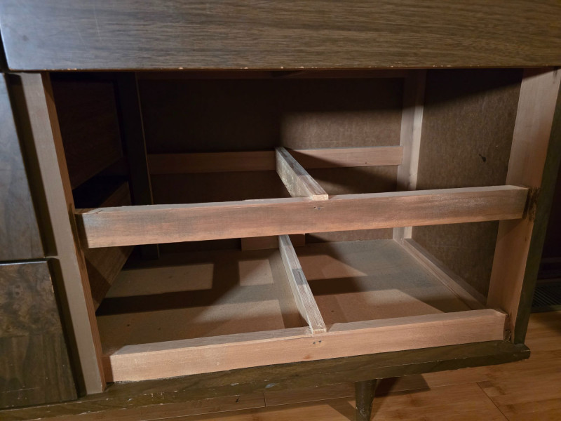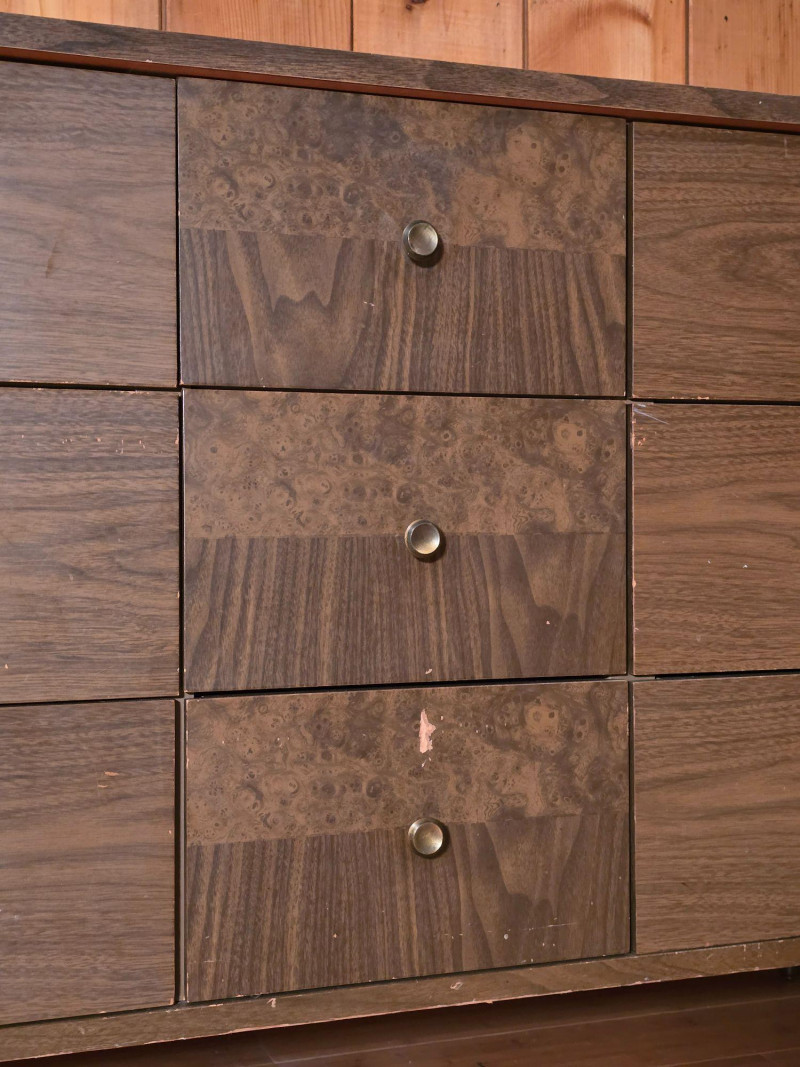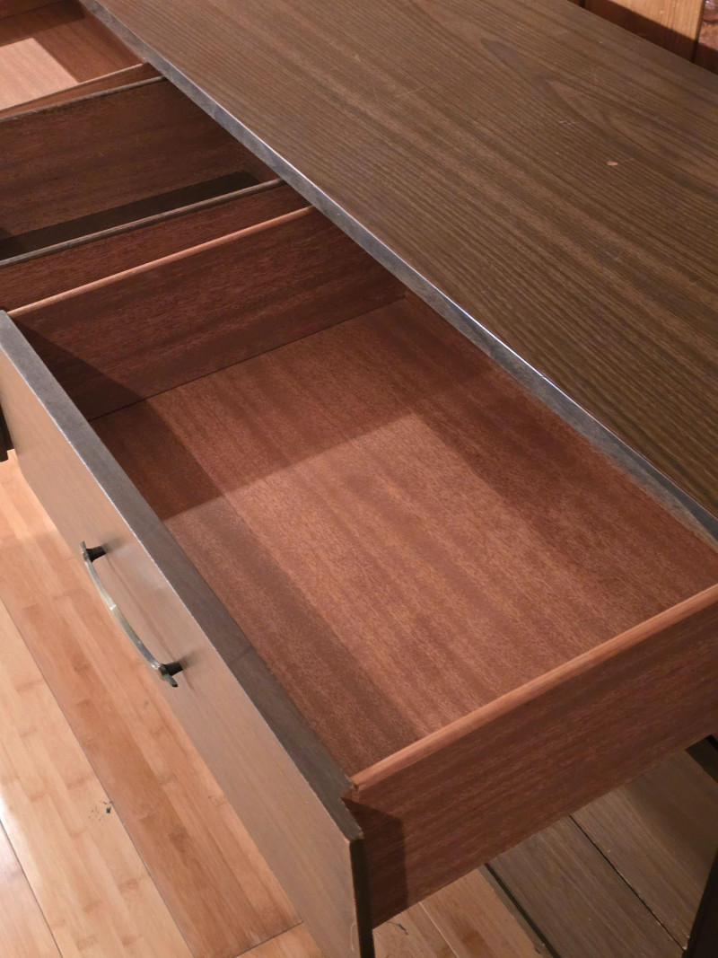 Authentic Mid‑Century Modern dresser with the clean planar surfaces and understated hardware typical of late‑1950s to early‑1960s casework. The piece features a compact, functional footprint with three full‑depth drawers, each built with the straightforward joinery and material choices common to mid‑century production. The warm wood finish retains its original character, making it a strong candidate for collectors seeking period‑correct pieces or restorers looking for a structurally sound foundation. The exterior shows small chips and wear consistent with age; all photographed for accuracy. Drawer operation is smooth, and the case remains sturdy, offering an excellent balance of original patina and restoration potential for MCM enthusiasts.