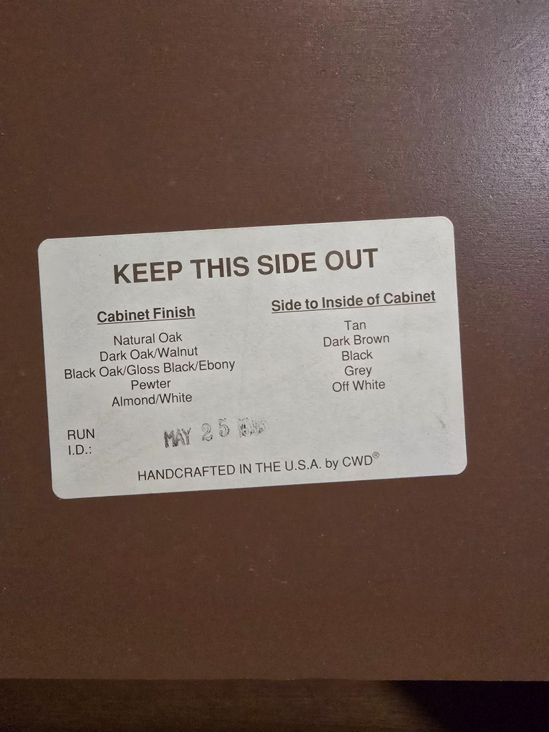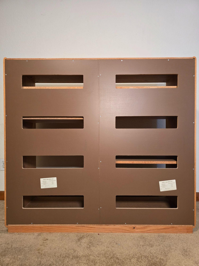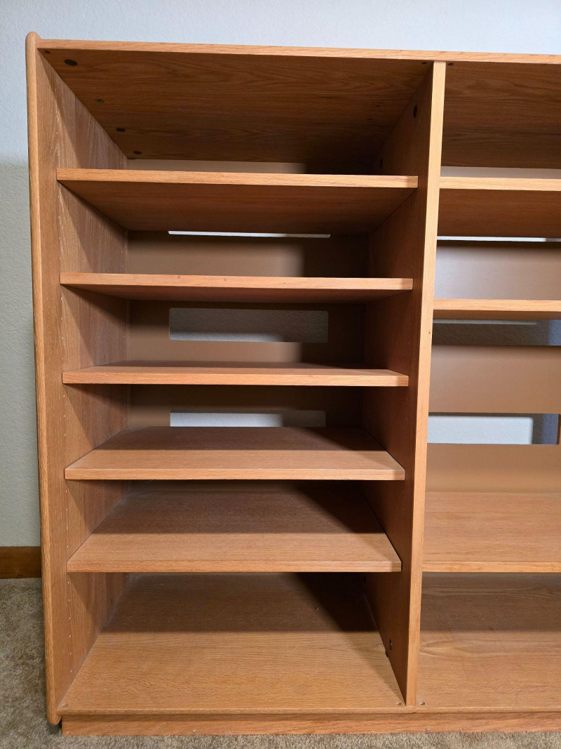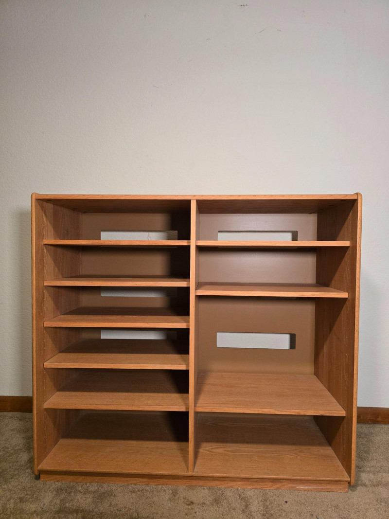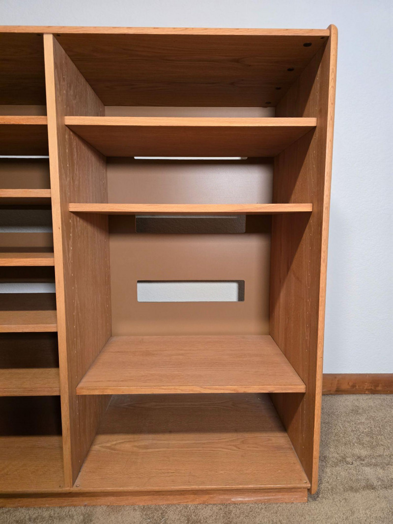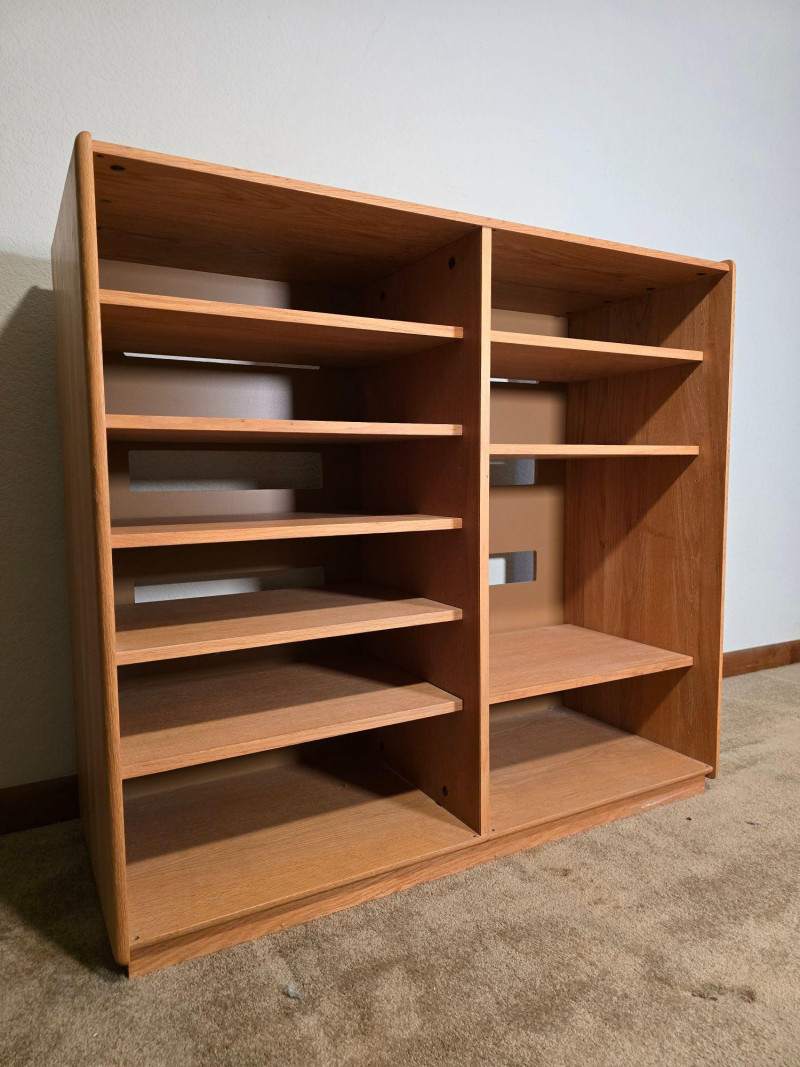 Well‑built wooden cabinet / shelving unit marked on the back “By: Custom Woodwork & Design Inc.” Features a warm oak finish, factory‑cut rear openings, and a sturdy multi‑shelf layout suitable for media components, display, or general storage. The back panel includes the original manufacturer label noting finish, orientation, and cut‑out specifications. Maker mark on back: Custom Woodwork & Design Inc. Finish: Warm Oak (121) Back panel: Factory orientation with factory cut‑outs for cable routing or ventilation Multi‑shelf configuration with open front Rectangular rear cut‑outs aligned across shelves Solid, stable construction with clean lines and a functional footprint Includes original assembly label on the back panel Light general wear consistent with use. No structural issues observed. Back panel and cut‑outs are intact and factory‑finished. A versatile, well‑constructed piece from a custom woodworking shop—ideal for media, office, or workshop organization.Details