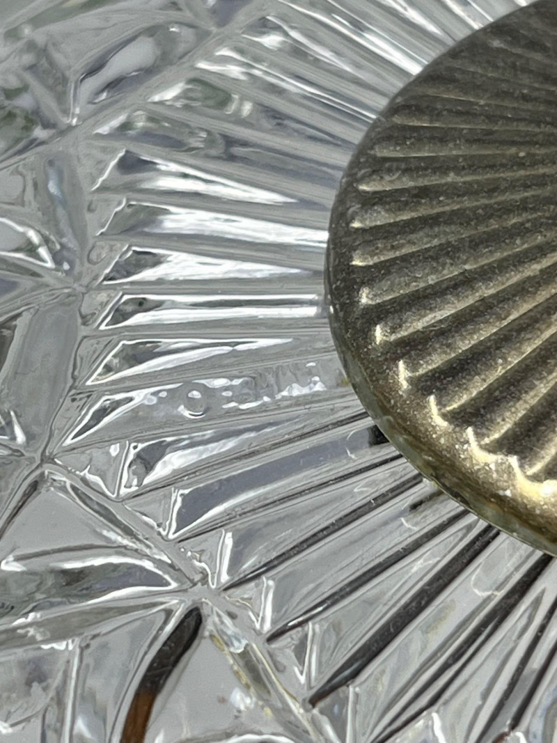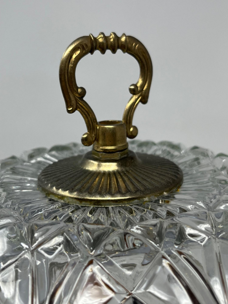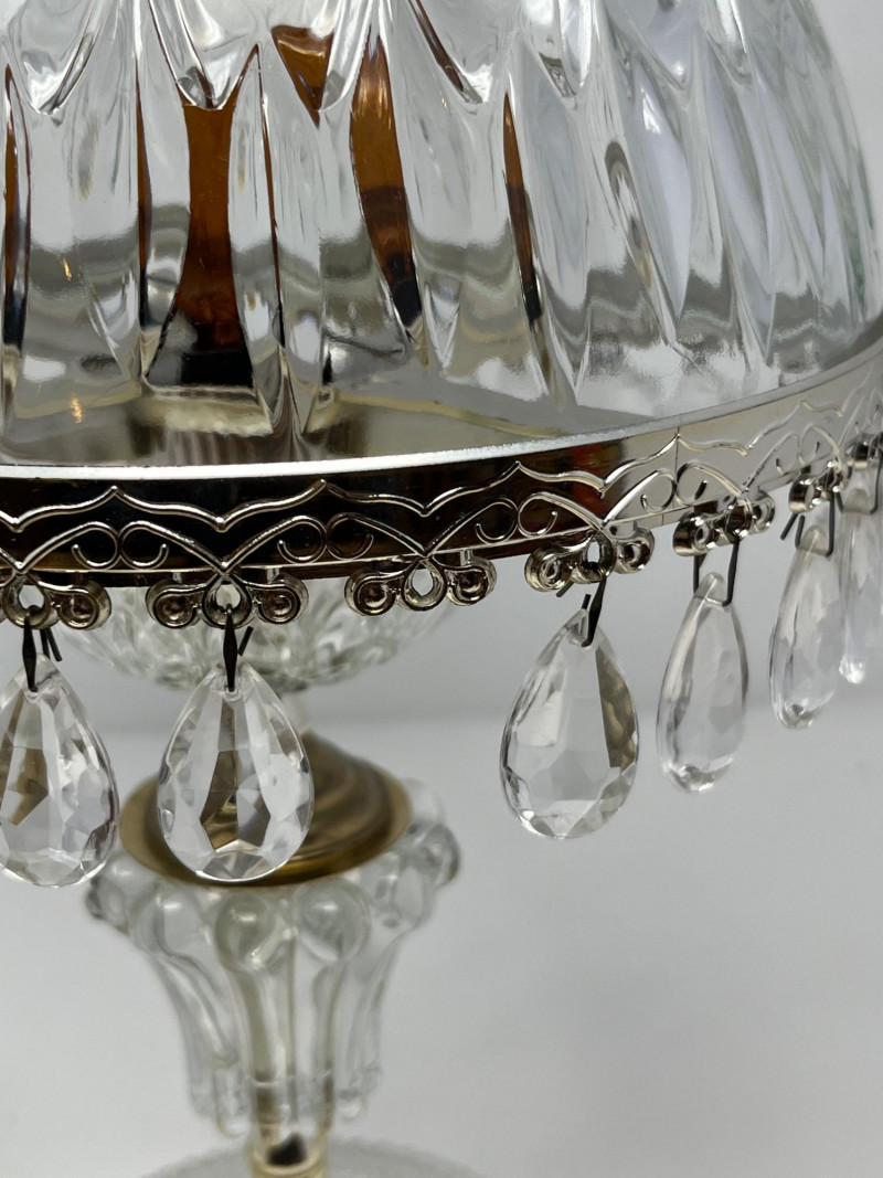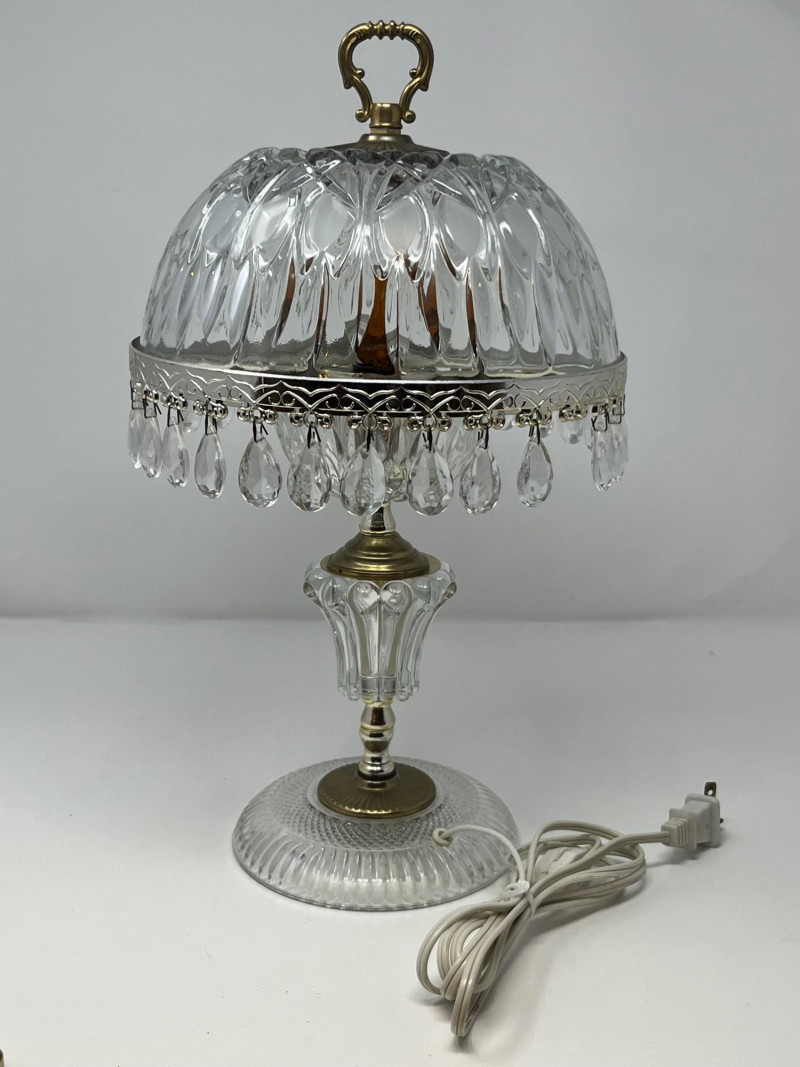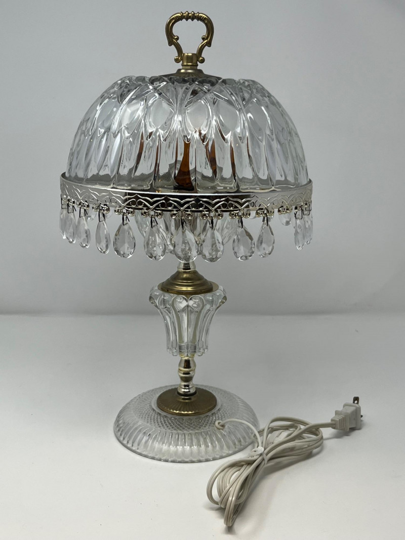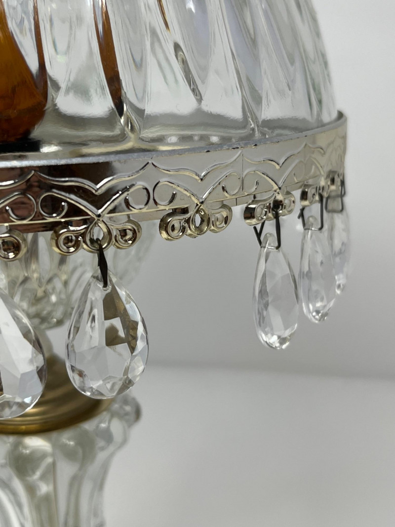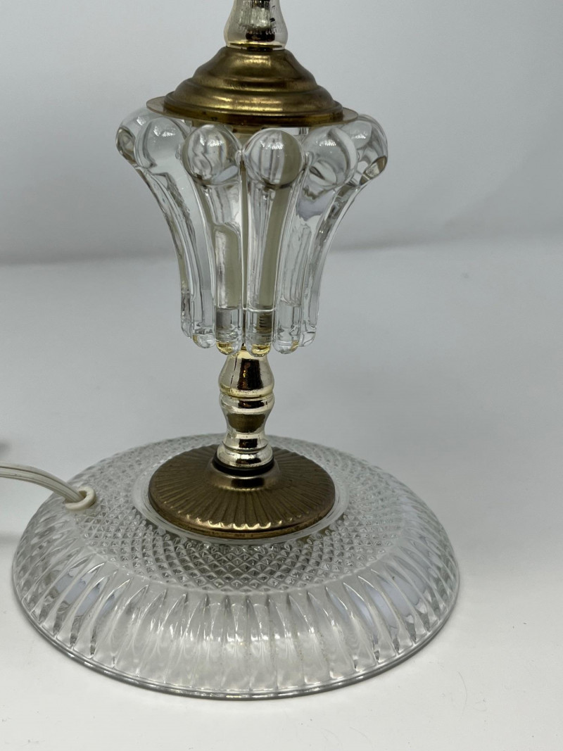 Charming mid‑century glass table lamp featuring a molded glass shade with hanging glass prisms and a coordinating glass base with brass detailing. The lamp offers classic boudoir or parlor styling with warm, decorative appeal. Two of the hanging glass prisms are missing, and there is a faint mark on the top finial that may indicate a maker, though it is not legible enough to confirm attribution. Design: Molded glass shade with hanging glass prisms; glass base with brass accents Condition: Good vintage condition; working corded power; two prisms missing; light surface wear from age Notable Features: All‑glass construction (shade, prisms, and base) Brass finial with an indistinct mark that may be a maker’s stamp (unconfirmed) Inline switch on cord Era/Style: Mid‑Century Italian‑influenced boudoir / Hollywood Regency lighting This lamp aligns with mid‑century Italian and Hollywood Regency glass lighting, often produced by small Italian workshops and import houses during the 1950s–1970s. The mark on the finial is not clear enough to identify a specific maker, but the materials and construction are consistent with Italian‑style decorative lamps of the period. Please review all photos for condition and completeness. Sold as‑is.Item Details