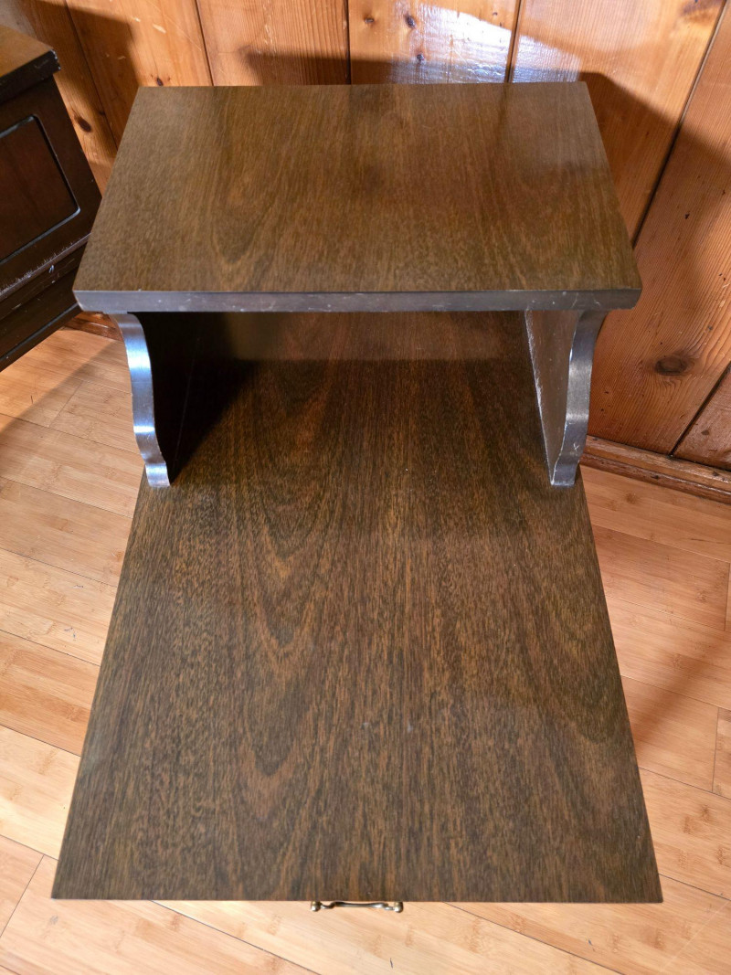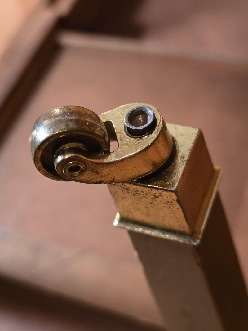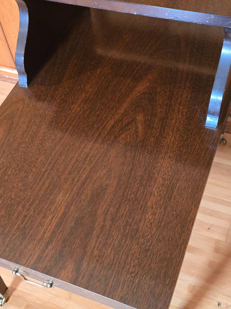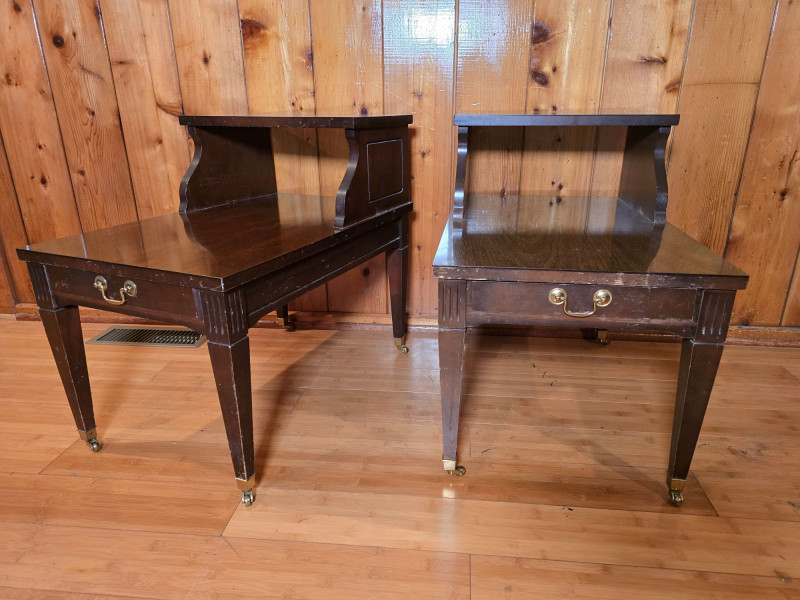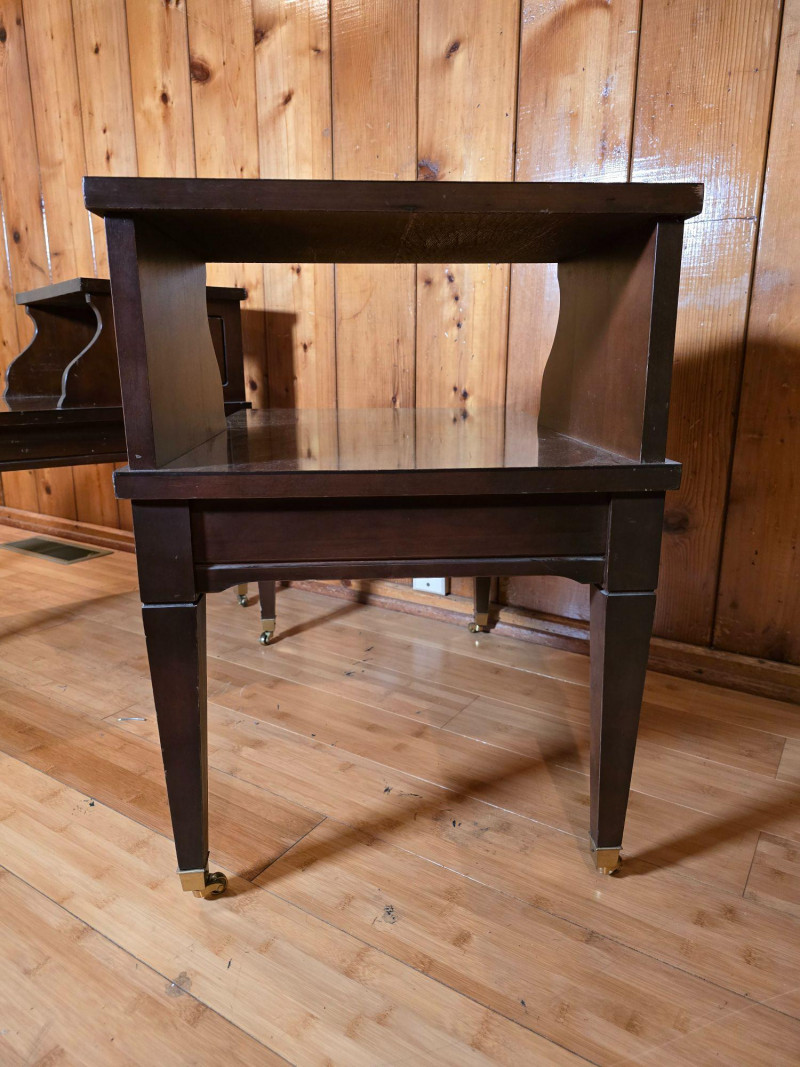 Visible vintage wear on surfaces and edges; finish variation between tables; wear photographed. Details: Maker: Mersman Style: Tiered side tables Features: Branded underside; brass caster wheels Quantity: 2 tables Condition consistent with age and use