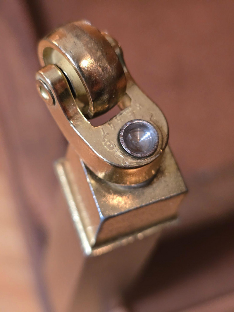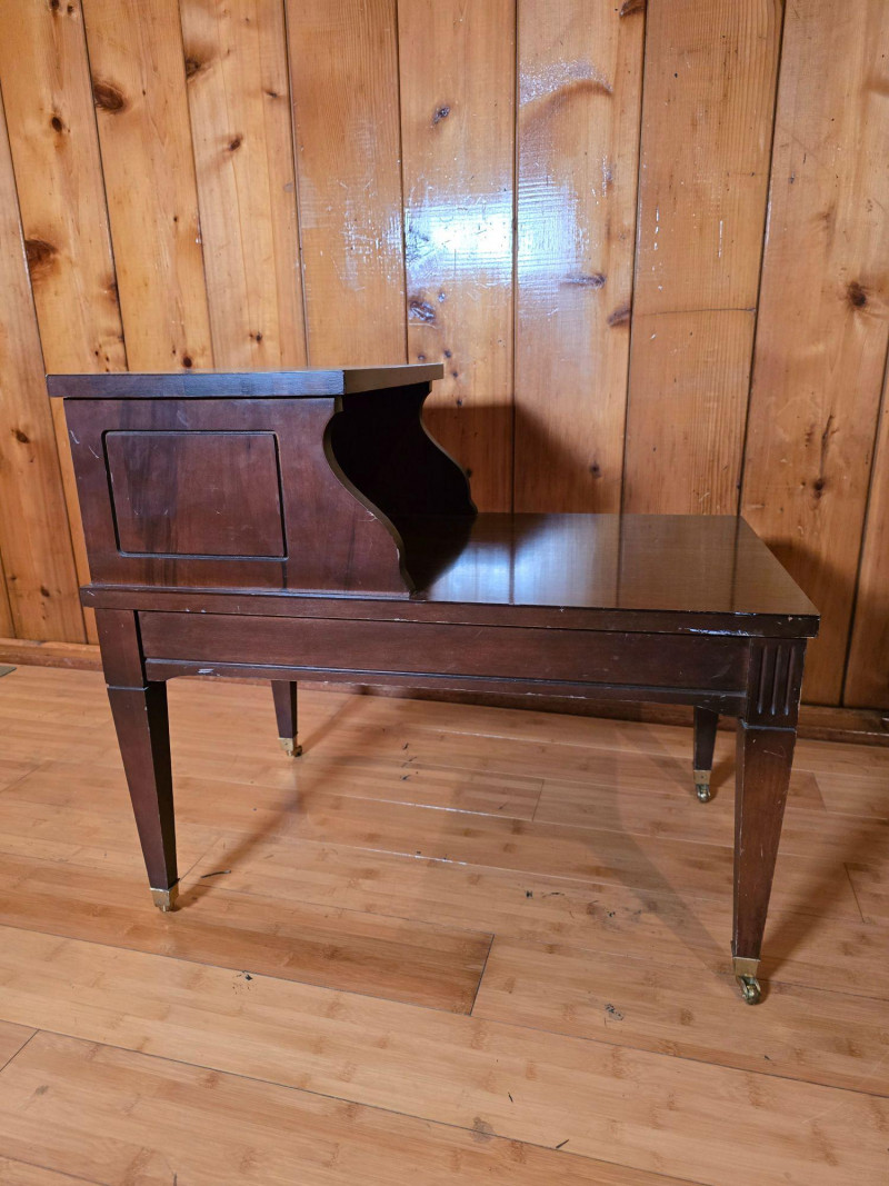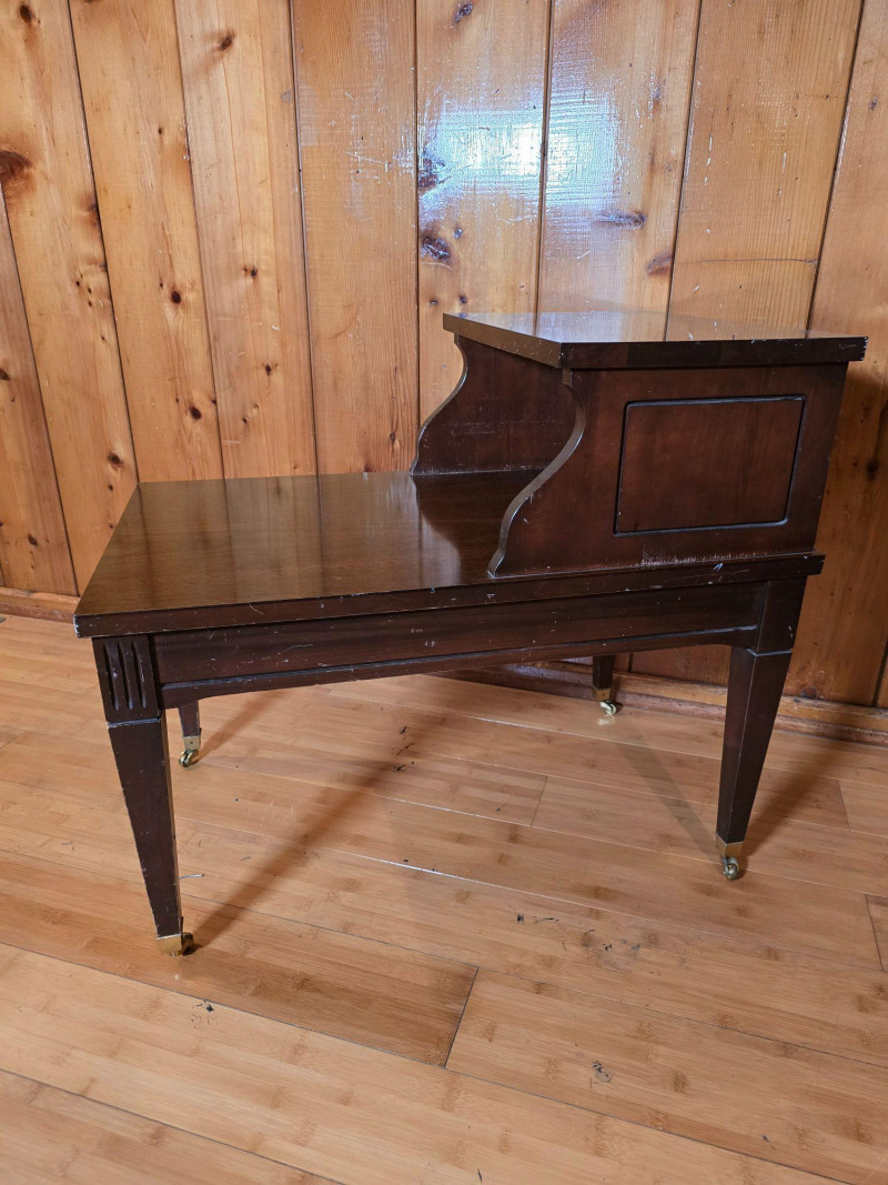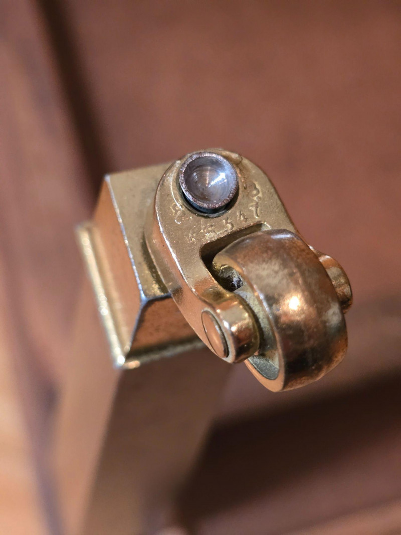 Visible vintage wear on surfaces and edges; finish variation between tables; wear photographed. Details: Maker: Mersman Style: Tiered side tables Features: Branded underside; brass caster wheels Quantity: 2 tables Condition consistent with age and use