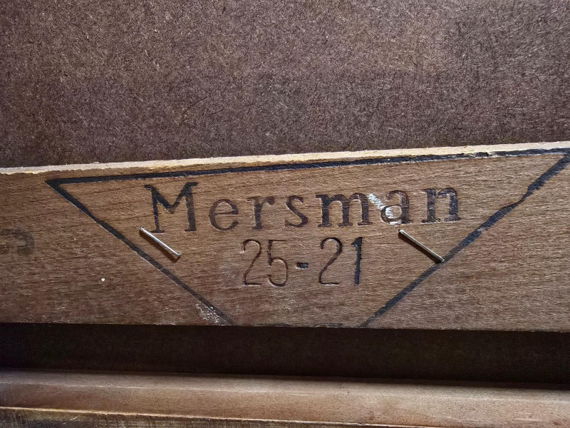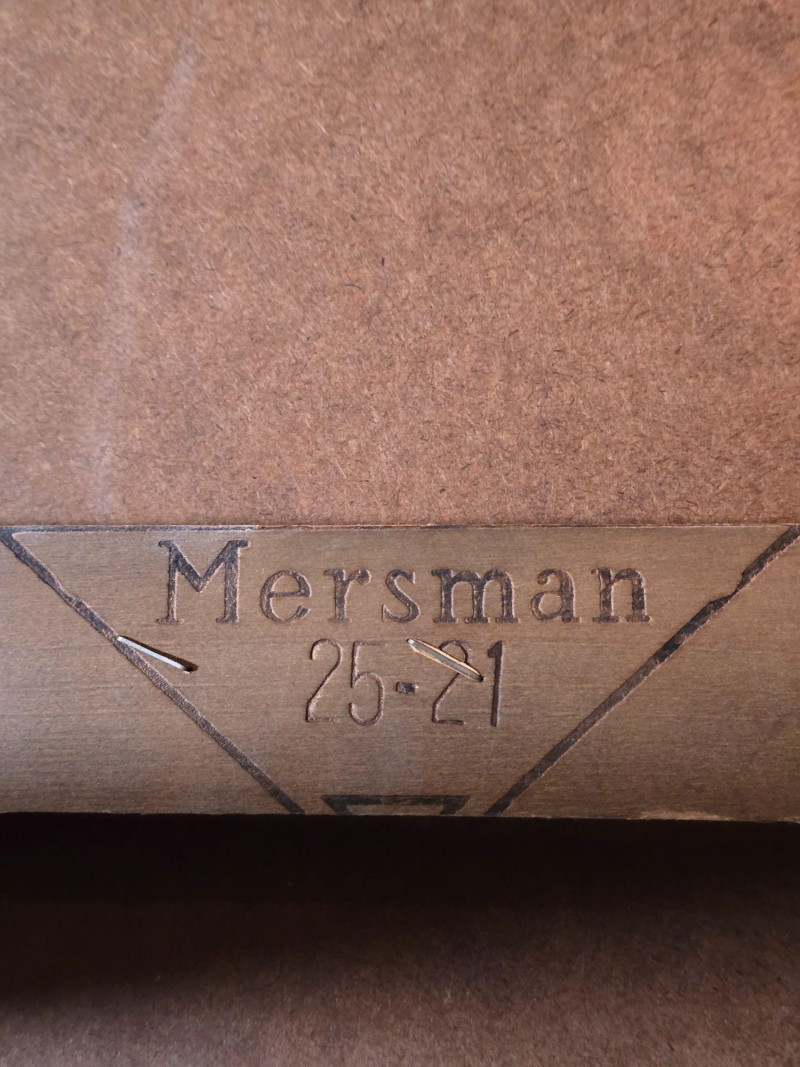 Pair of classic tiered side tables by Mersman, each featuring the maker’s branded mark on the underside and original brass caster wheels. Both tables show vintage wear consistent with age and use, and the stain tone differs between the two pieces. Solid, well‑constructed forms with the traditional Mersman profile. Condition: