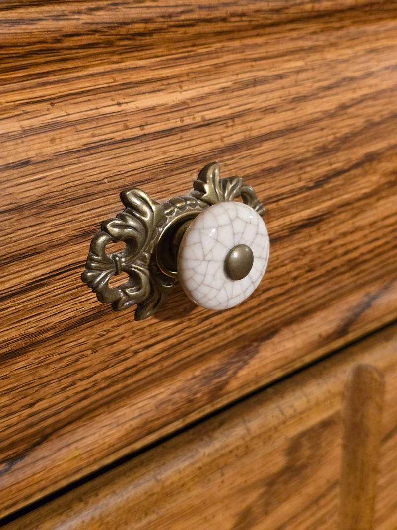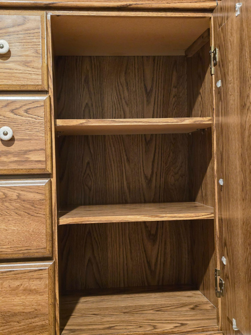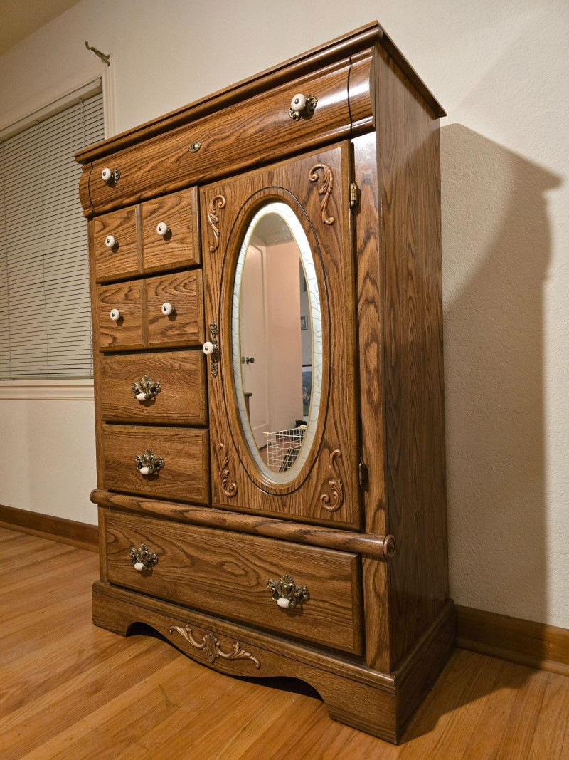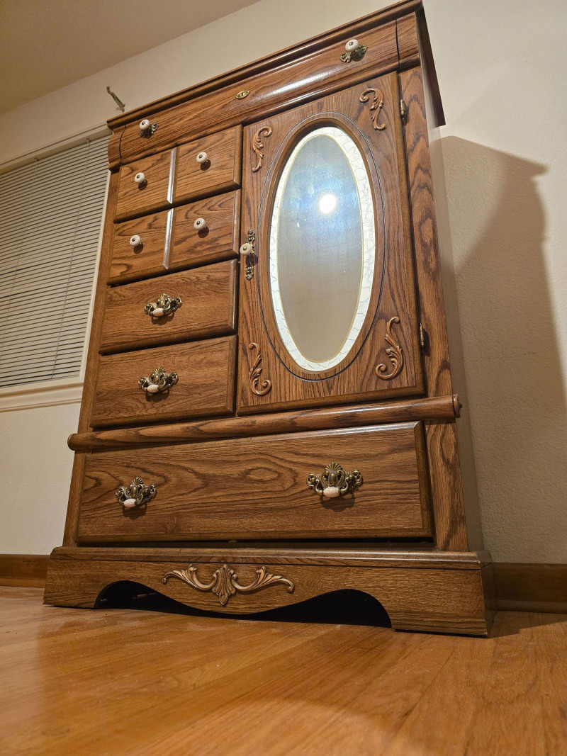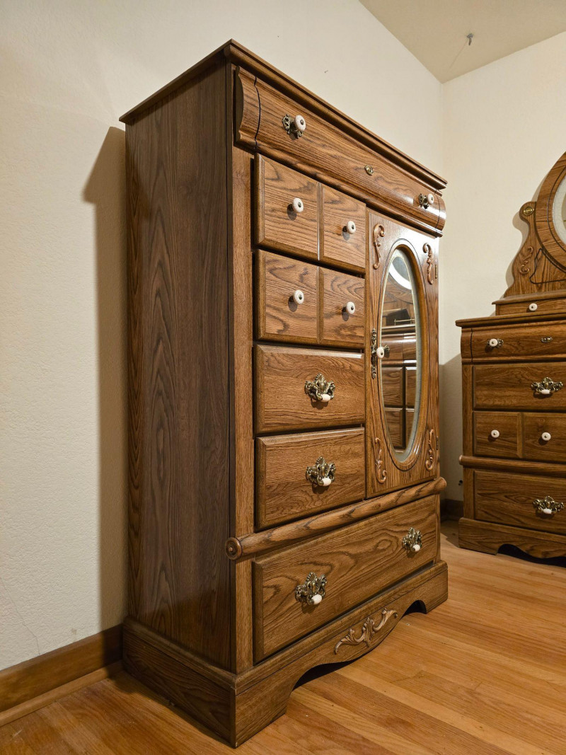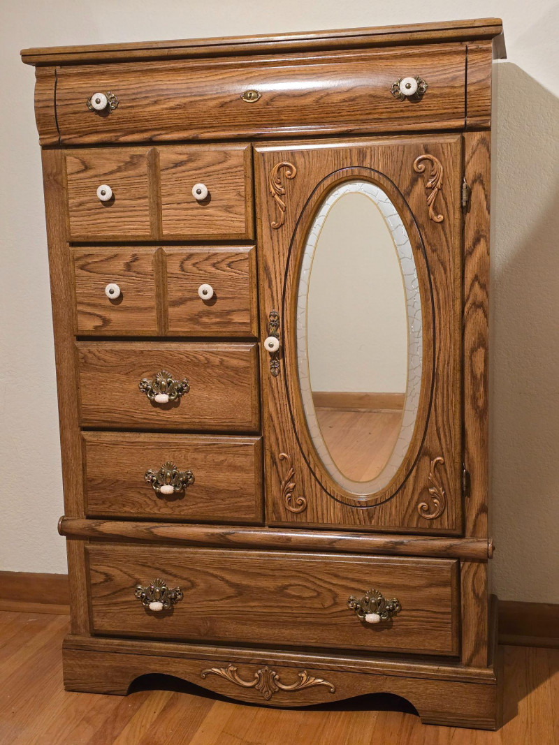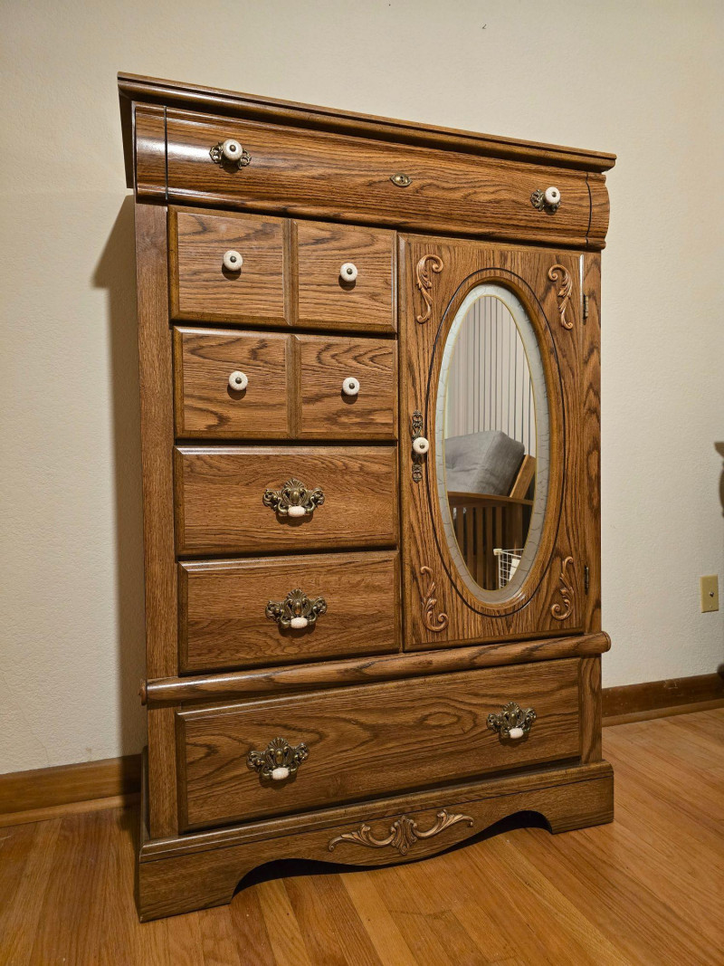 A classic, well‑crafted wooden dresser featuring an attached oval mirror and traditional carved detailing. This piece offers generous storage with multiple drawers, ornate metal pulls, and a warm medium‑tone finish that highlights the natural wood grain. The mirror frame includes decorative scrollwork, adding a refined vintage character suitable for bedroom, dressing room, or boutique display use. Solid wood construction with medium‑tone finish Oval attached mirror with carved decorative surround Multiple drawers with ornate metal pulls Scalloped lower apron and classic profile Sturdy overall build with smooth drawer operation Rear panel in standard estate‑era material Overall good vintage condition with expected wear consistent with age and use. Finish shows light surface marks. Mirror is clear with no major defects. Drawers open and close properly. Back panel shows typical material variation for the era. A timeless dresser with strong visual presence and practical storage. Ideal for collectors, decorators, or anyone seeking a vintage statement piece.Features