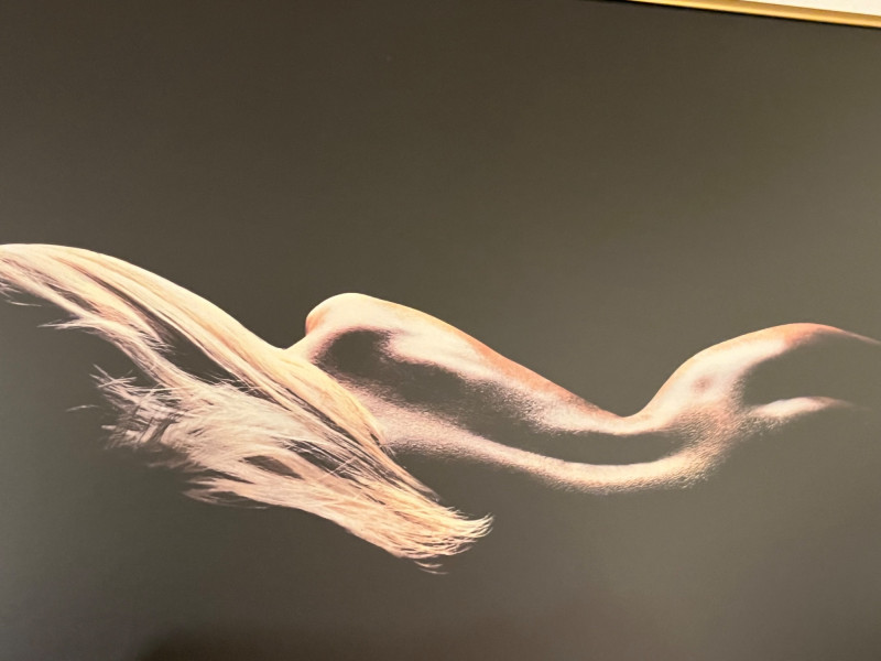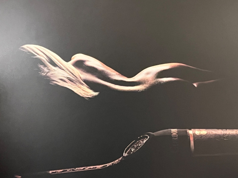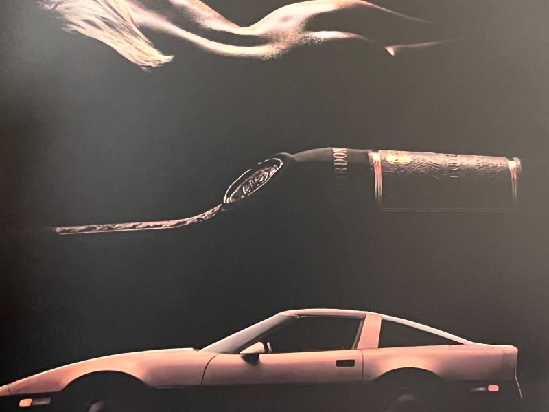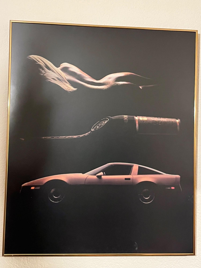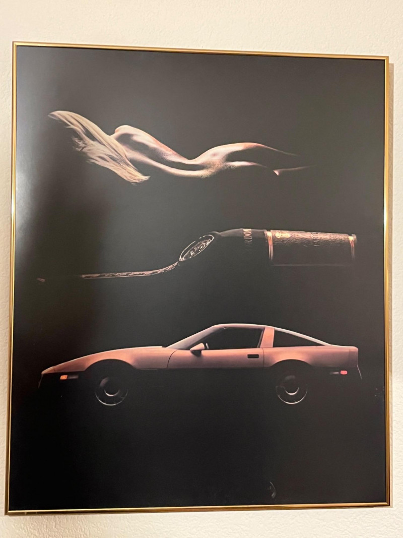 Striking framed photographic artwork blending figurative form with symbolic objects in a surreal, atmospheric composition. The piece features a reclining figure captured from behind in a tasteful, fine‑art manner, paired with a wine bottle and a stylized automobile. The juxtaposition of elements creates a narrative tension between stillness, indulgence, and motion. Rendered in dramatic lighting with smooth tonal transitions, the image emphasizes shape, contour, and contrast rather than detail, giving it a refined gallery aesthetic. The work is presented in a substantial frame suitable for display in contemporary, eclectic, or modern interiors. Medium: Photographic print Presentation: Professionally framed Subject: Figurative composition with symbolic objects Condition: Frame and artwork in good overall condition; minor wear consistent with display A compelling addition for collectors of surrealist photography, modern figurative art, or mixed‑symbol compositions.Details
