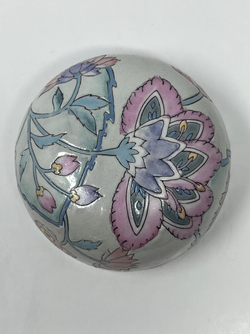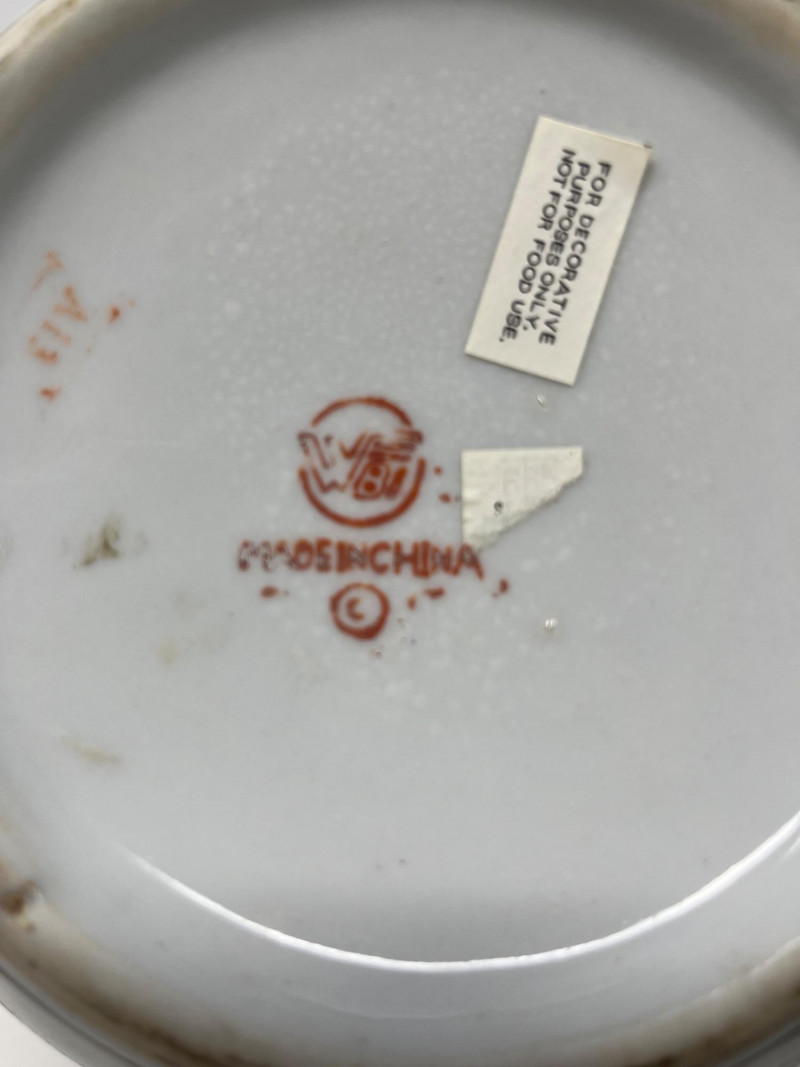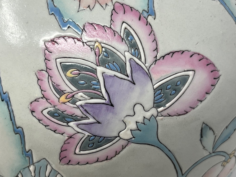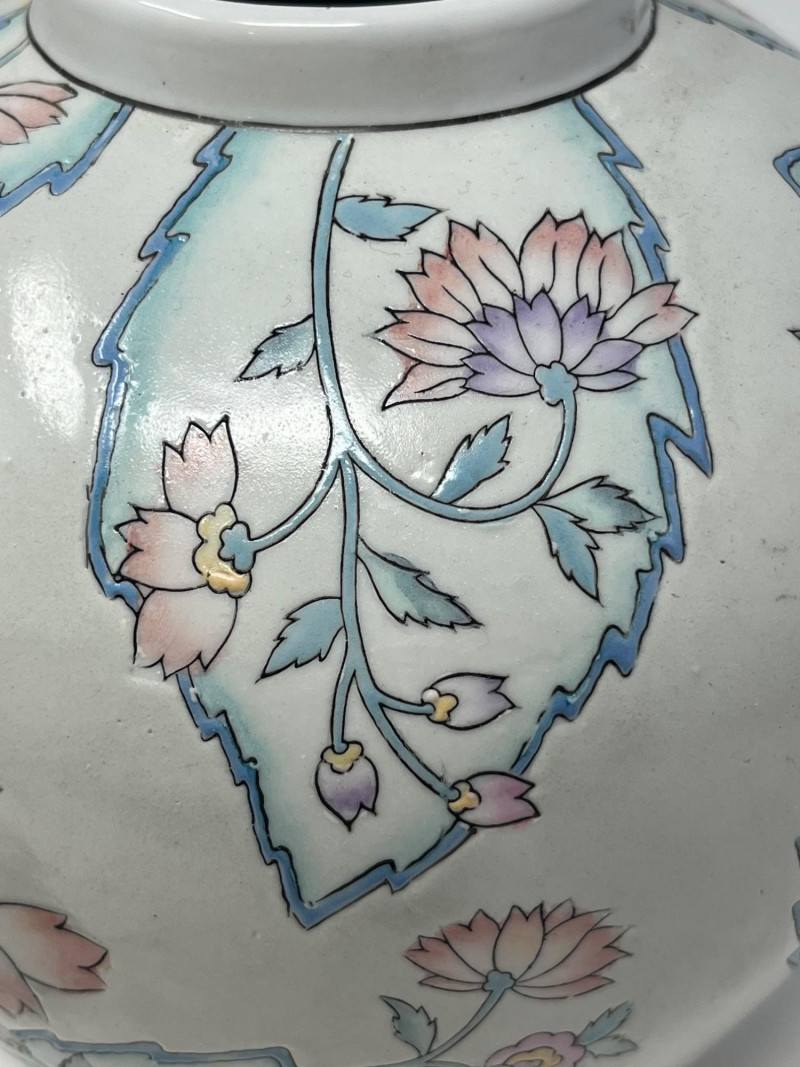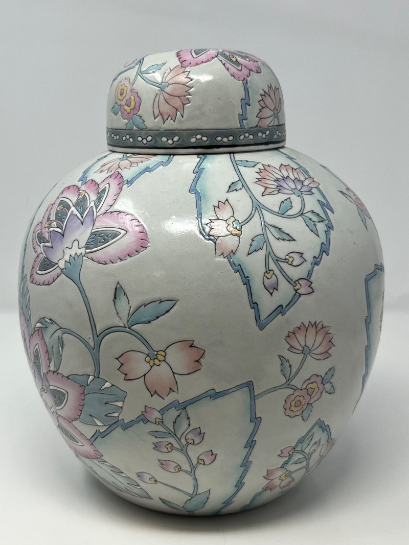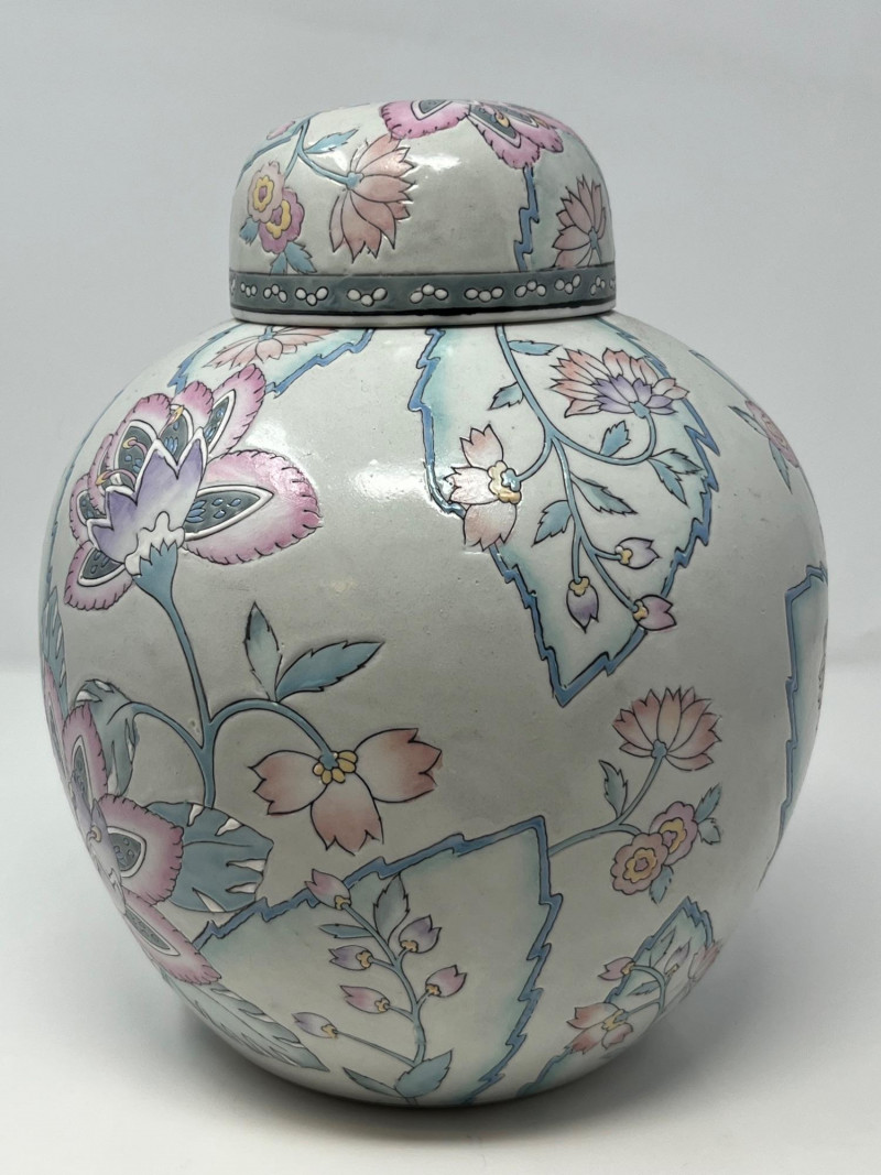 Historical Notes: Ceramic jars of this style were commonly produced in China during the late 20th century, reflecting a period when traditional decorative motifs were adapted for export markets. Floral themes—especially peonies, plum blossoms, and stylized garden florals—were favored for their associations with harmony, renewal, and domestic beauty. Factories during this era often blended hand‑applied detailing with standardized forms, resulting in pieces that balance artistry with everyday functionality. Items marked with red stamped seals, like this example, typically indicate workshop branding or regional identifiers used for export distribution.