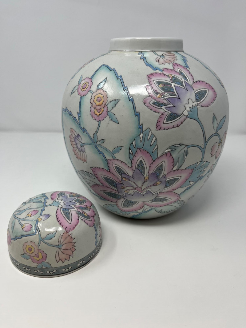 This jar represents the type of decorative household ceramic that became popular in Western homes for its soft color palette, approachable design, and versatility as both décor and storage. It remains a charming example of late‑century Chinese ceramic craftsmanship.