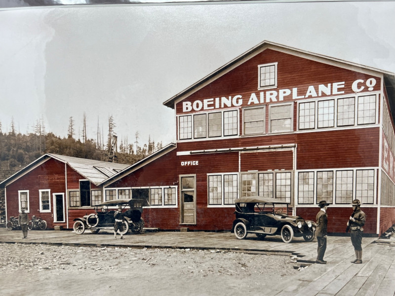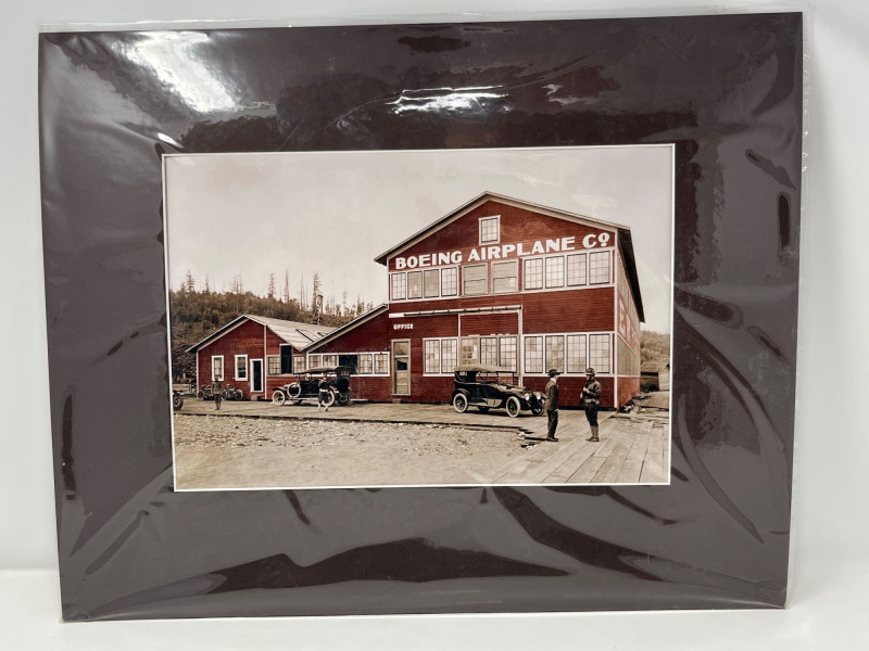 A striking vintage print of the historic Boeing Airplane Company building, featuring classic automobiles and period figures in front of the iconic red-and-white façade. The image is crisp and well-preserved, with strong visual clarity and nostalgic appeal. Presented under plastic in its original matting and frame. A light surface scratch on the plastic has caused a subtle indentation in the matting near the image border. The print itself remains unaffected and in excellent condition. Ideal for collectors of aviation history, Northwest industrial heritage, or vintage Americana. Condition Notes