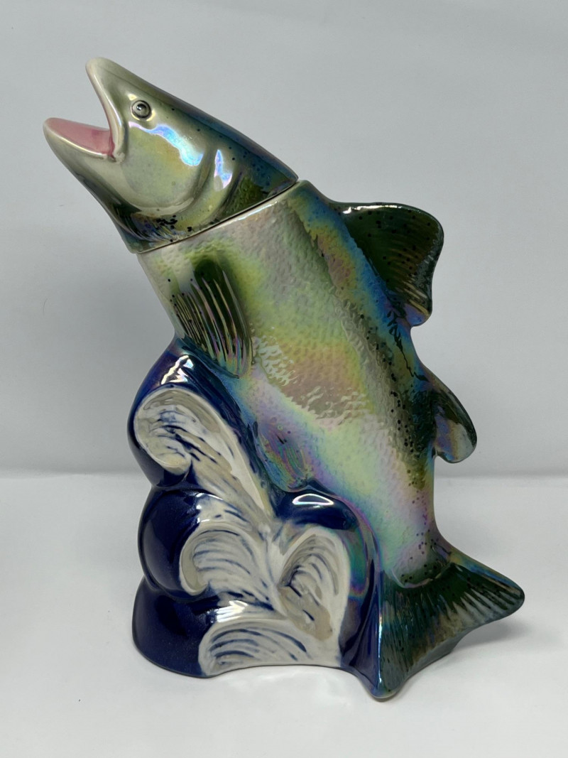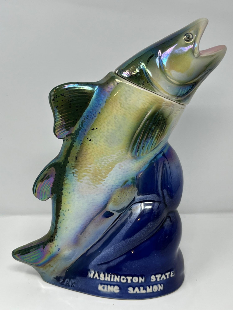 • Ezra Brooks 1973 King Salmon Decanter – Marked underside with “EZRA BROOKS 1973 WASHINGTON STATE KING SALMON.” Sculpted in lifelike motion with rich coloration.