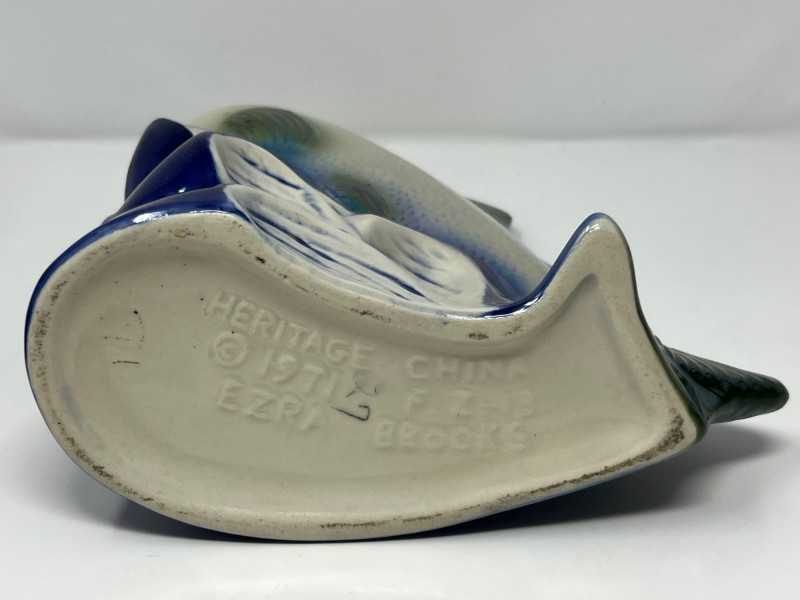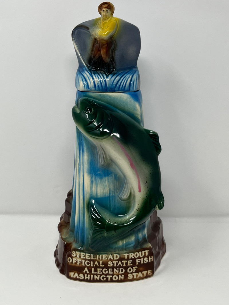 • Steelhead Trout Decanter – Features raised lettering: “STEELHEAD TROUT – OFFICIAL STATE FISH – LICENSED BY STATE OF WASHINGTON.” Underside marked “HERITAGE CHINA – OMB NO. 56 – 1975 – ROYAL HALBURTON.”
