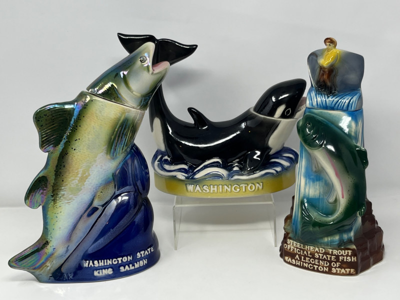 Lot # 90 - 1970s Washington State Wildlife Decanter Trio –Salmon, Steelhead, Orca