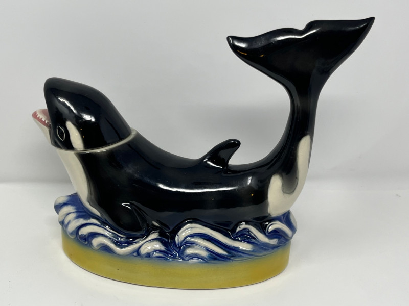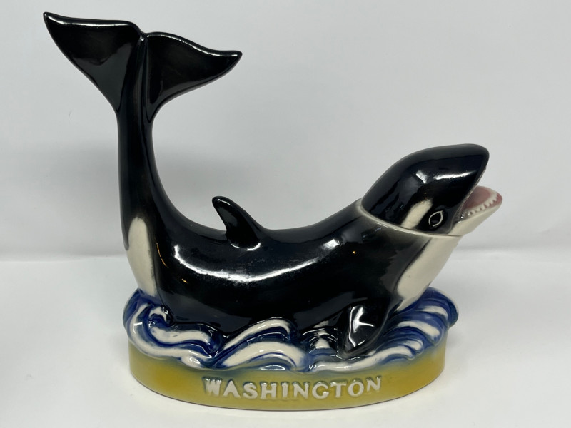 • Orca Whale Decanter – Underside marked “OMB LIQUOR BOTTLE NO. 56 – 1975 – ROYAL HALBURTON CHINA.” Base reads “WASHINGTON.” All three pieces retain vivid paint and crisp molded details. These decanters were originally issued as commemorative liquor bottles and are now prized by collectors of wildlife memorabilia, vintage barware, and Washington State ephemera.