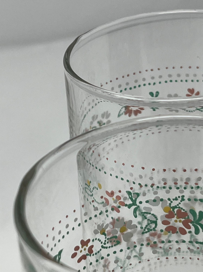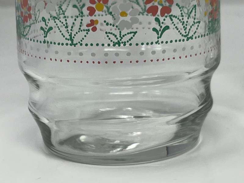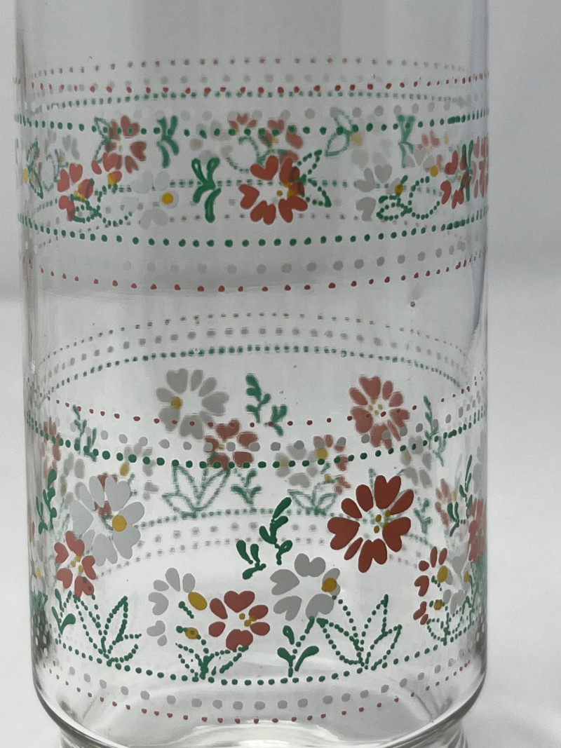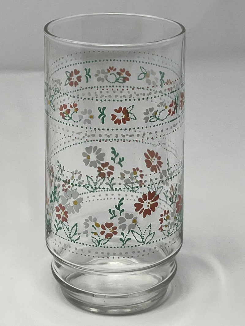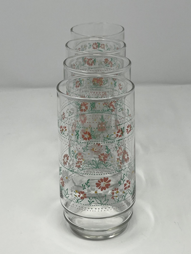 Set of four vintage clear glass tumblers featuring a vibrant floral motif in red, white, and yellow with green leaf accents. Each glass is decorated with a repeating band of stylized blossoms and dotted detailing, typical of mid-century American glassware. The cheerful design and sturdy form make these ideal for daily use or display in a retro kitchen or barware collection. Details: Quantity: 4 glasses Material: Clear glass Design: Floral print with red, white, yellow flowers and green leaves; dotted band encircling each glass Maker: Unmarked, but consistent with Anchor Hocking or Libbey production Era: Circa 1950s–1960s Style: Mid-century casual drinkware Condition: Pre-owned; light surface wear consistent with age and use No chips or cracks noted Notes: