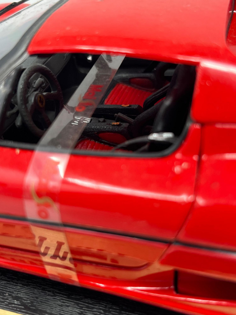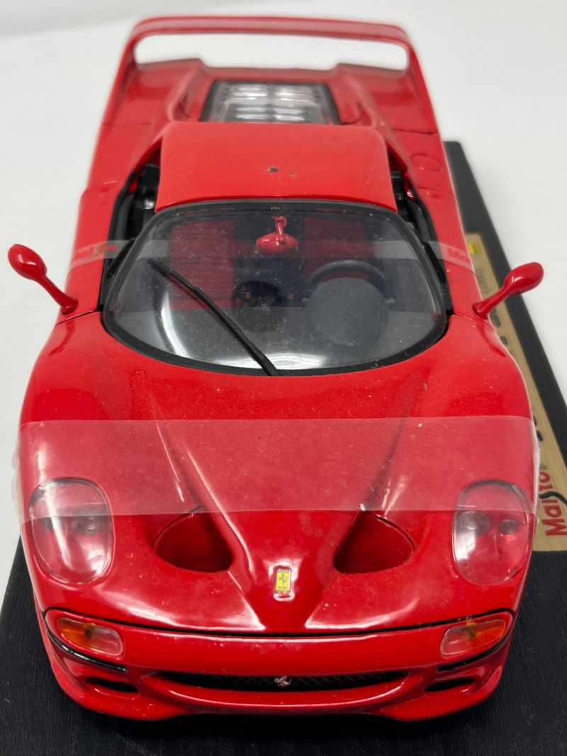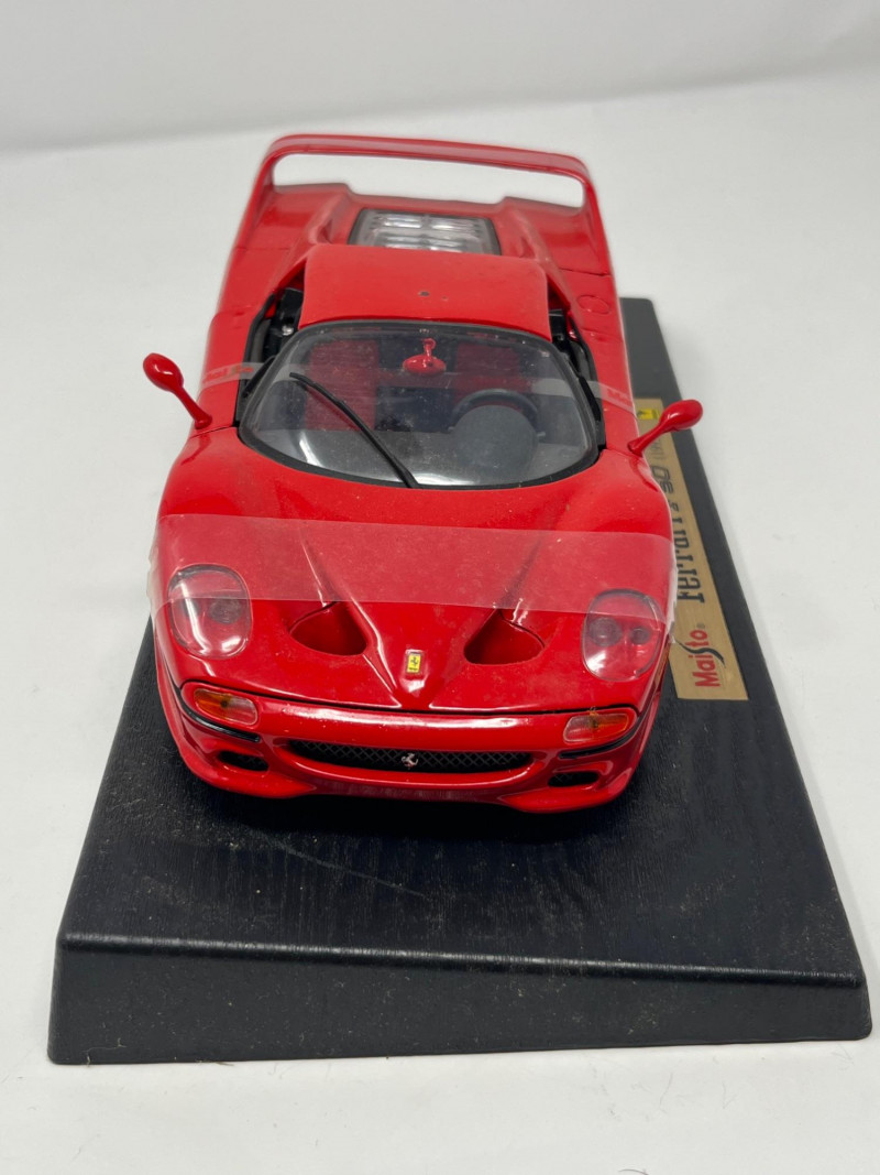Maisto 1:18 scale die‑cast model of the 1995 Ferrari F50, presented on its original black display base with labeled nameplate. Features detailed interior components, molded seats, dashboard, steering wheel, and exterior elements including wheels, headlights, vents, and rear spoiler. Classic bright red finish with strong shelf presence. Details: Manufacturer: Maisto Model: Ferrari F50 (1995) Scale: 1:18 Material: Die‑cast with plastic components Includes: Original display base with nameplate Notes: Original clear factory bands remain in place securing the model to the base Condition: