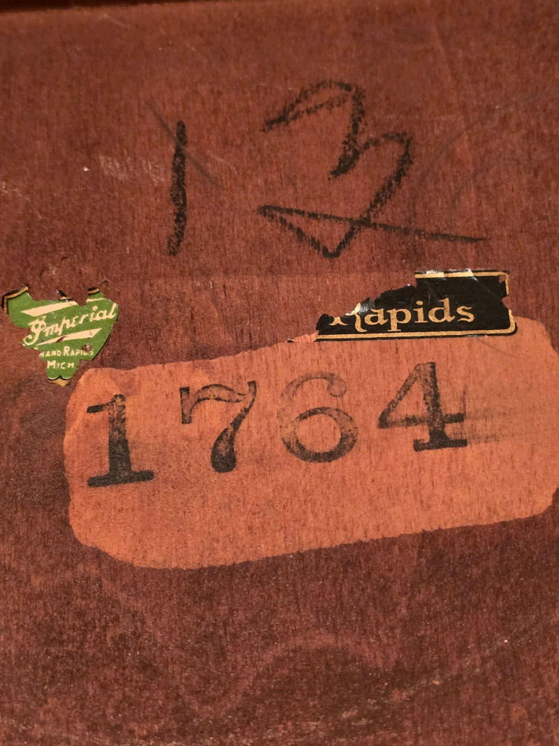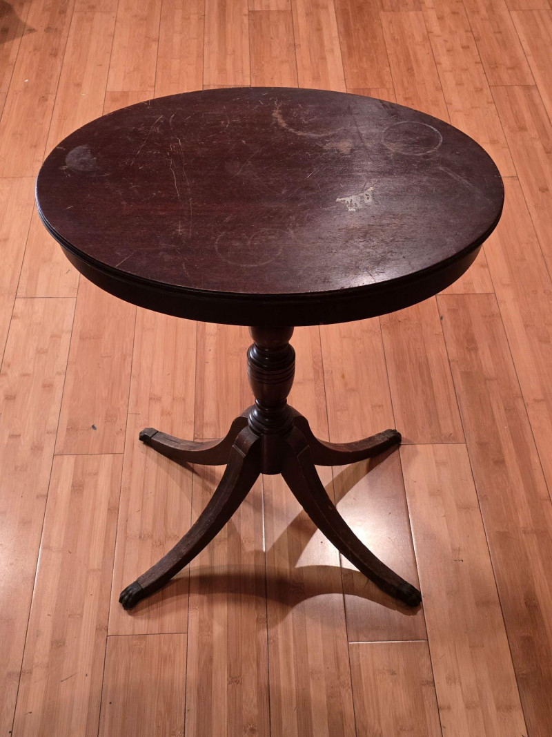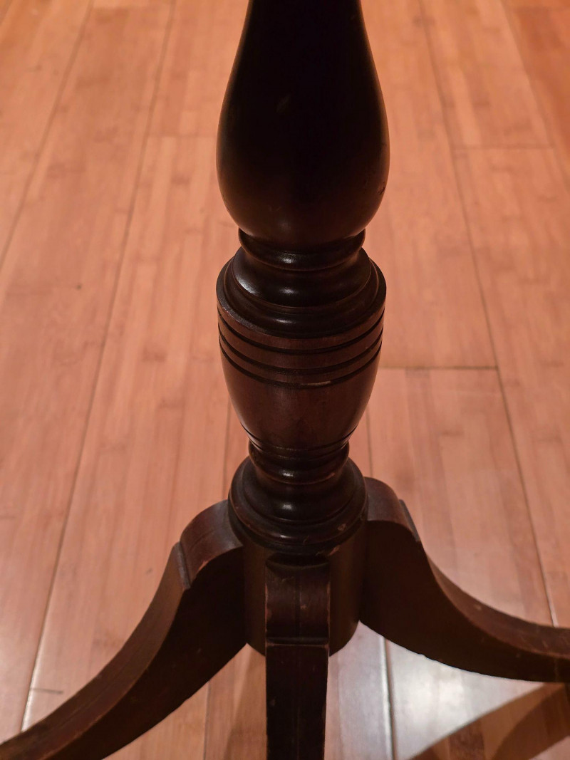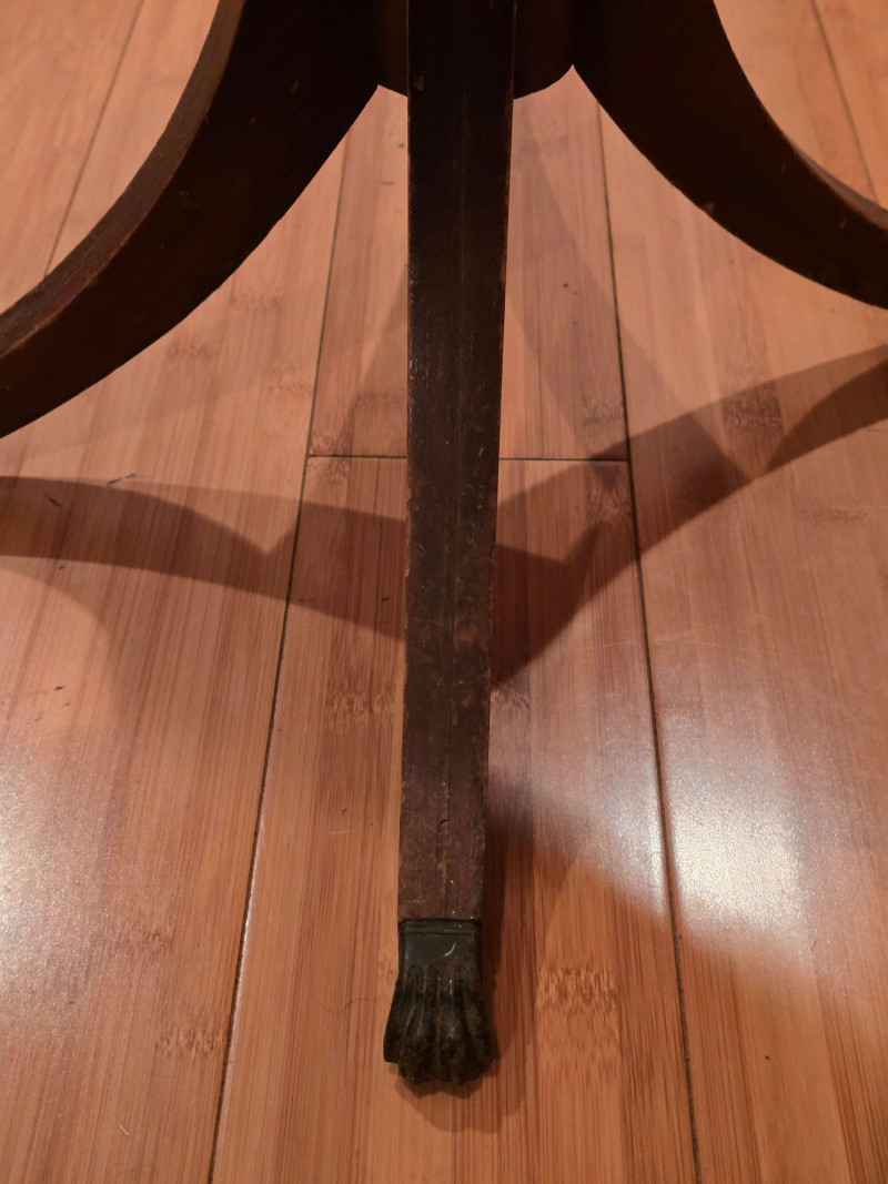 Classic antique mahogany pedestal table attributed to Imperial Furniture Co. of Grand Rapids, Michigan. The underside retains a worn Imperial label, consistent with early 20th‑century production. Features a turned central column, tripod base, and metal‑capped feet. Mahogany construction with warm, aged finish Tripod pedestal base with metal feet Underside shows worn Imperial Grand Rapids label Sturdy and well‑balanced form Ideal as an accent table, lamp table, or display piece Visible surface wear, scratches, and finish loss consistent with age Wear to edges and legs as photographed Metal feet show patina Structurally soundDetails
